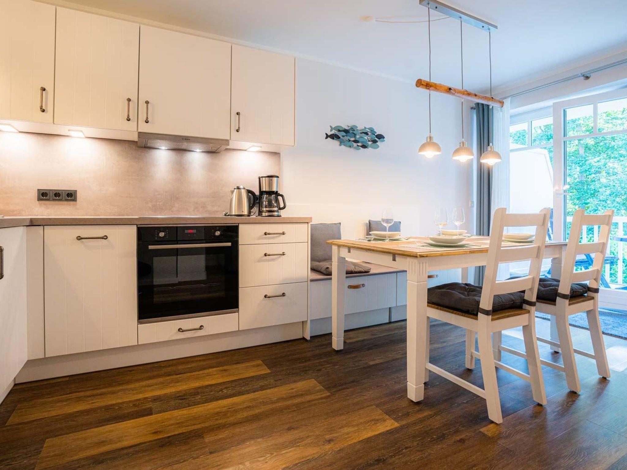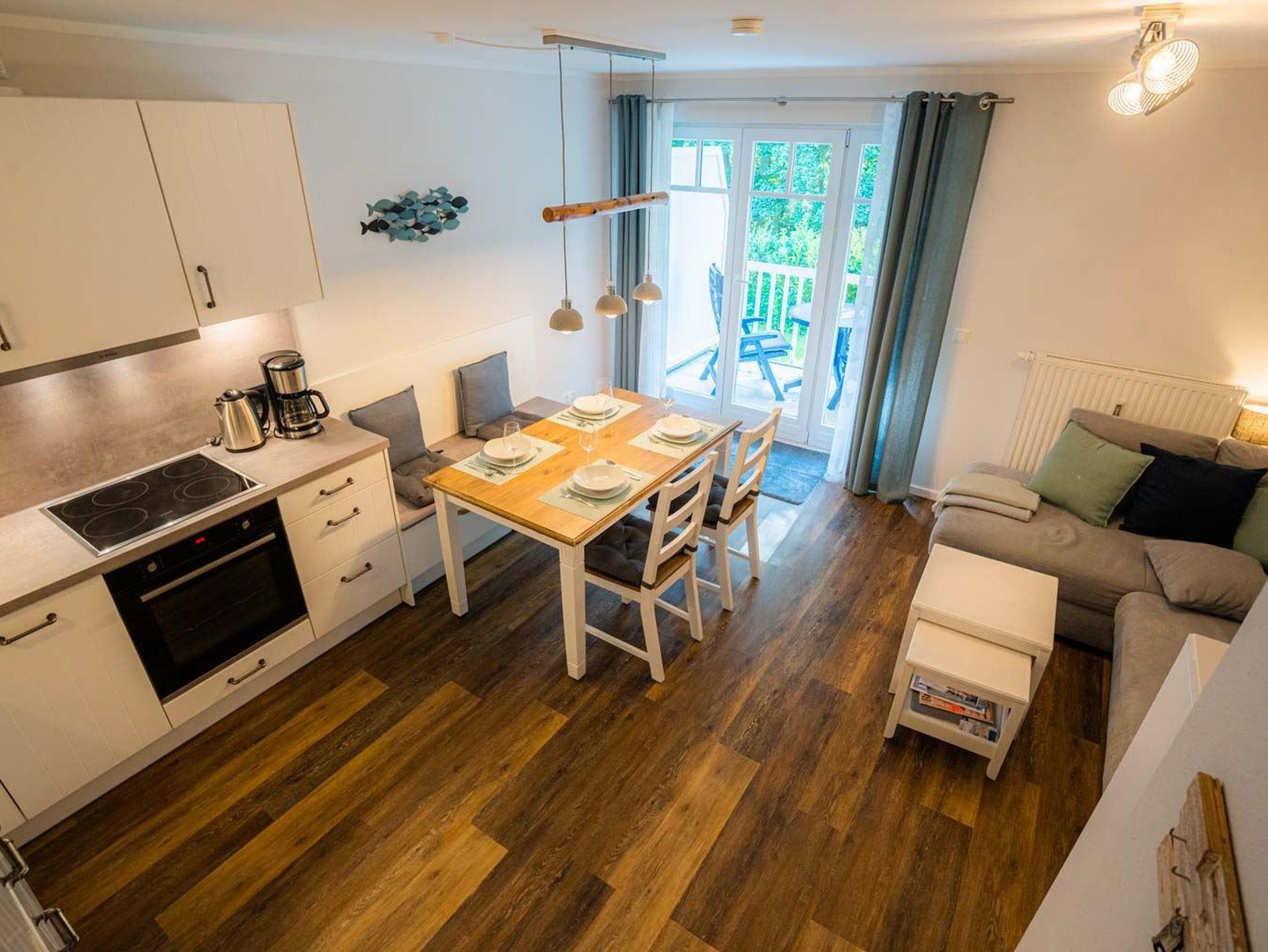 Wohnzimmer mit Ecksofa, großem 4K-Smart-TV (Sat), Esstisch mit 2 Stühlen und gemütlicher Sitzbank für 2 Personen sowie direktem Zugang zum möblierten Balkon nach Süden. Offene Küche mit Backofen, Mikrowelle, Kühl-Gefrier-Kombination, Geschirrspüler und elektrischem Grill für den Balkon.