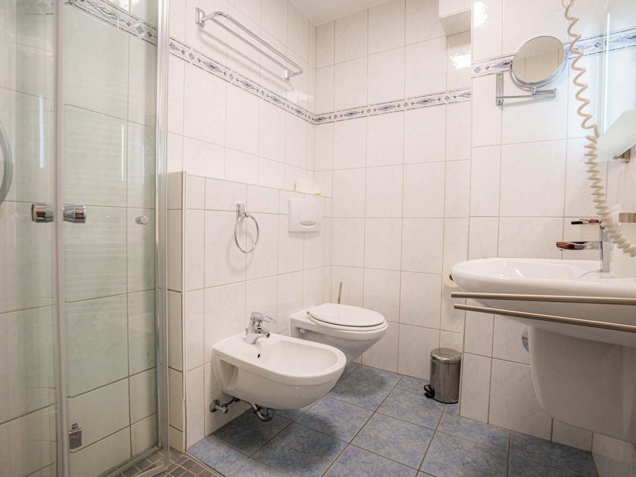 Badezimmer (Duschbad) mit bodengleicher Regen-Dusche, WC, Bidet, Handtuchwärmer und Föhn.