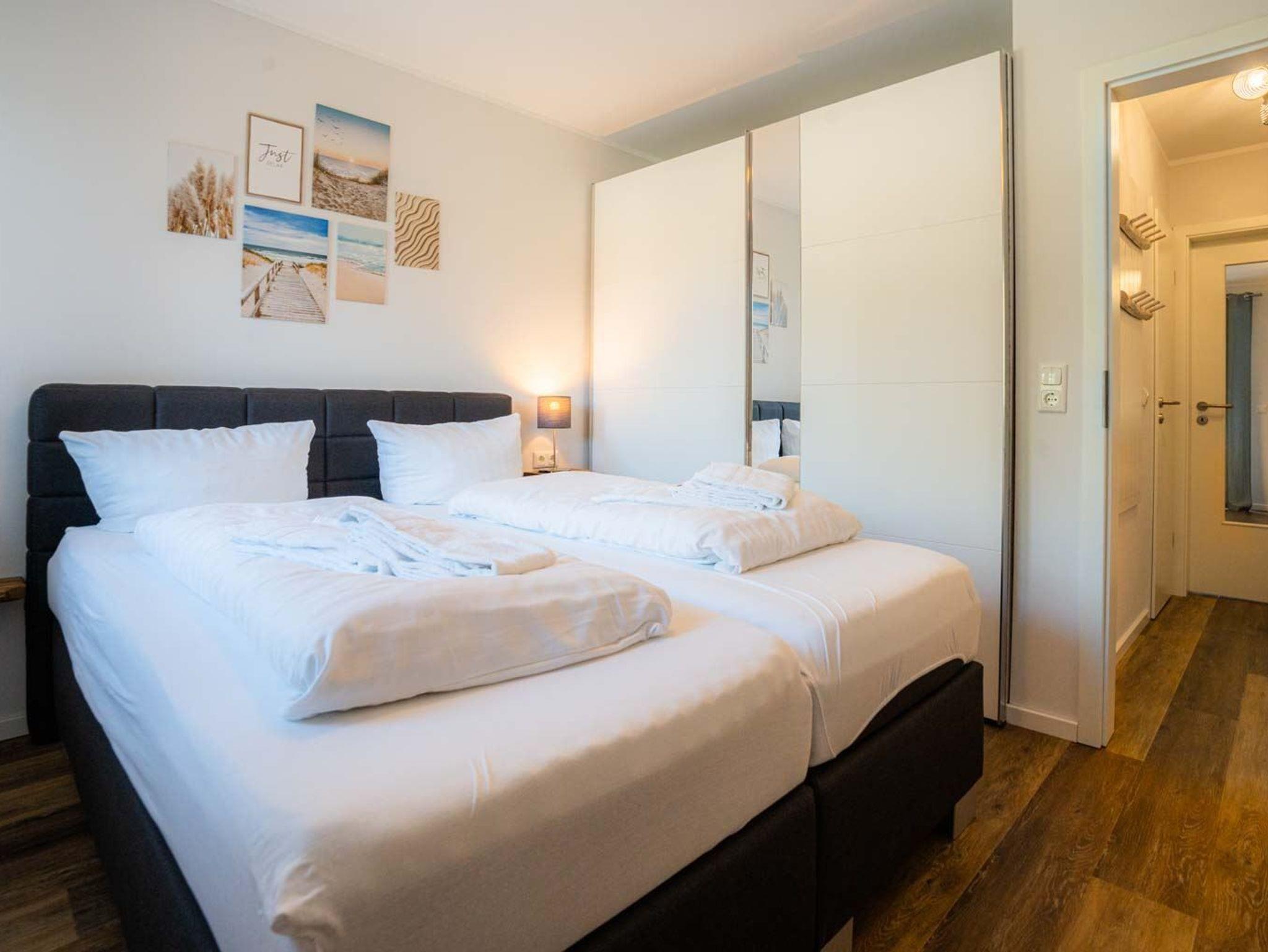1. Schlafzimmer mit Doppelbett (2x 80x200cm), Kleiderschrank mit Spiegel und Stuhl.