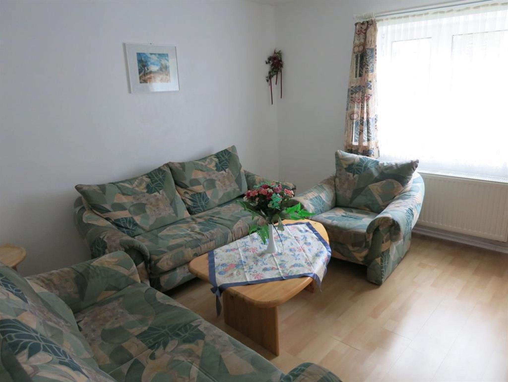 Im geräumigen Wohnzimmer steht eine Couchgarnitur.