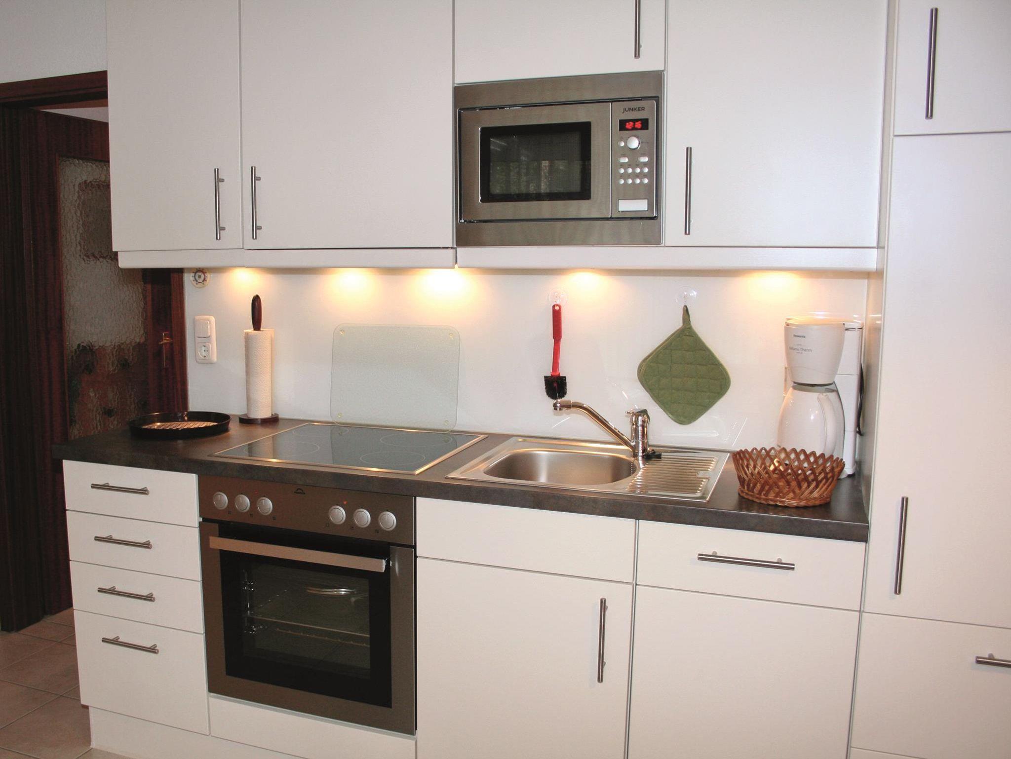 Wohnzimmer: Couch, Couchtisch, 2 Sessel, Nachtspeicherofen, 2 Wandlampen, TV-Schrank, Kabel-TV, CD-Stereoanlage mit USB-,iPod-u. iPhoneanschluß, 2 Einzelschrankbetten, Regalschrank, Esstisch, 2 Stühle, 2 Klappstühle, Küchenzeile mit Cerankochfeld, Backofen, Spülmaschine, Dunstabzugshaube, Kühlschrank, Mikrowelle, Wasserkocher, Kaffeemaschine, Handrührgerät, Toaster, Mixstab, Geschirr, Kochtöpfe
