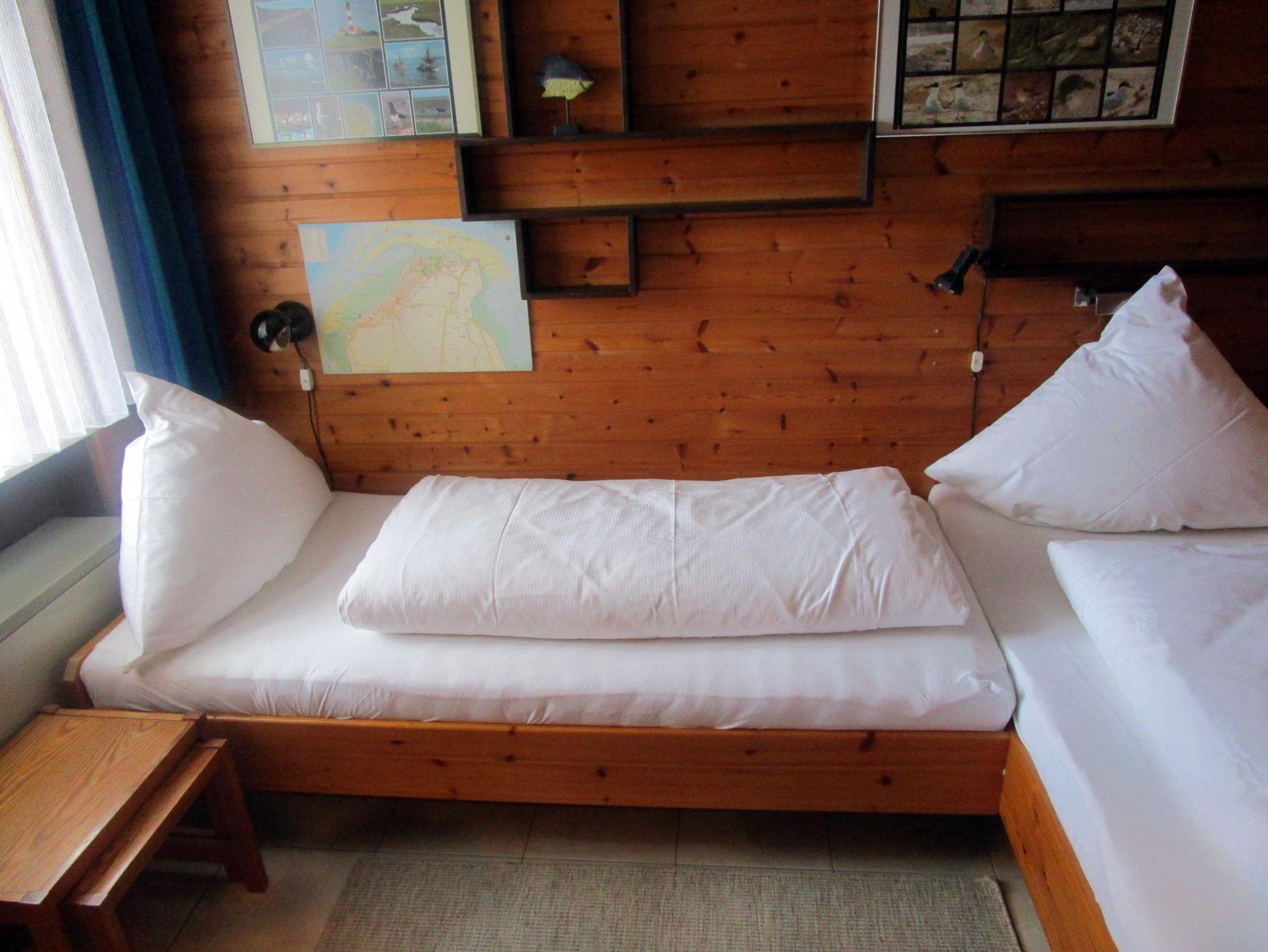 Schlafzimmer: 2 Einzelbetten, Ablage, Beistelltisch, Nachtspeicherofen, Kleiderschrank, 2 Klappstühle, Spiegel