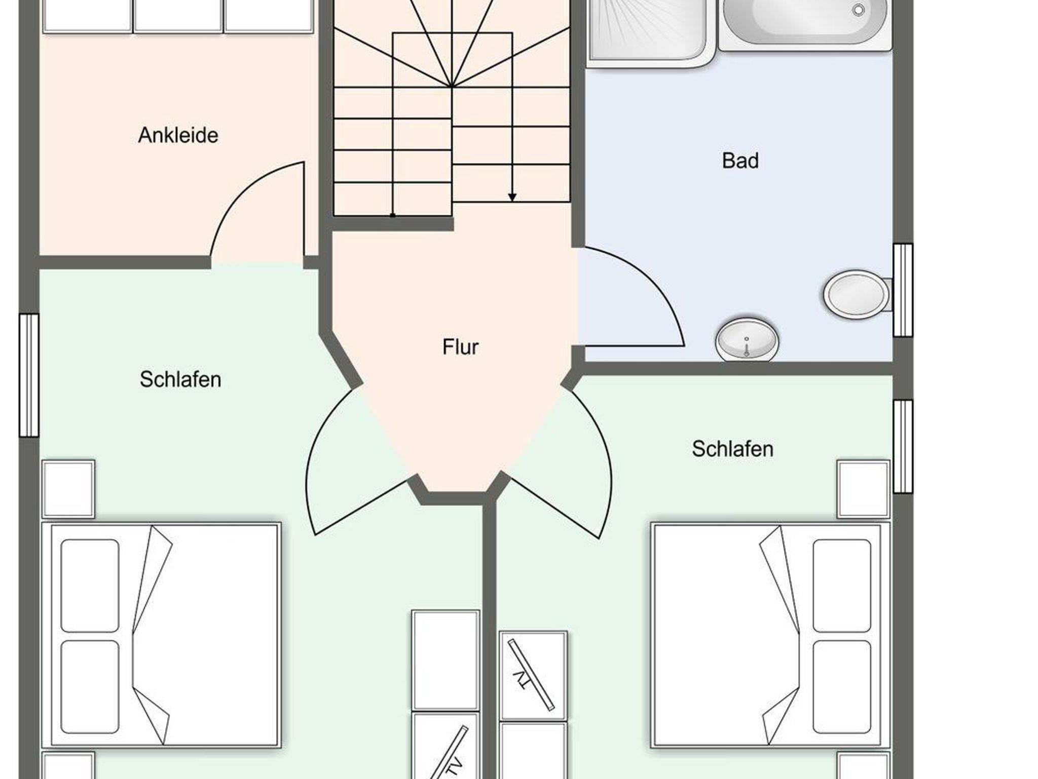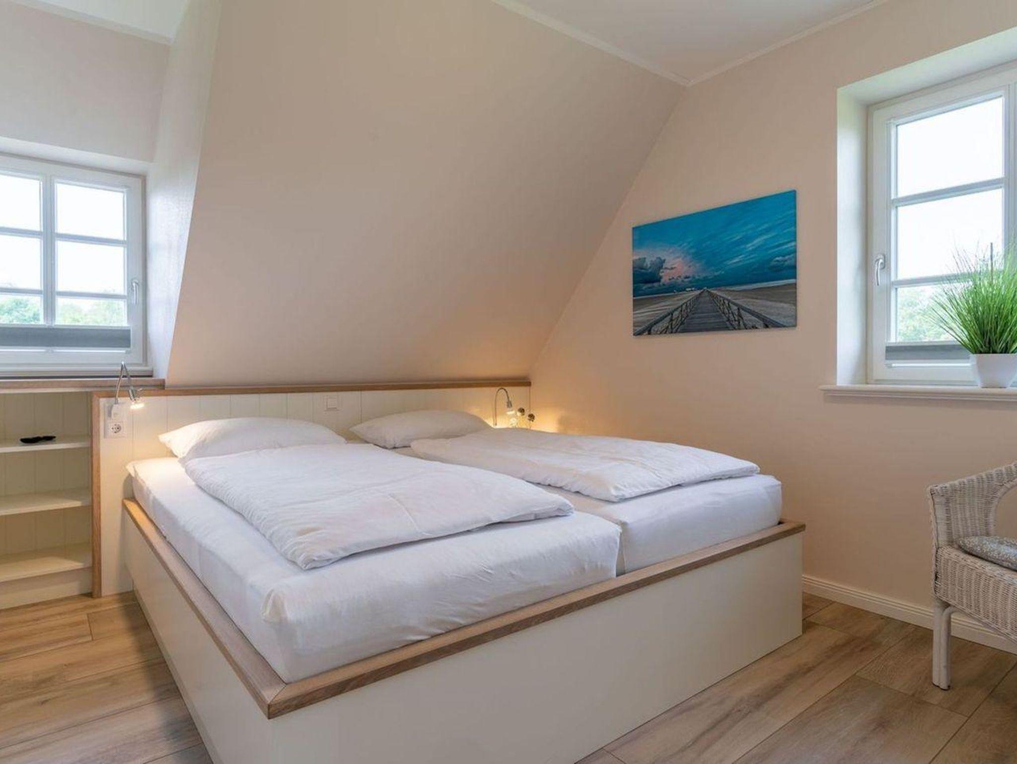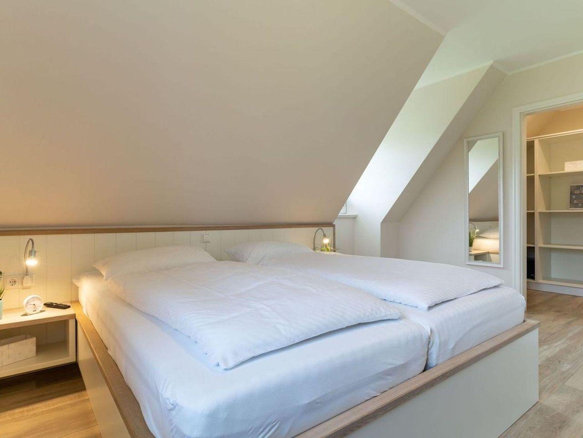 Über eine Holztreppe gelangt man in das Obergeschoss. Die beiden Schlafzimmer, jeweils mit einem Doppelbett sorgen für ruhevolle Erholung. Einbauschränke gewähren Ihnen hinreichend Ablageflächen.