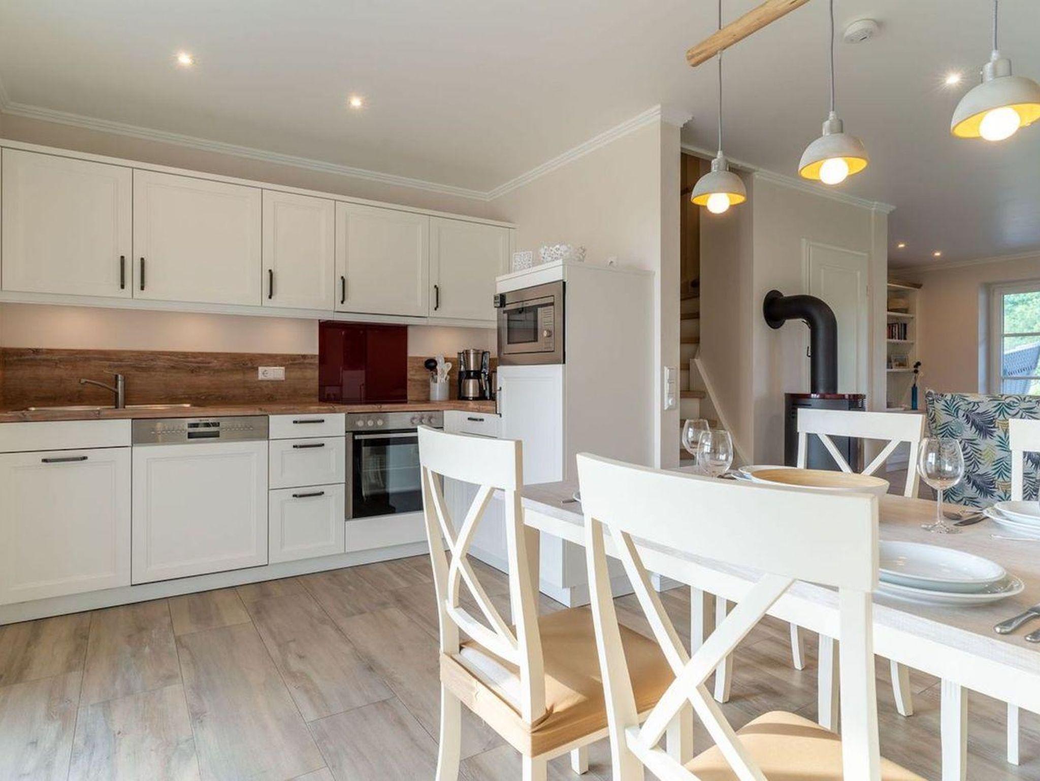 Im Erdgeschoss befindet sich der lichtdurchflutete Wohnraum mit TV, Kamin, einer offenen Küche sowie einem stilvollen Essbereich.