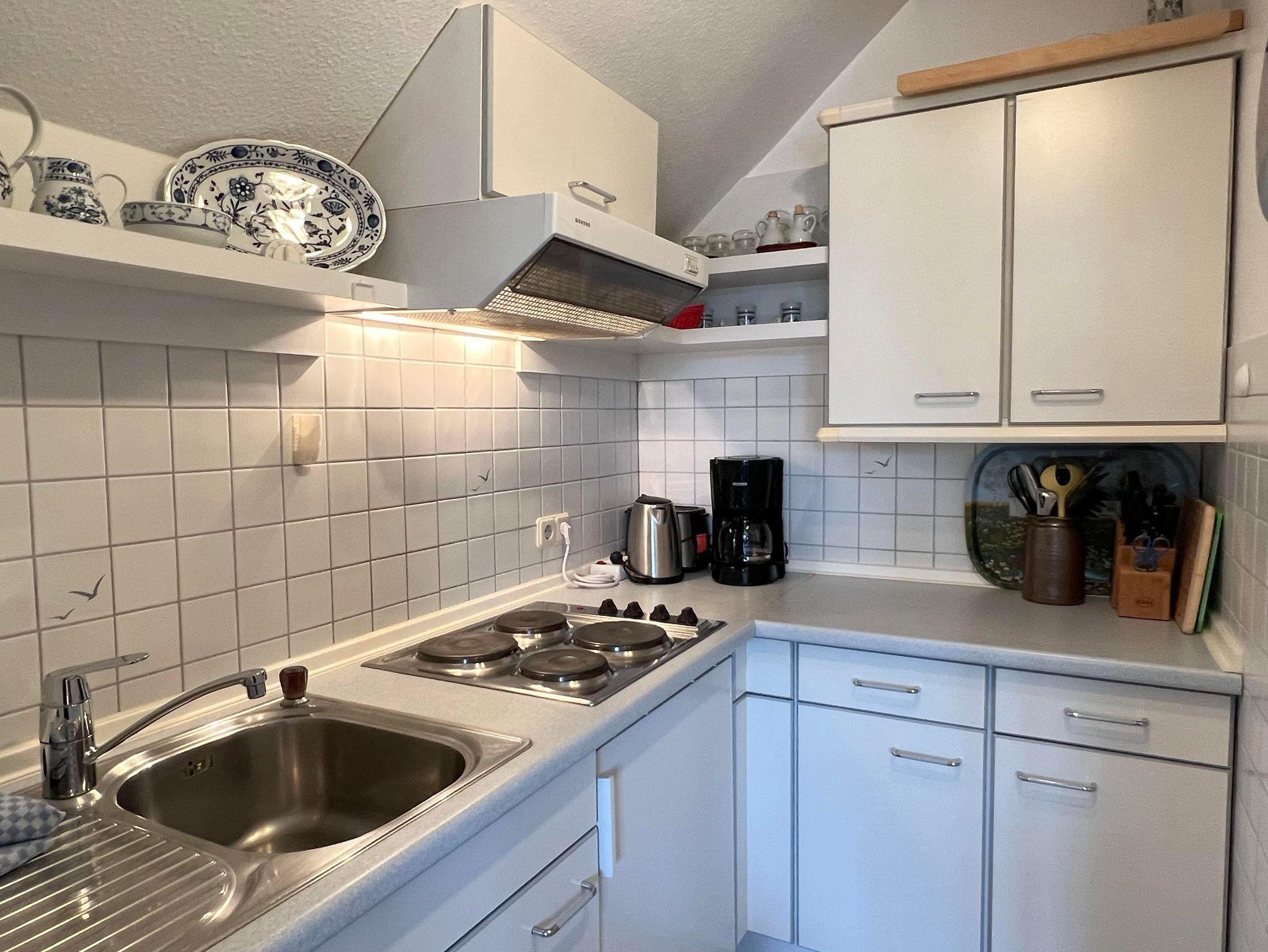 Küche: Einbauküche, 4 Plattenherd, Dunstabzugshaube, Kühlschrank, Spülmaschine, Kaffeemaschine, Wasserkocher, Toaster, Brotmaschine, Handmixer, Geschirr, Kochtöpfe