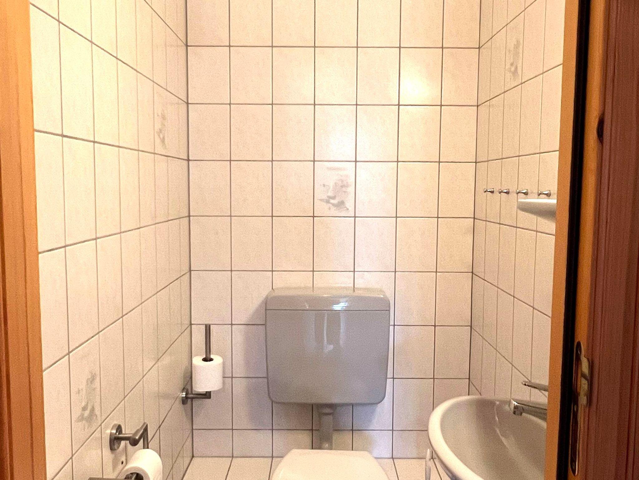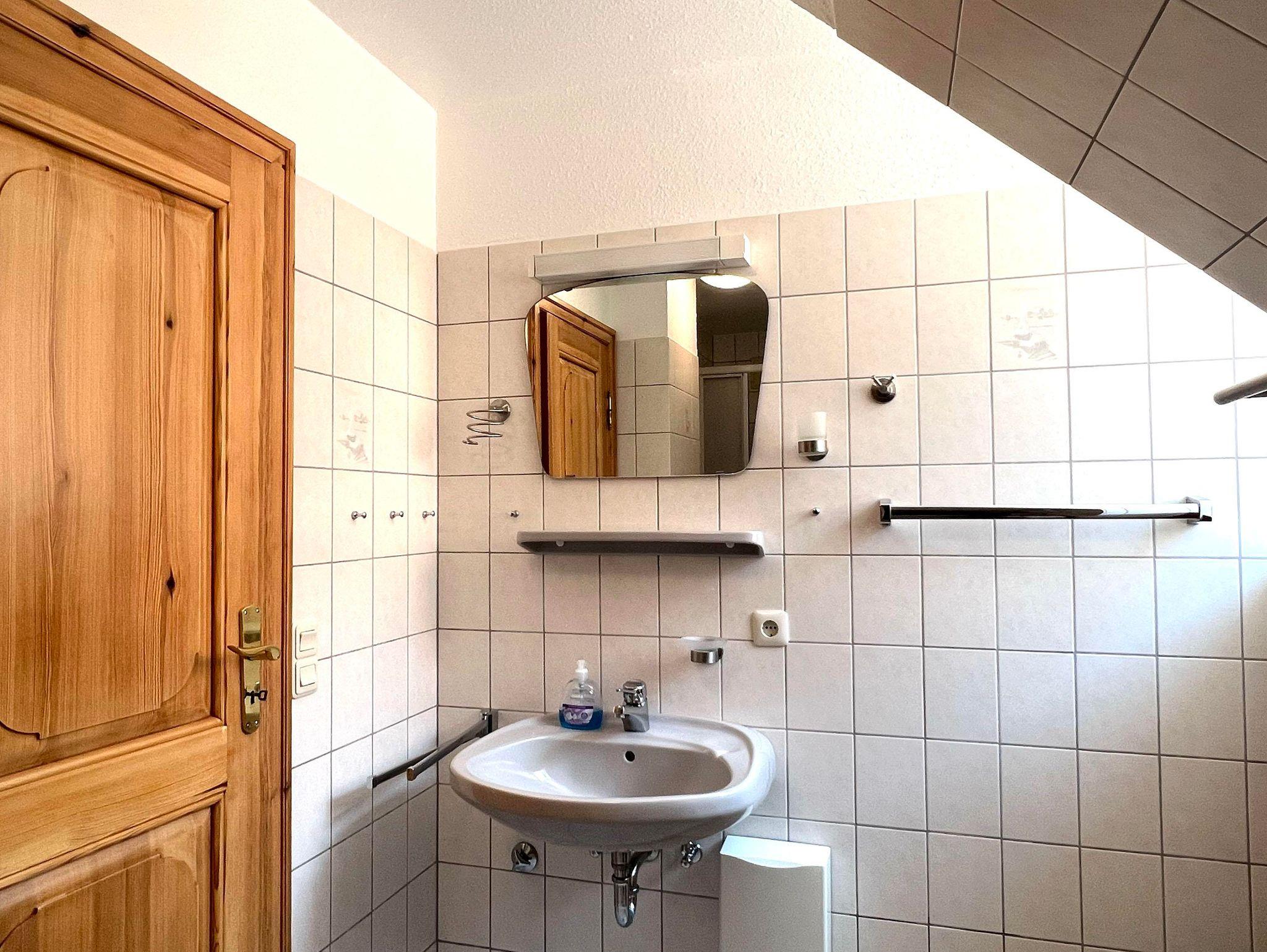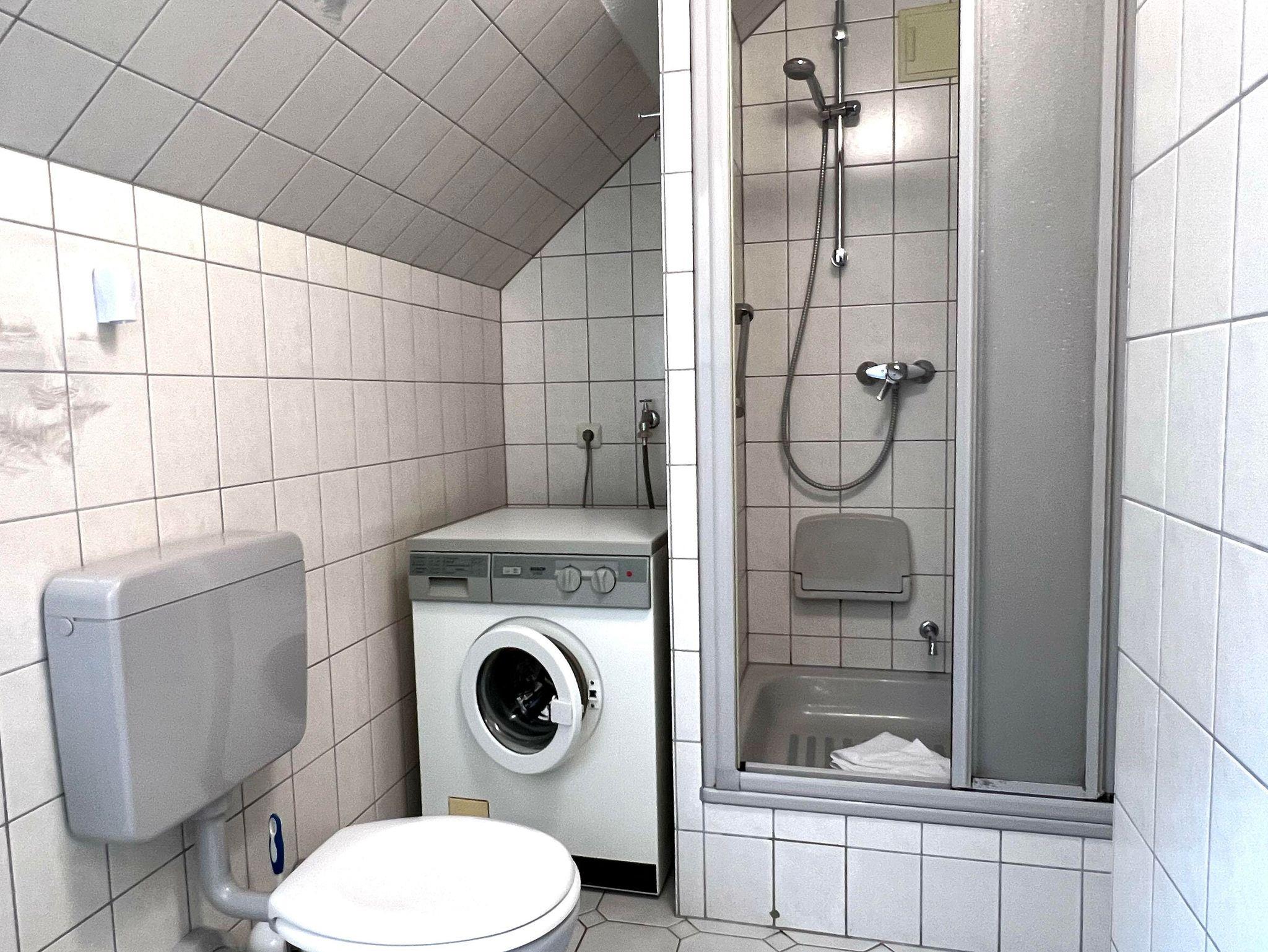 Bad: Dusche, Waschbecken, WC, Waschmaschine, Regal, Duschkabine, Duschklappsitz