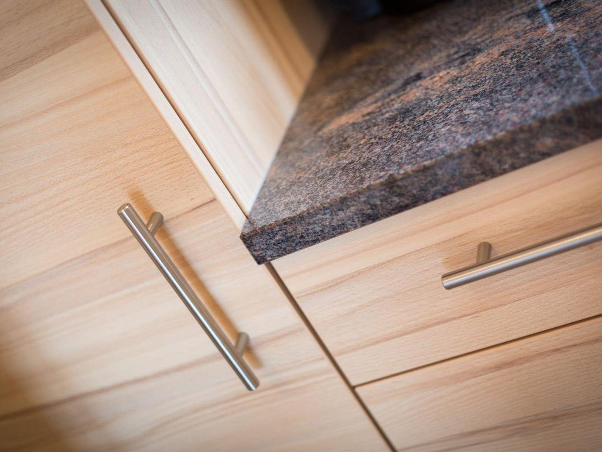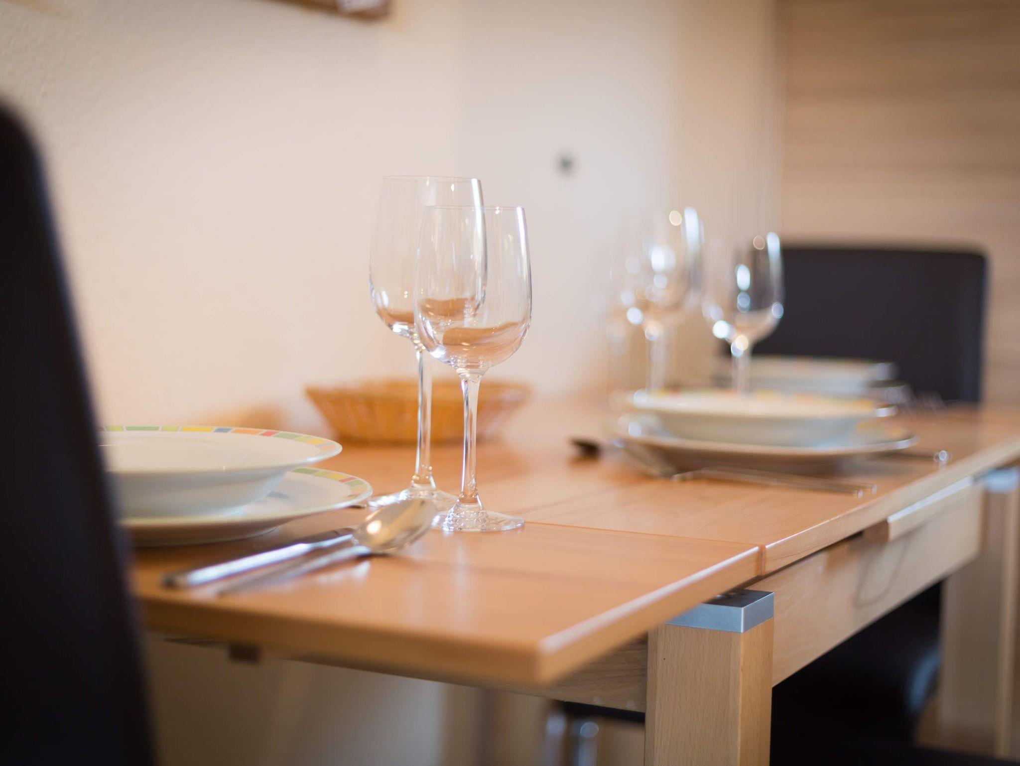 • Offene Küche mit Mikrowelle, Geschirrspüler, Bosch Tassimo Kapsel-Kaffeemaschine, Esstisch mit 4 Stühlen. Die Wohnung hat kein Backofen.