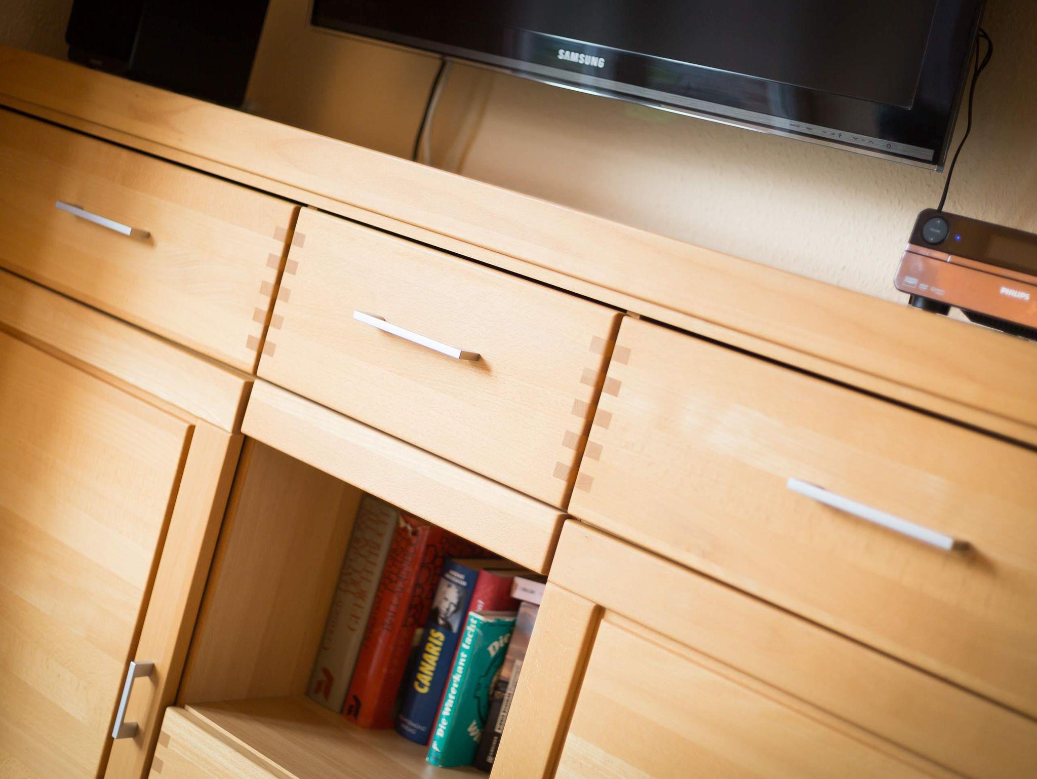 • Ein Schlafzimmer mit Doppelbett (2x90x200cm), großem Einbauschrank und großen TV.