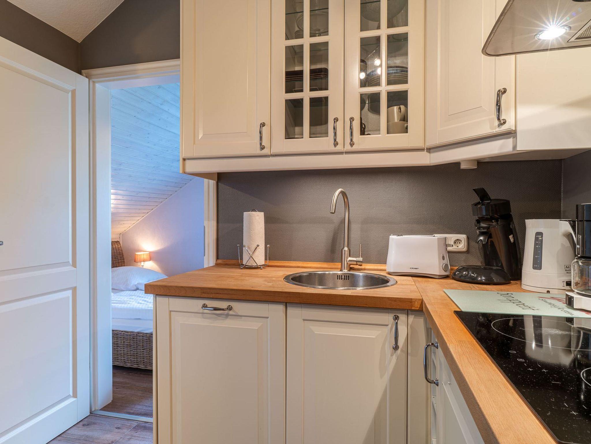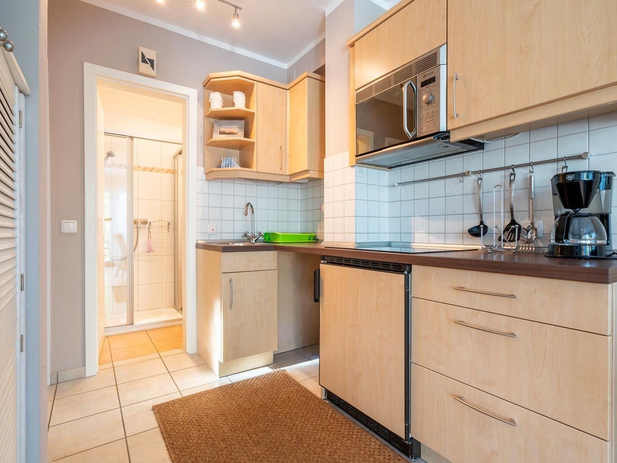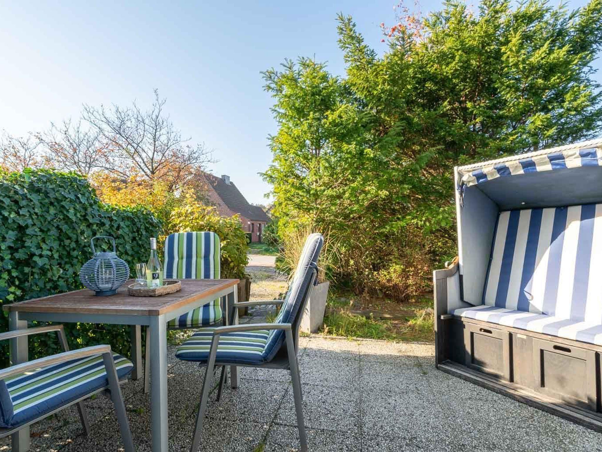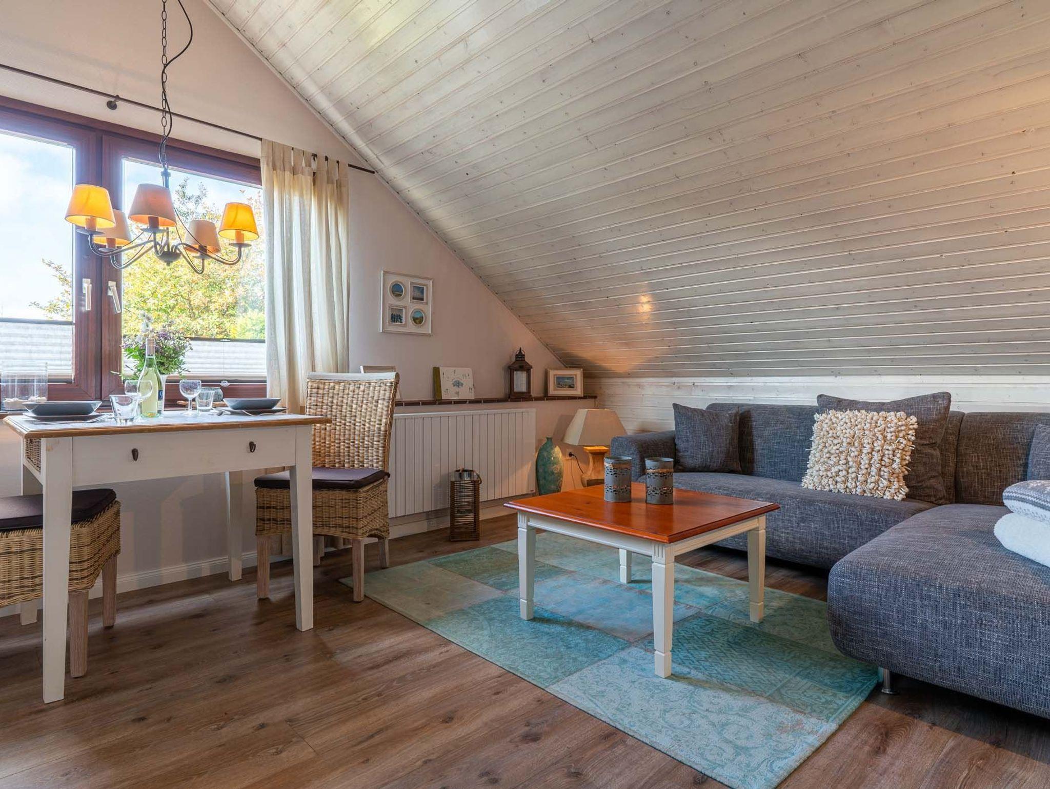 Wohnzimmer mit großem Schlaf-Ecksofa, TV, Stereoanlage, Essplatz und offener Küche mit Mikrowelle (mit Grill). Zugang zur Südwest-Terrasse mit Strandkorb. Schlafzimmer mit Doppelbett, modernes Duschbad mit niedrigem Einstieg, Pkw-Stellplatz am Haus.