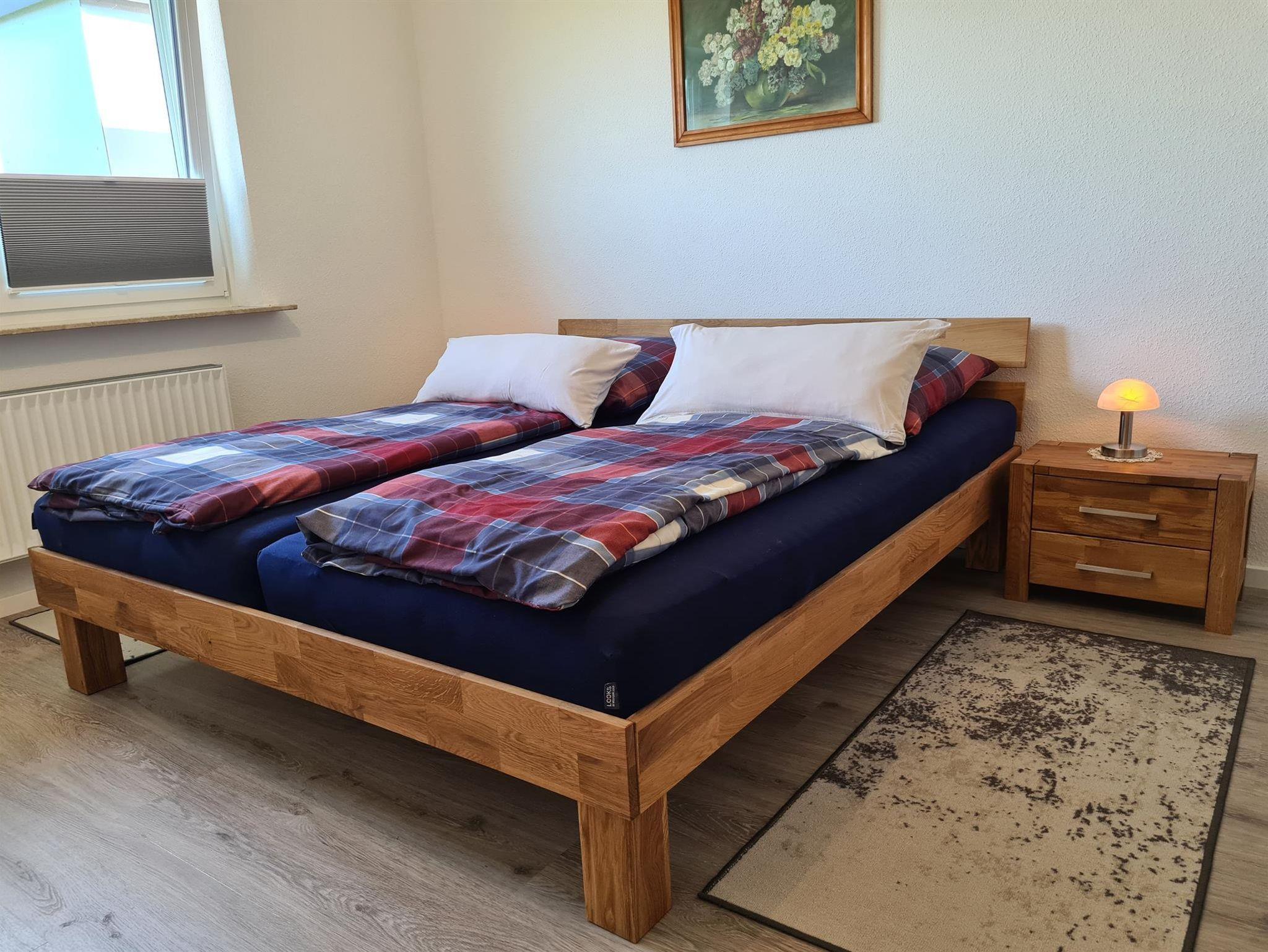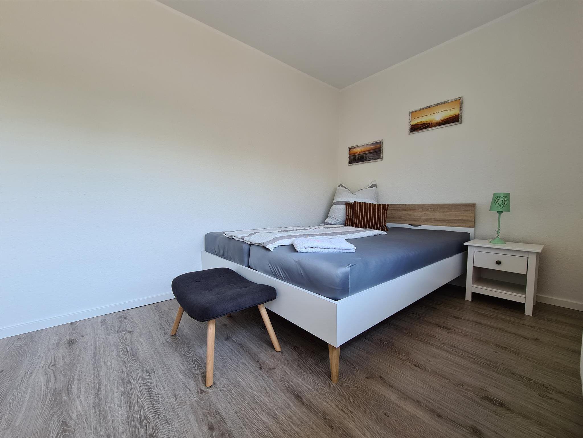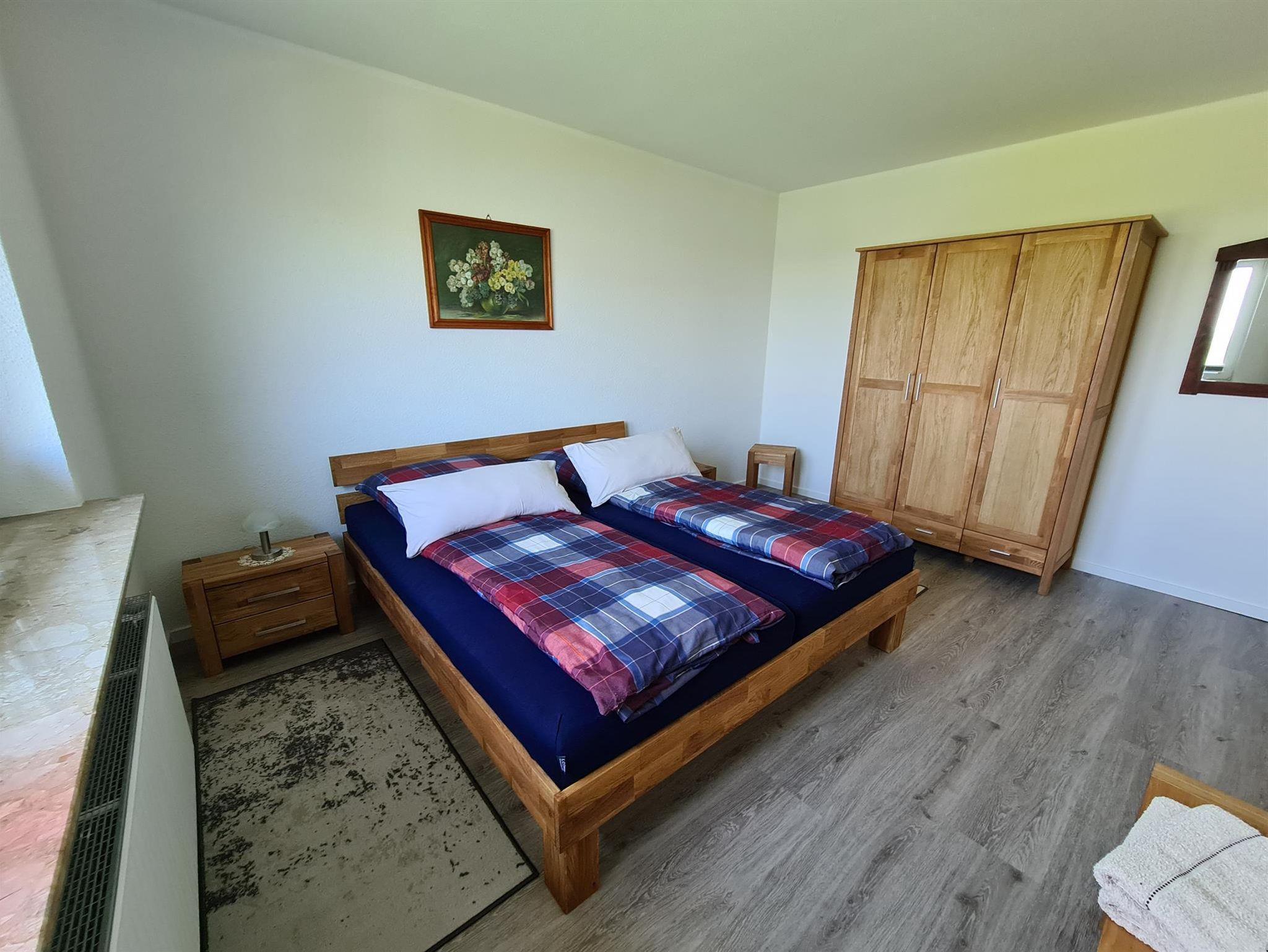 Schlafzimmer mit einem französichen Bett für eine Person