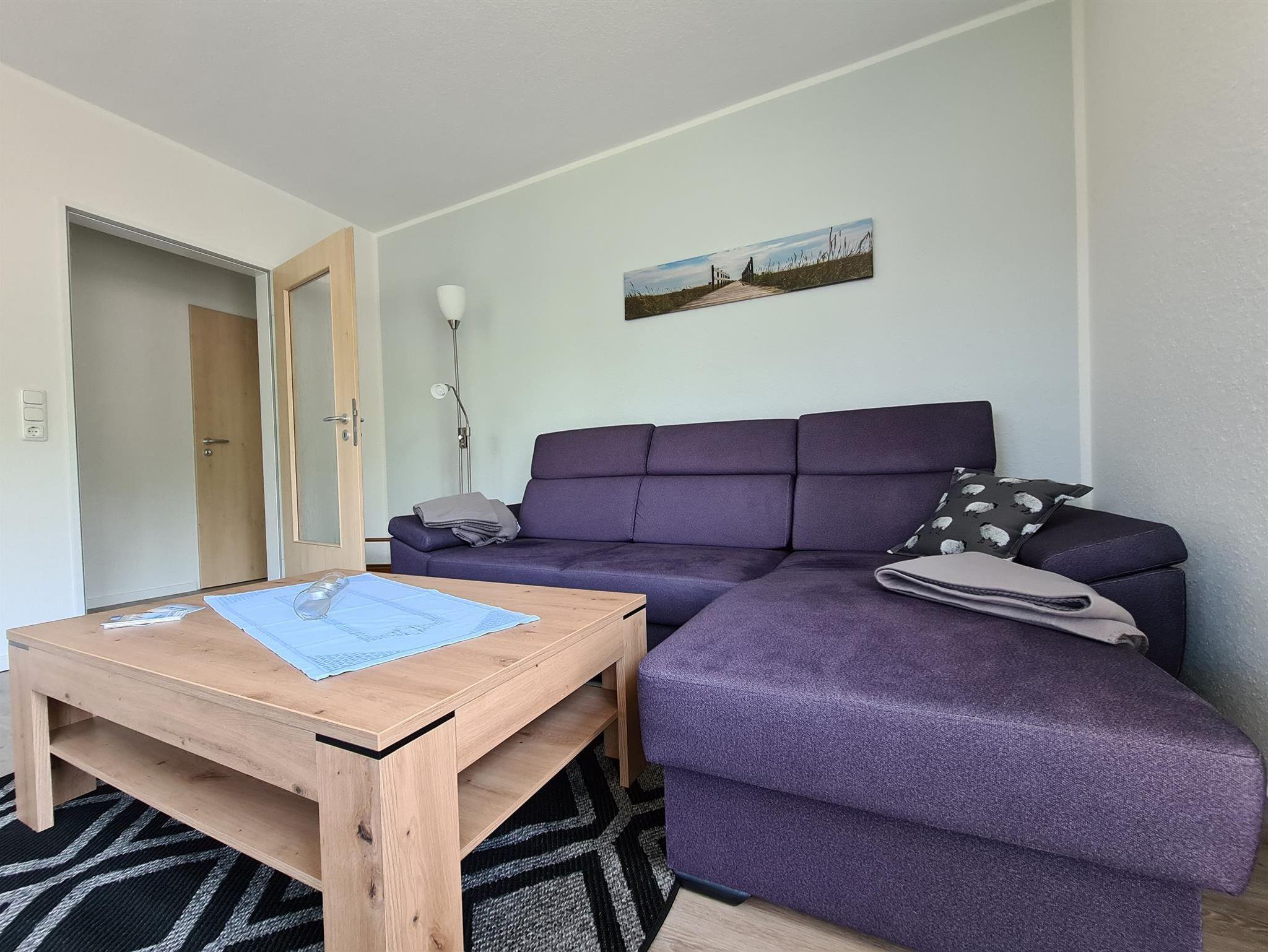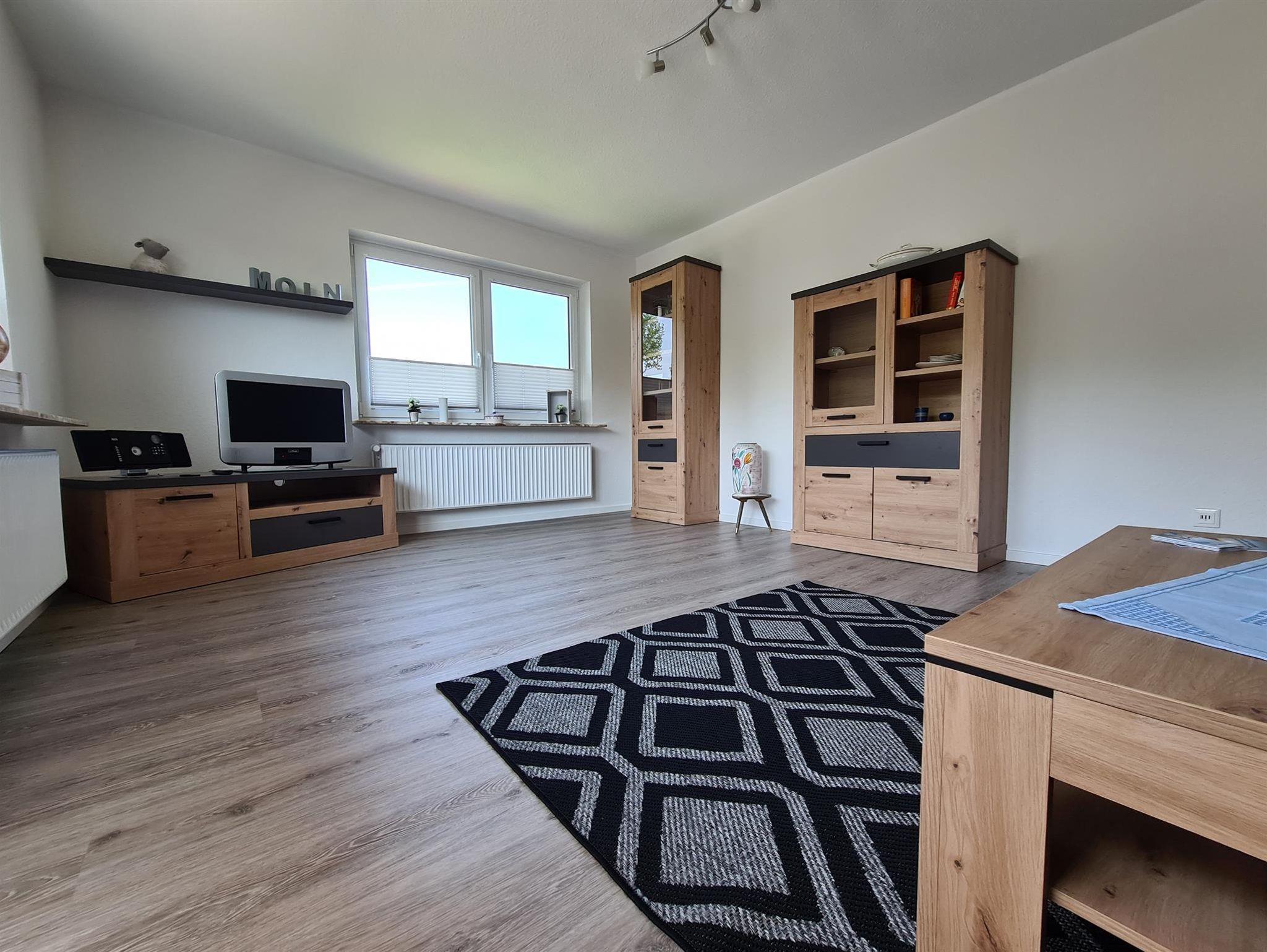 großer Wohnbereich mit SAT-TV, Zugang zum Balkon