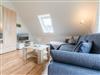 Wohnzimmer mit großem Sofa, das zum Schlafsofa (140x190cm) ausziehbar ist, Kleiderschrank, TV und Esstisch mit 3 Stühlen. Direkter Zugang zum möblierten Balkon nach Nordosten.