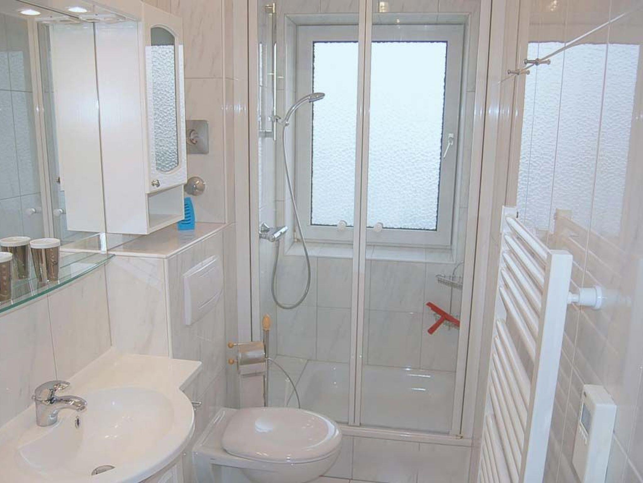 Bad: Dusche, Duschkabine, Fön, Schrank, Spiegel, Waschtisch, WC