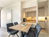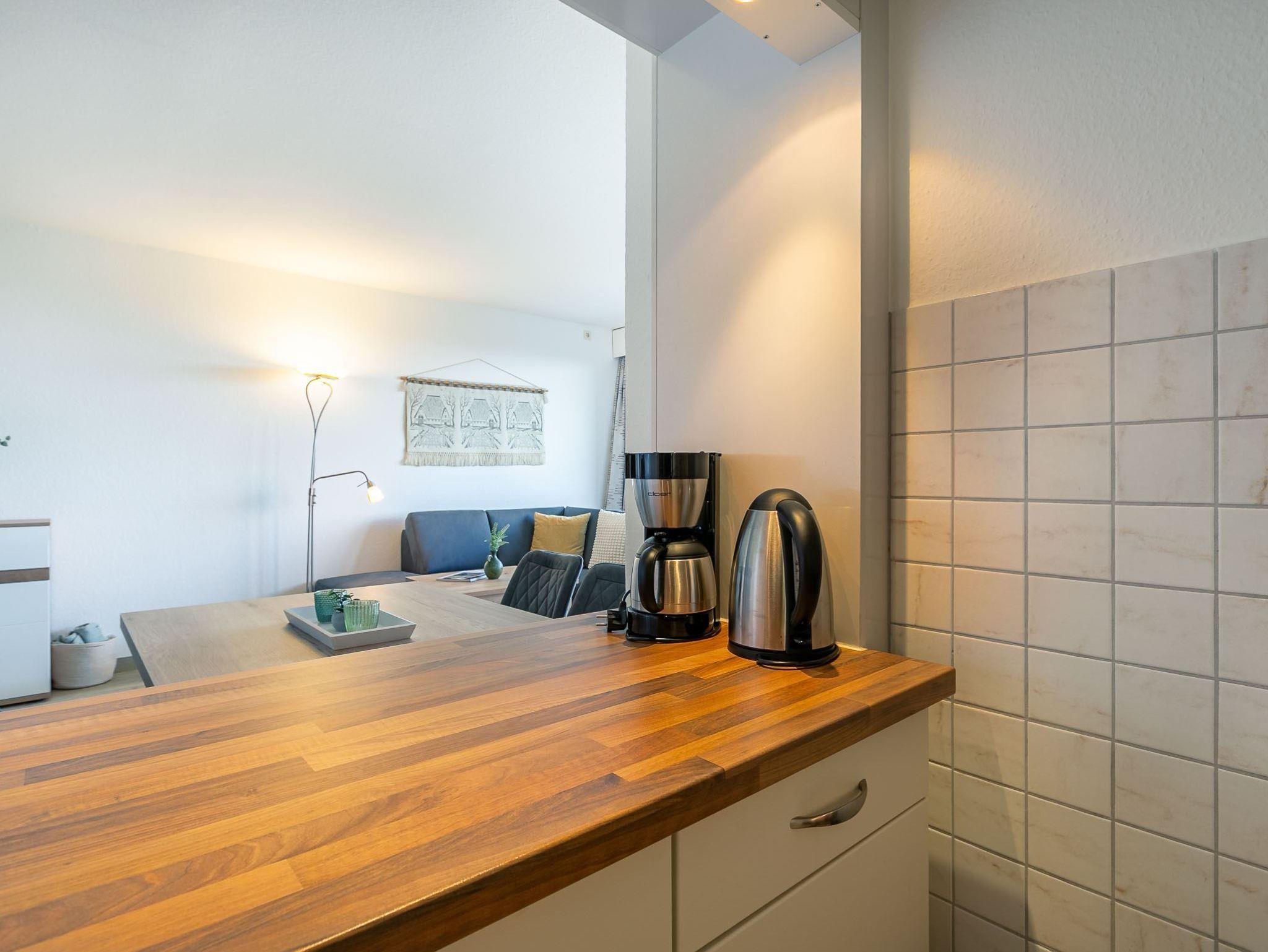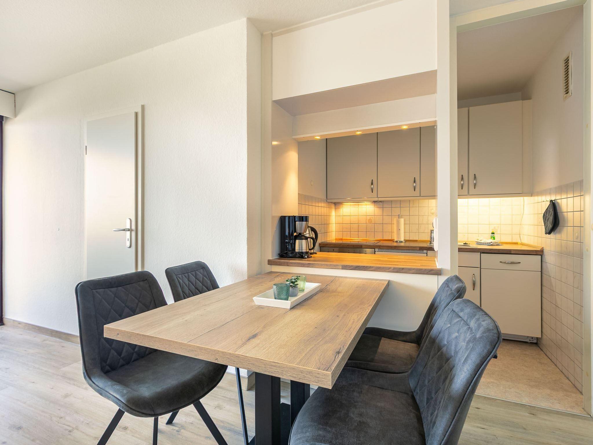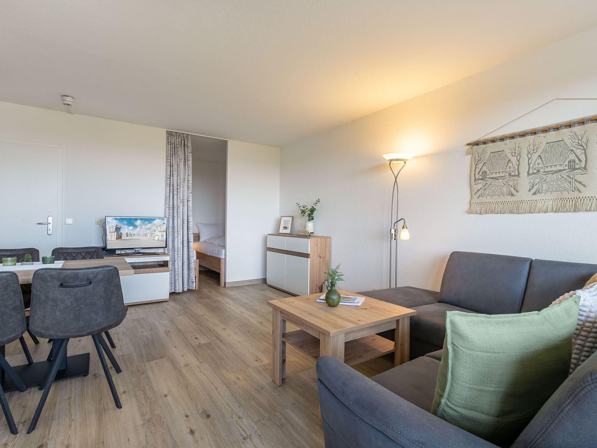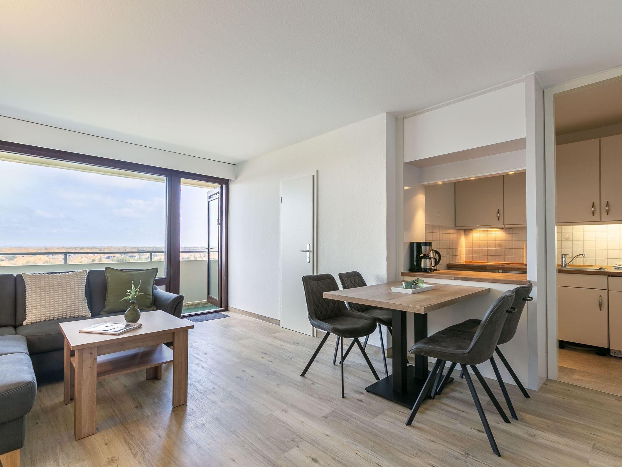 Wohnzimmer mit Ecksofa, TV (Sat) und Esstisch für 4 Personen. Direkter Zugang zum möblierten Balkon nach Südosten. Halboffene Küche mit Backofen, Geschirrspüler und Kühlschrank mit Gefrierfach.