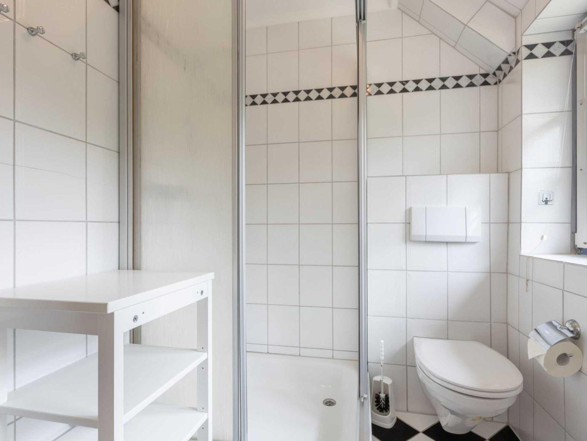 Badezimmer (Duschbad) mit Dusche, WC, Tageslicht und Föhn.