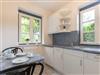 Separate Küche mit Backofen, Mikrowelle, Geschirrspüler und Kühlschrank mit Gefrierfach.