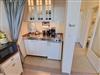 Die Küchenzeile ist mit Microwelle inklusive Backofenfunktion, 2-Plattenkochfeld und Kühlschrank gut ausgestattet – sie bildet eine eigene kleine Nische.