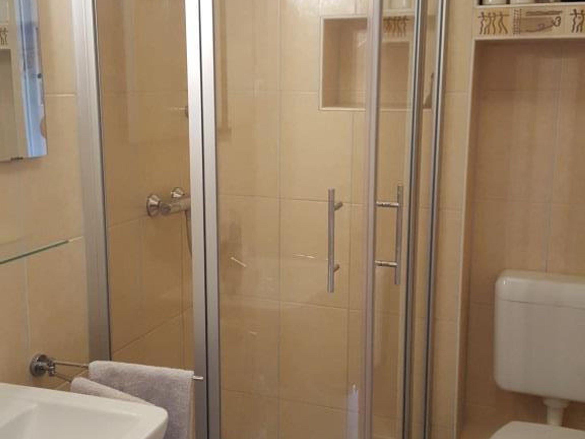 Ausstattung des Badezimmers: Dusche mit Duschwand und extra großem Brausekopf, Kleenex, Seife, Toilettenpapier, Fön