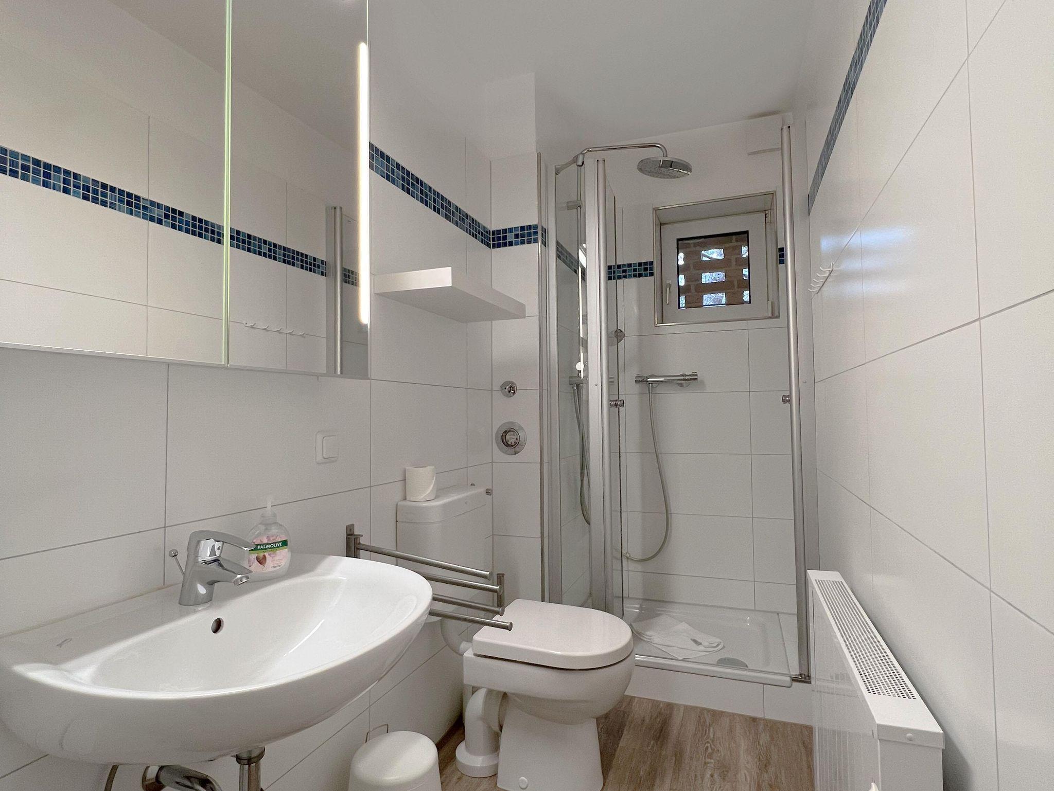 Bad: Dusche, Waschbecken, WC, Spiegel, Duschkabine