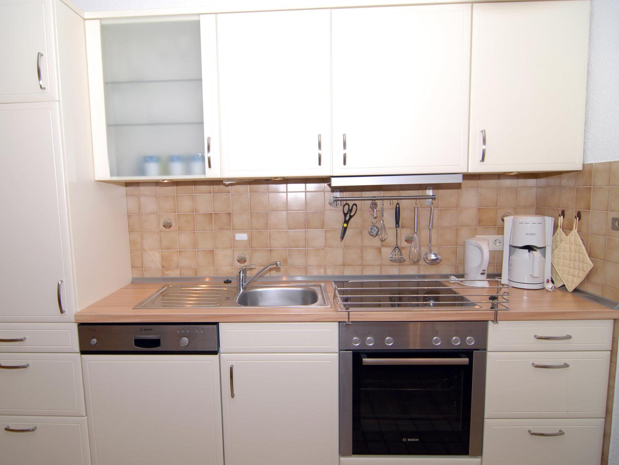 Wohnzimmer: Couch, Couchtisch, 2 Sessel, 2 Stehlampen, JAWO Elektro Direktheizung, TV-Schrank, Schrankdoppelbett, Kleiderschrank, Kabel-TV, Flachbildschirm, Stereoanlage, Esstisch, 4 Stühle, Küchenzeile, 4 Plattenherd mit Ceranfeld und Backofen, Dunstabzugshaube, Kühlschrank, Spülmaschine, Kaffeemaschine, Wasserkocher, Toaster, Geschirr, Kochtöpfe