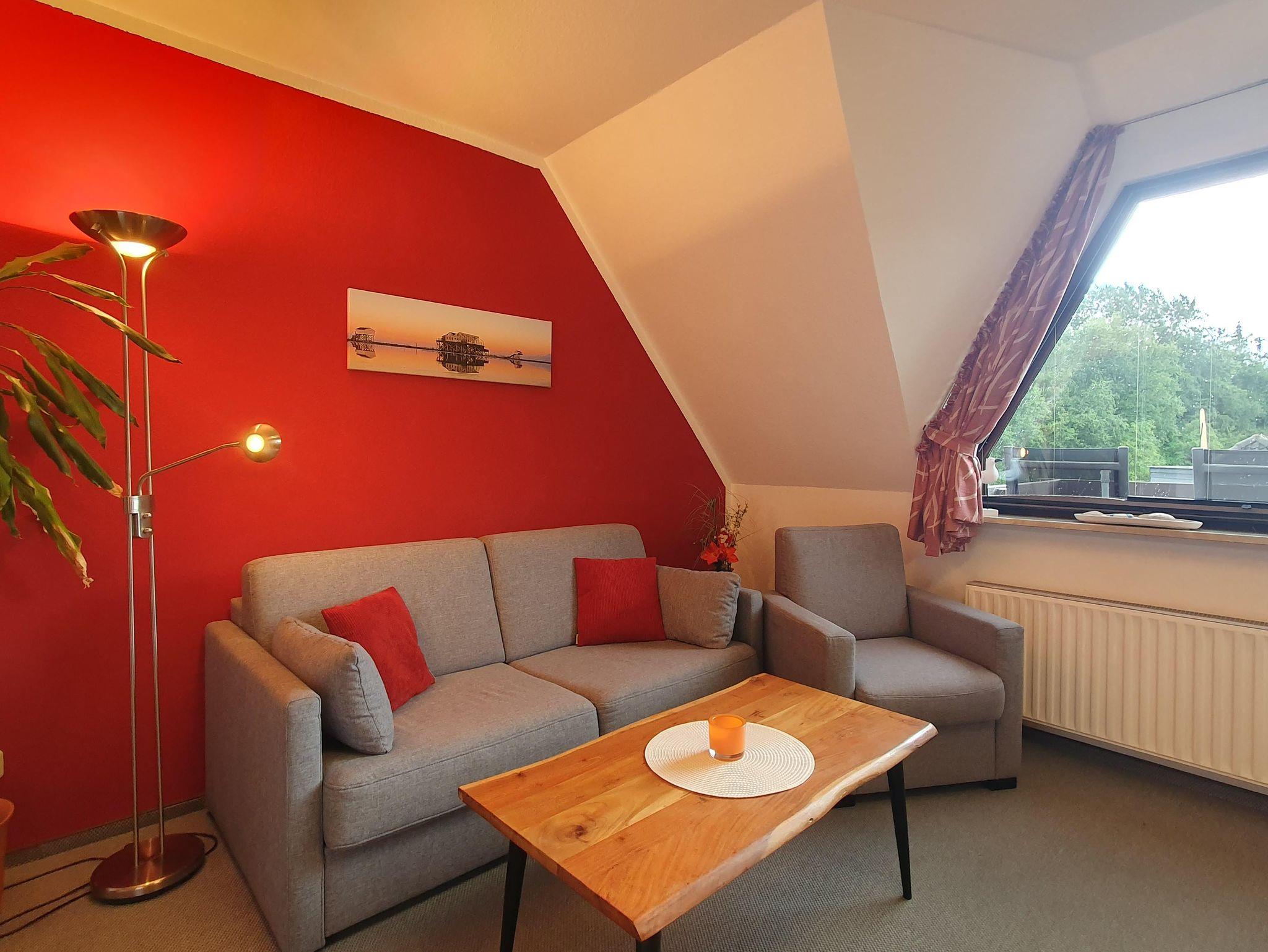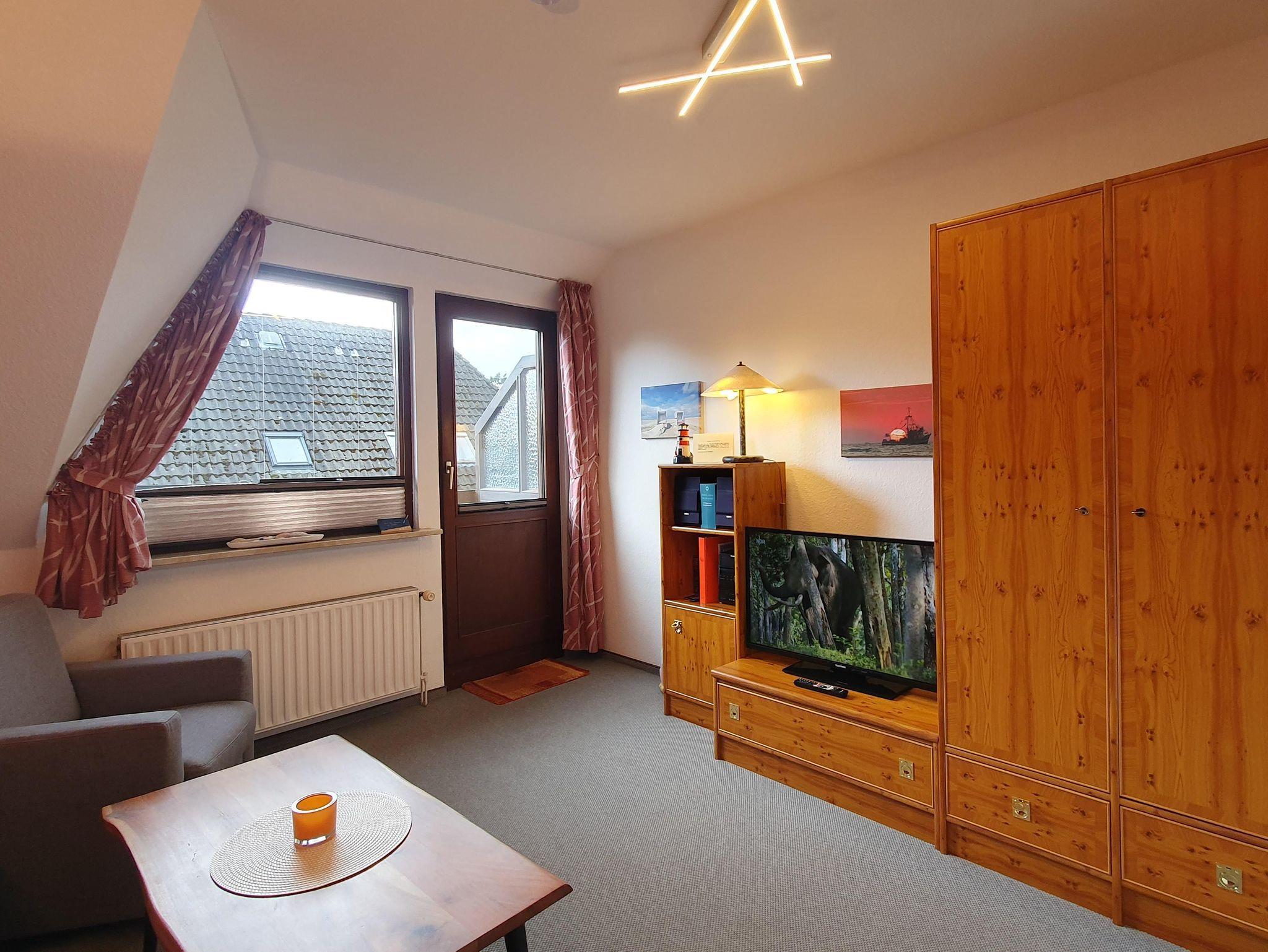 1 Wohnzimmer mit Couch, Flat-TV und Stereoradio mit CD-Player. W-LAN kostenlos. Kleiner Südbalkon zum sich wohlzufühlen.