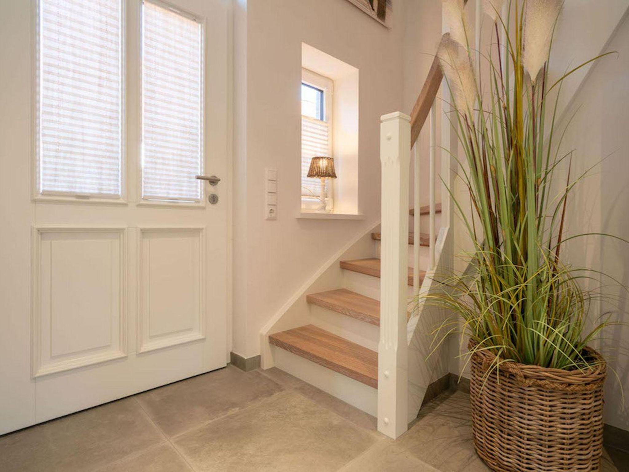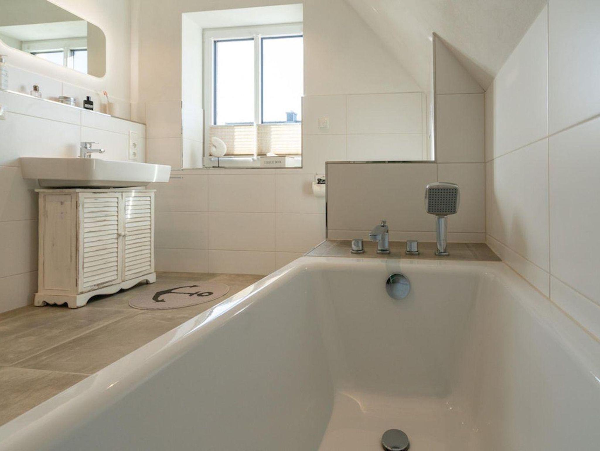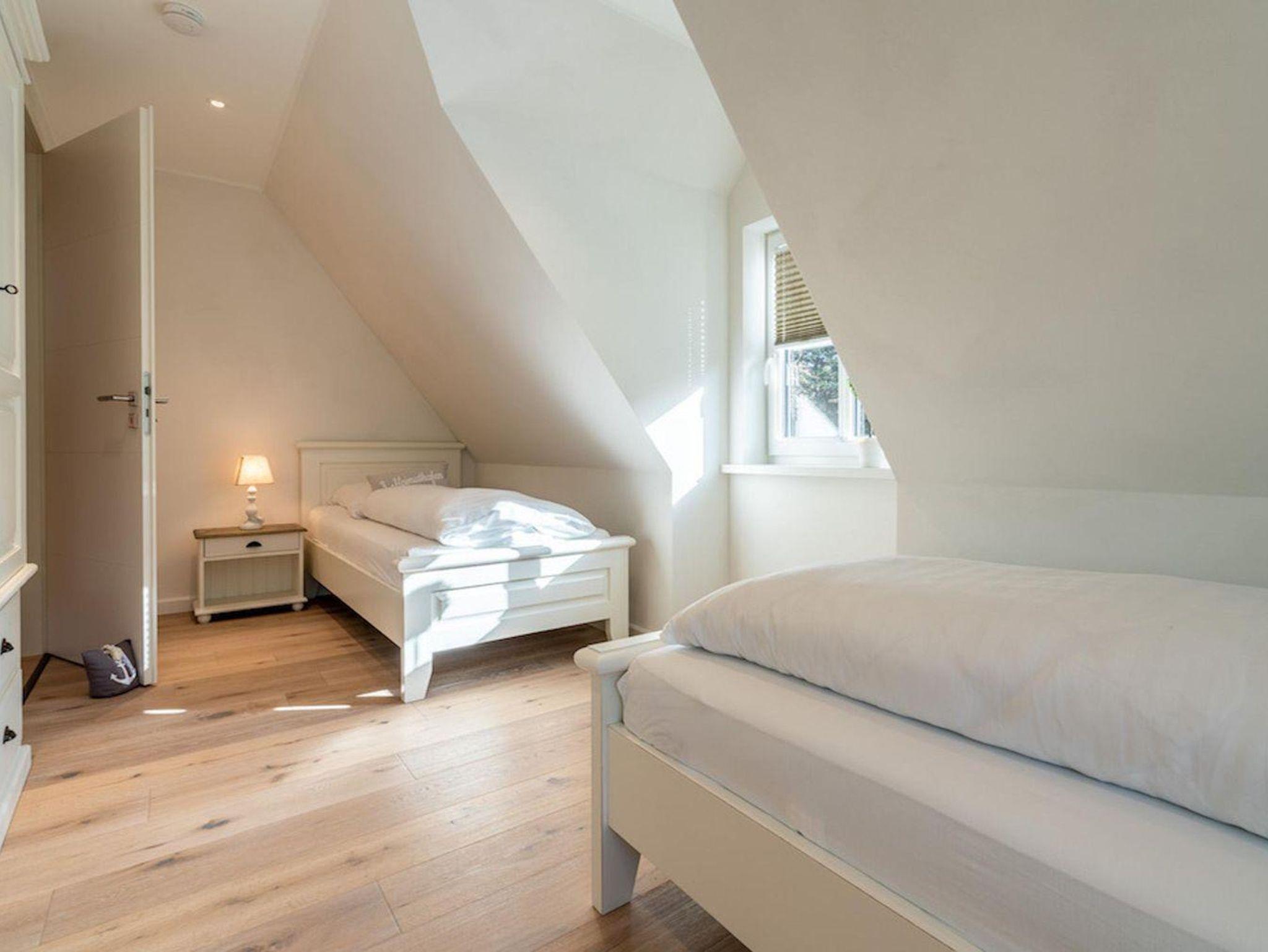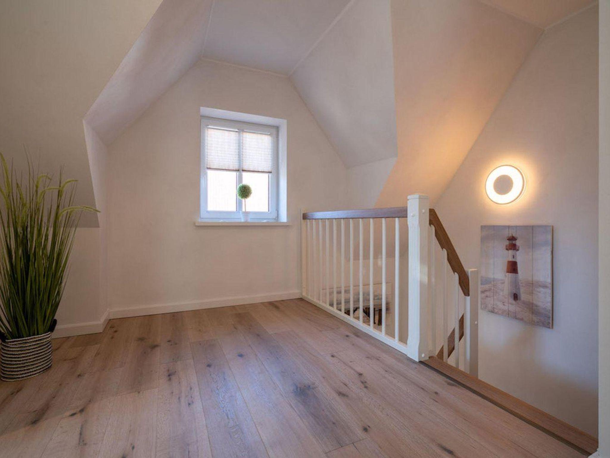 Im Eingangsbereich ist ein Flur mit Garderobe, von hier aus gelangt man in das Obergeschoss. Hier befindet sich ein Schlafzimmer mit einem Doppelbett und ein Doppelschlafzimmer mit 2 Einzelbetten. Große Fenster sorgen für viel Licht, in diesem Haus kann der Sonnenauf- bzw. untergang genossen werden. Außerdem ist im Obergeschoss ein weiteres Vollbad mit Dusche und Badewanne sowie ein geräumiger Flur.