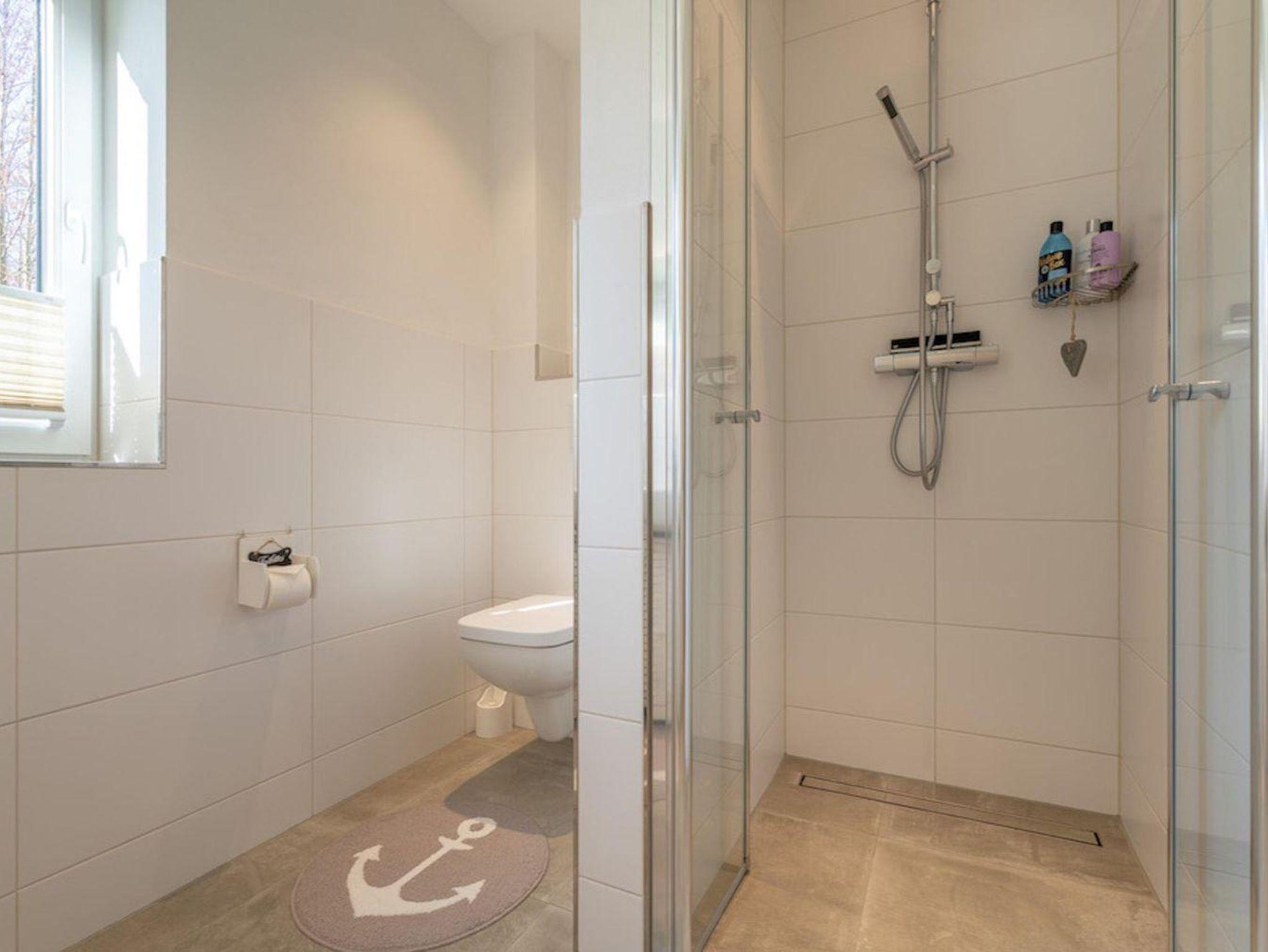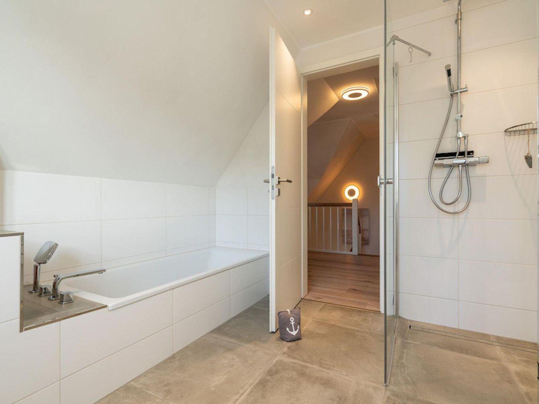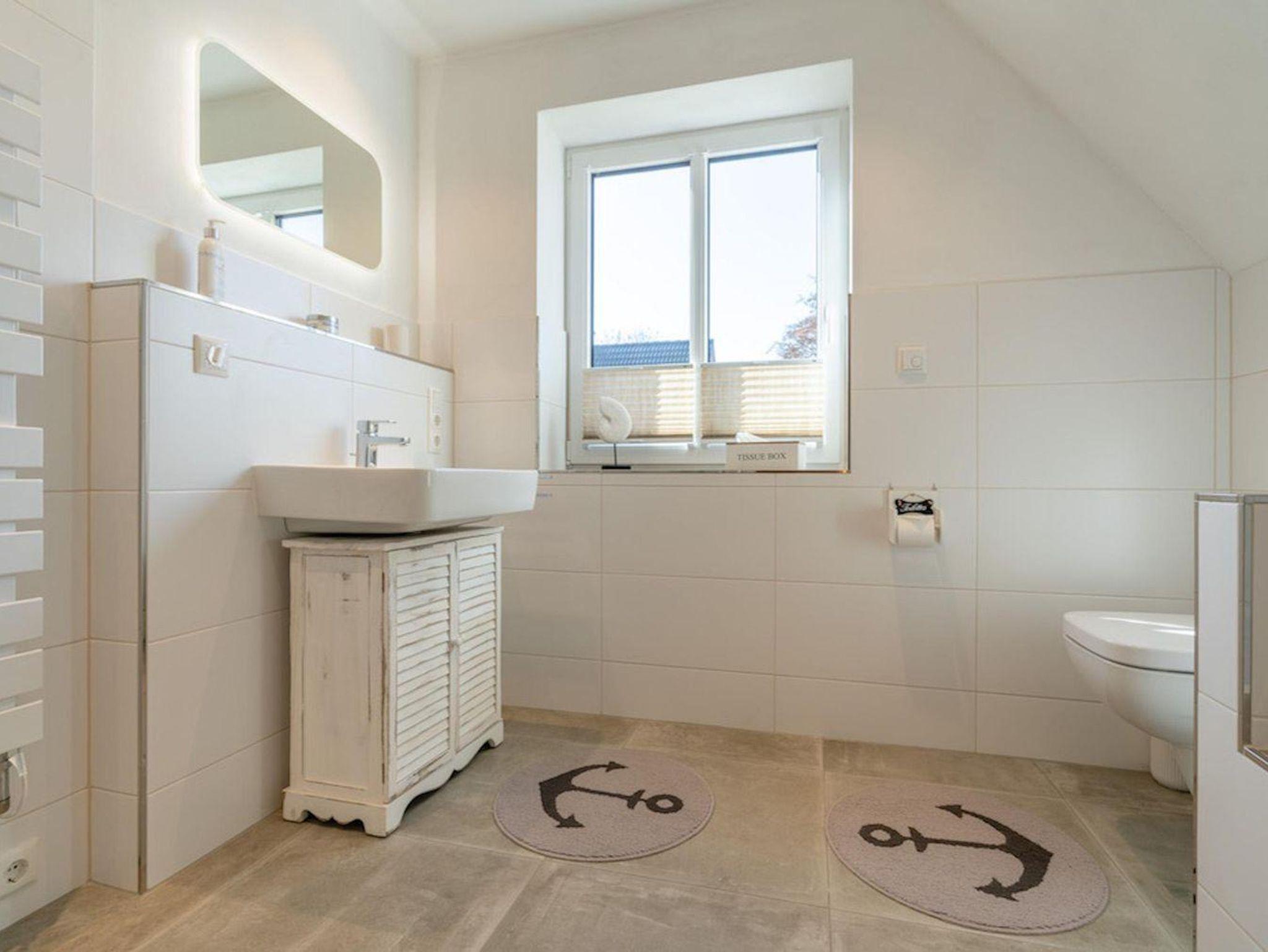 Im Eingangsbereich ist ein Flur mit Garderobe, von hier aus gelangt man in das Obergeschoss. Hier befindet sich ein Schlafzimmer mit einem Doppelbett und ein Doppelschlafzimmer mit 2 Einzelbetten. Große Fenster sorgen für viel Licht, in diesem Haus kann der Sonnenauf- bzw. untergang genossen werden. Außerdem ist im Obergeschoss ein weiteres Vollbad mit Dusche und Badewanne sowie ein geräumiger Flur.