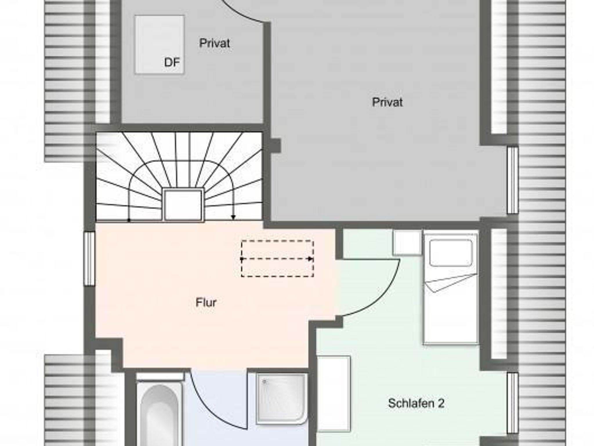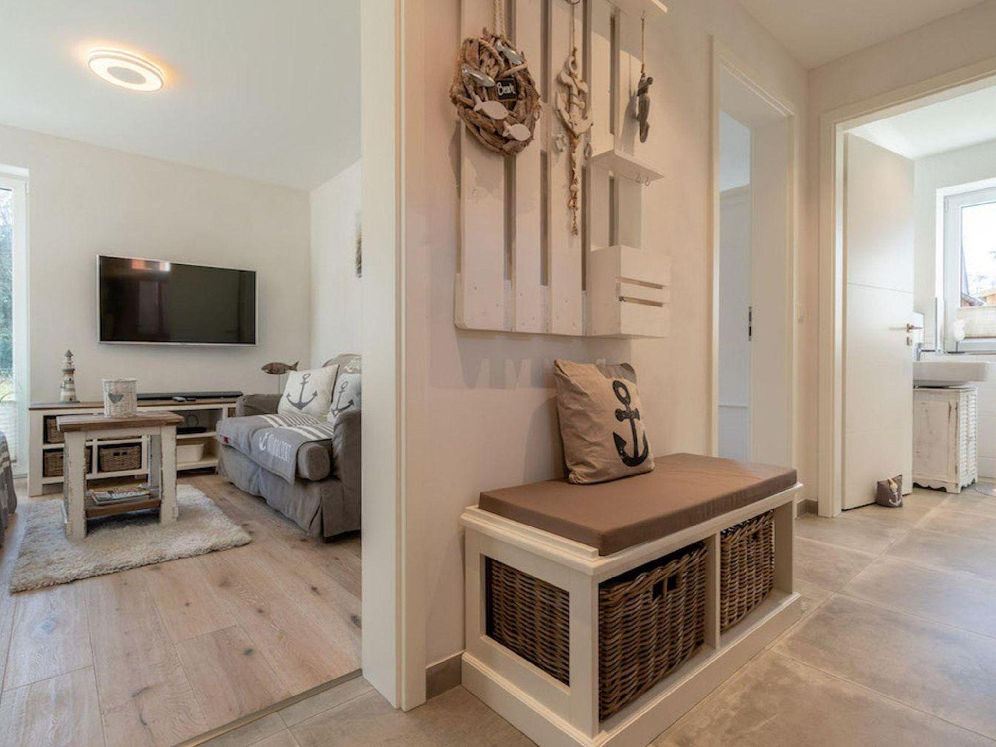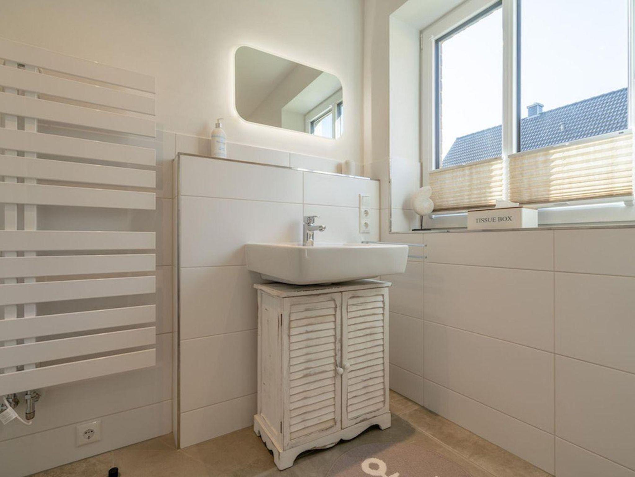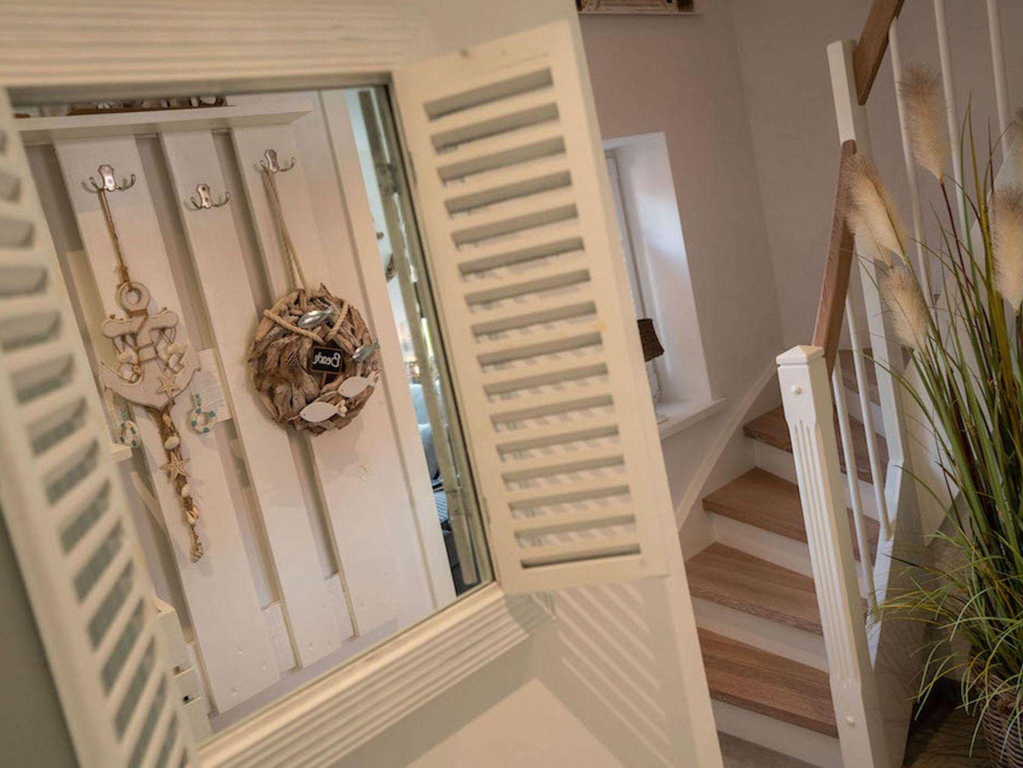 Im Eingangsbereich ist ein Flur mit Garderobe, von hier aus gelangt man in das Obergeschoss. Hier befindet sich ein Schlafzimmer mit einem Doppelbett und ein Doppelschlafzimmer mit 2 Einzelbetten. Große Fenster sorgen für viel Licht, in diesem Haus kann der Sonnenauf- bzw. untergang genossen werden. Außerdem ist im Obergeschoss ein weiteres Vollbad mit Dusche und Badewanne sowie ein geräumiger Flur.