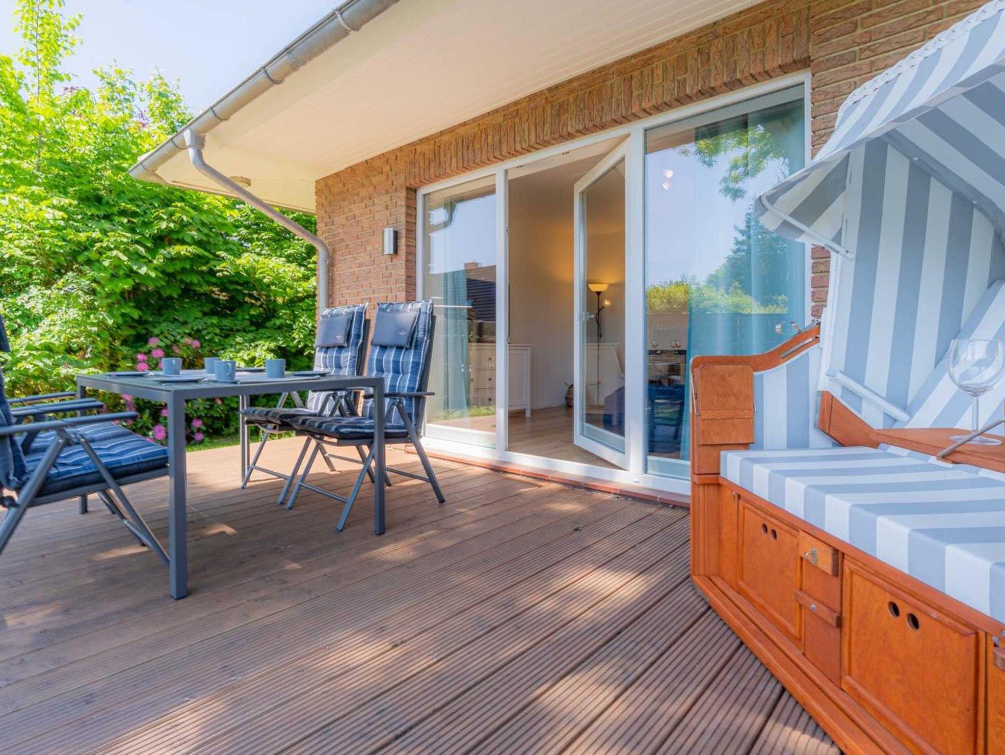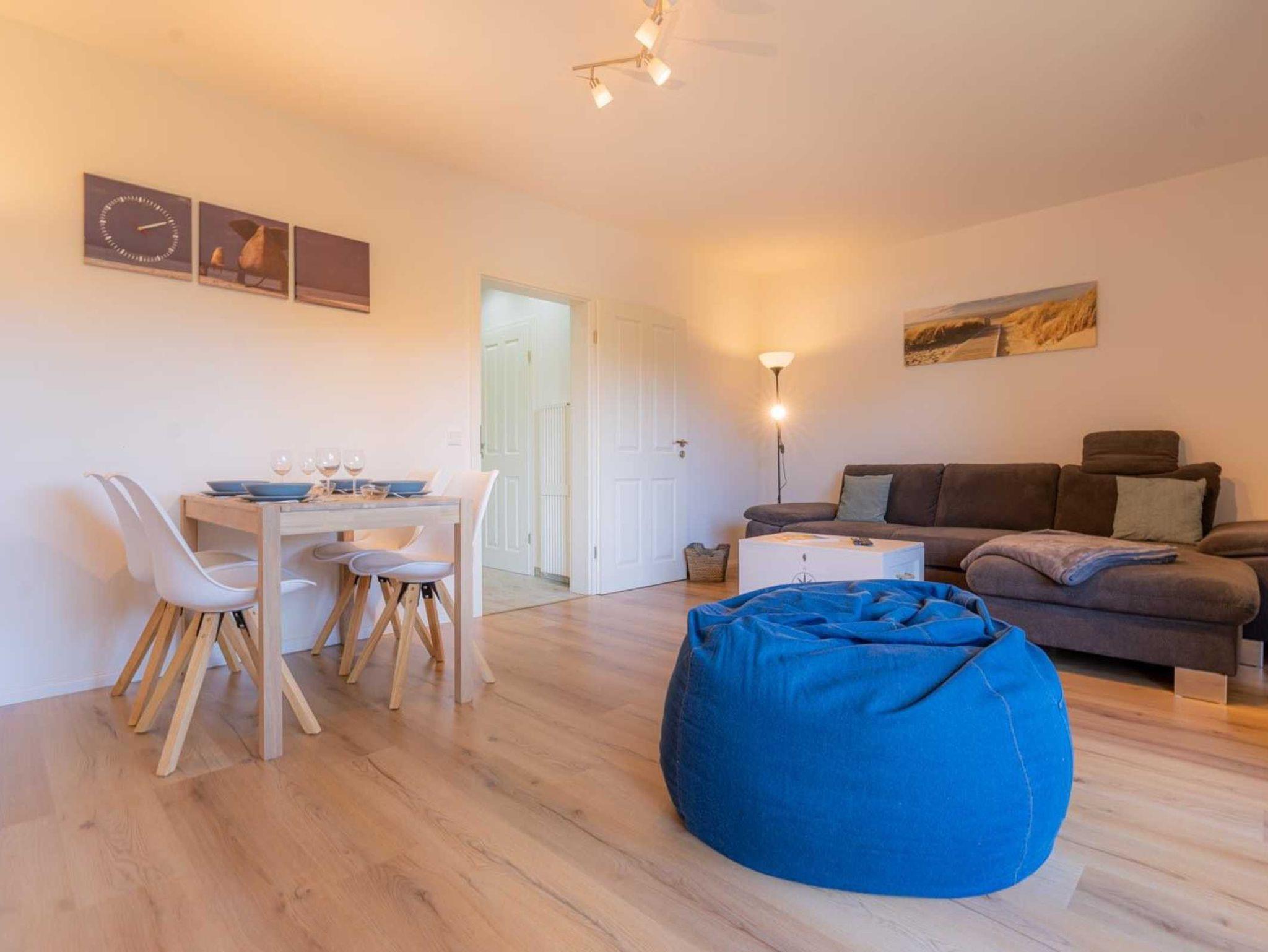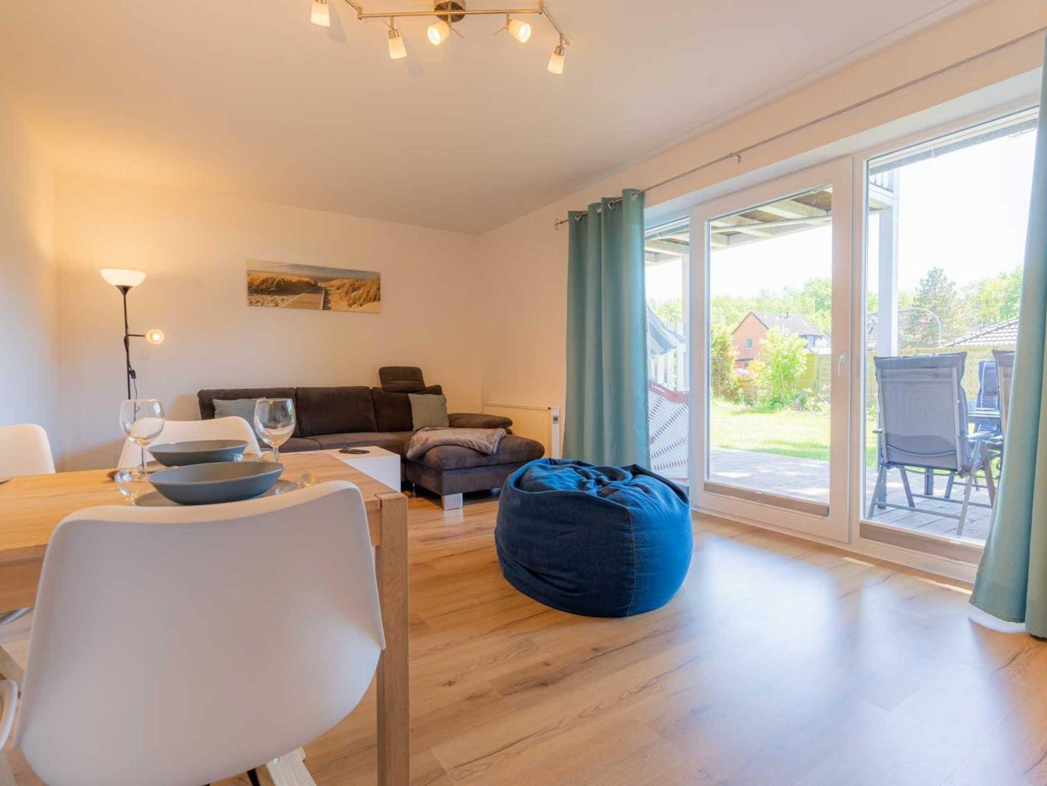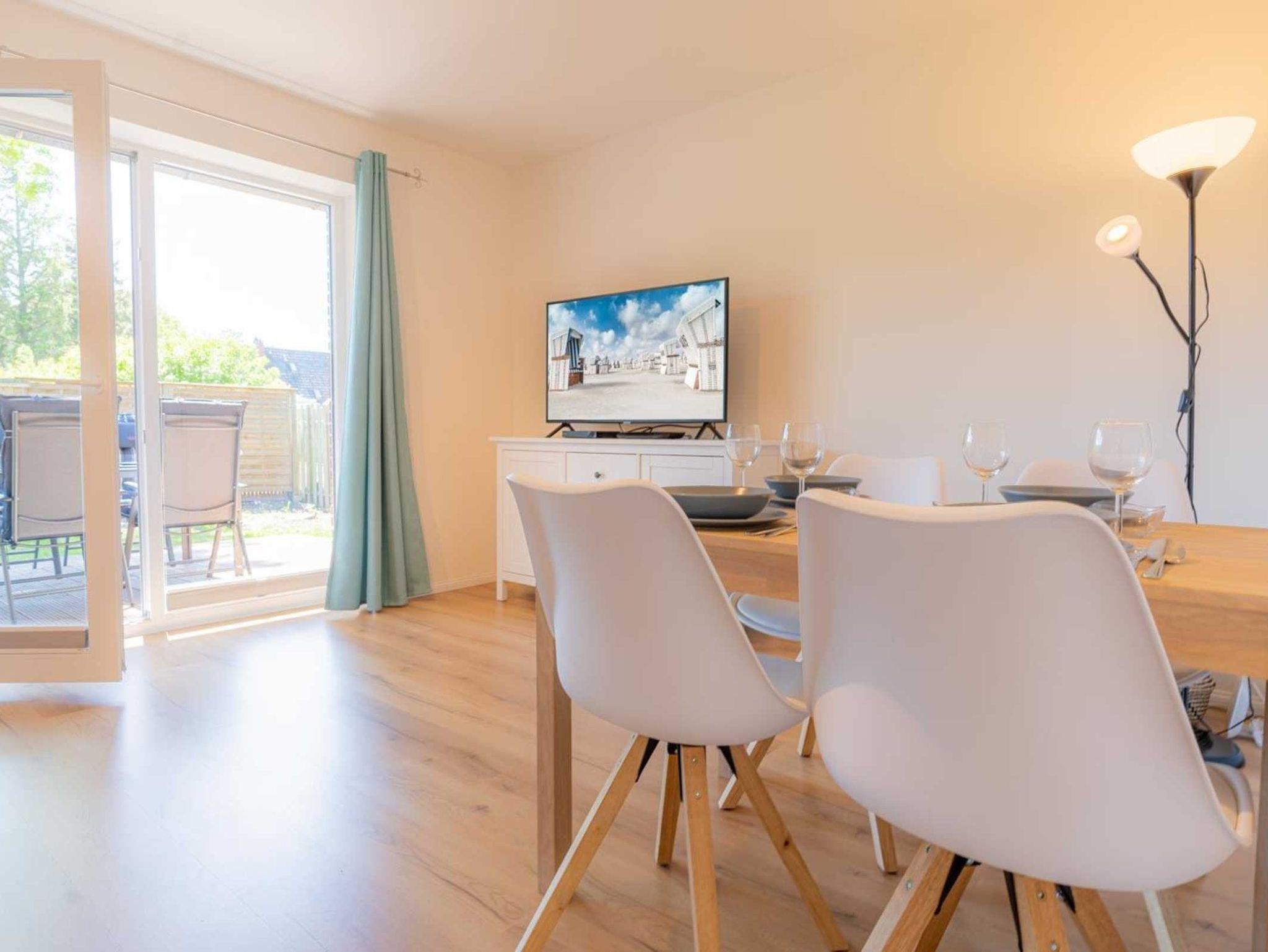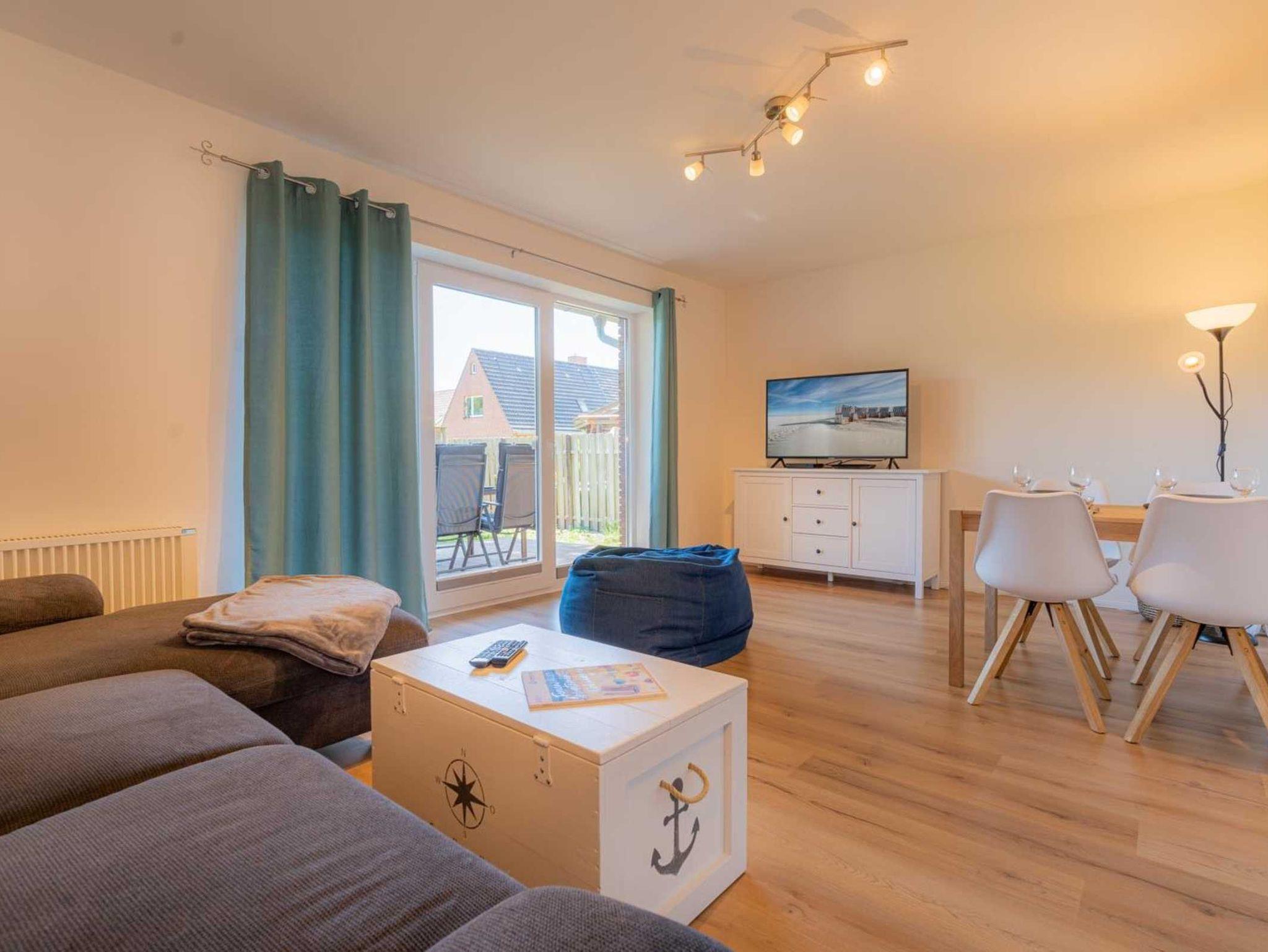 Wohnzimmer mit Schlafsofa (140x200cm), großem SMART-TV (Kabel mit Magenta), BluRay-Player und Spiele-Sammlung. Direkter Zugang zur möblierten Gartenterrasse nach Süden mit Strandkorb. Offene Küche mit Backofen, Geschirrspüler, Kühlschrank mit Gefrierfach und Esstisch mit 4 Stühlen.