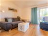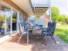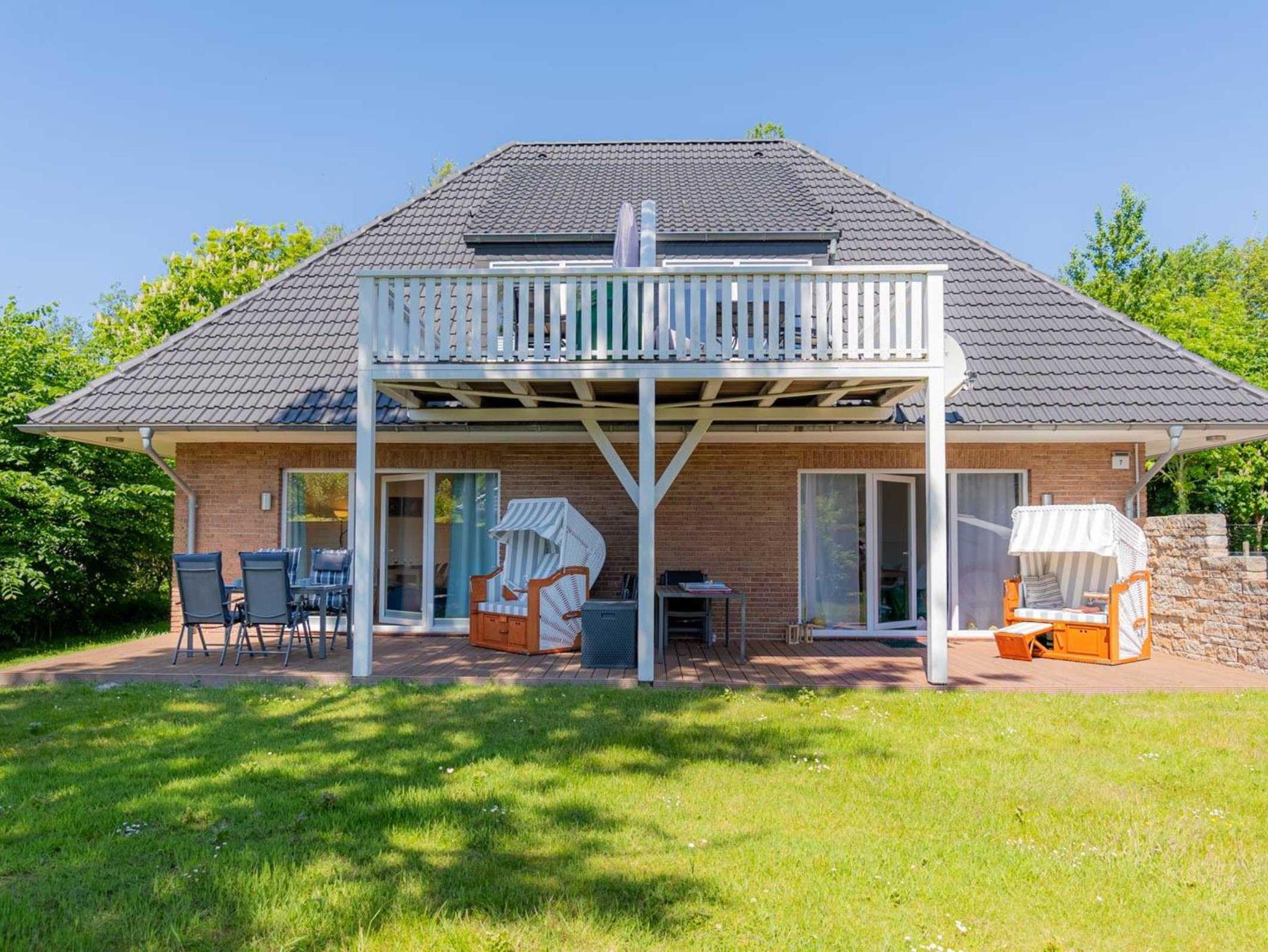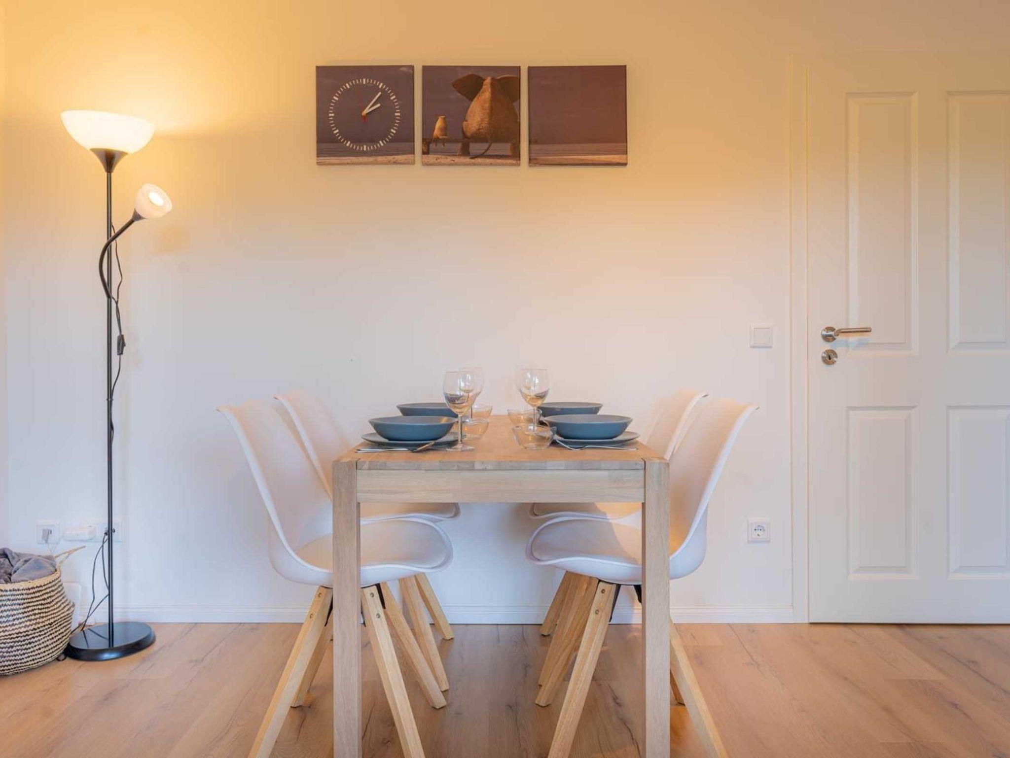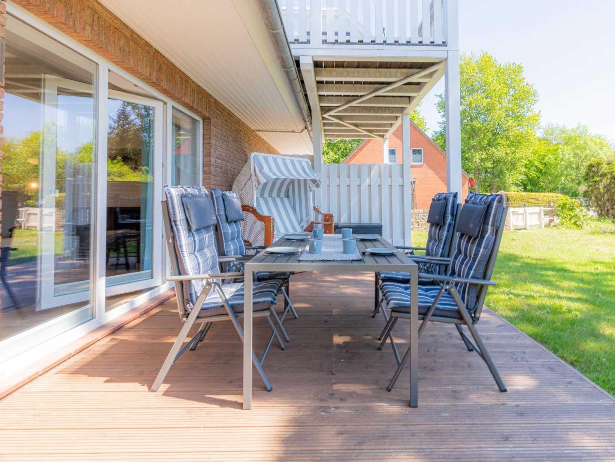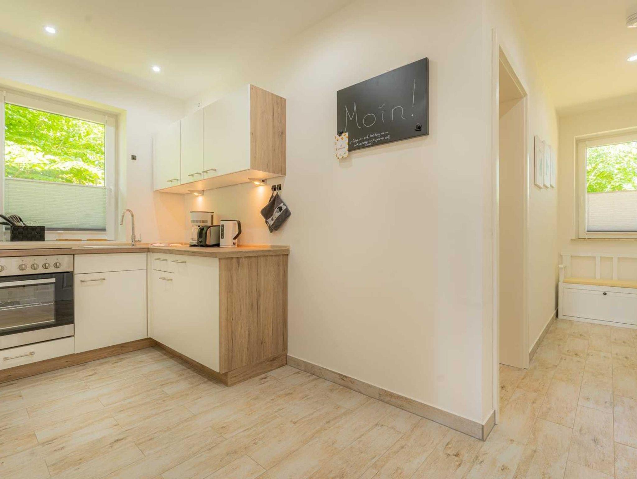 Wohnzimmer mit Schlafsofa (140x200cm), großem SMART-TV (Kabel mit Magenta), BluRay-Player und Spiele-Sammlung. Direkter Zugang zur möblierten Gartenterrasse nach Süden mit Strandkorb. Offene Küche mit Backofen, Geschirrspüler, Kühlschrank mit Gefrierfach und Esstisch mit 4 Stühlen.