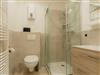 Badezimmer (Duschbad) mit Dusche, WC, Handtuchwärmer und Föhn.