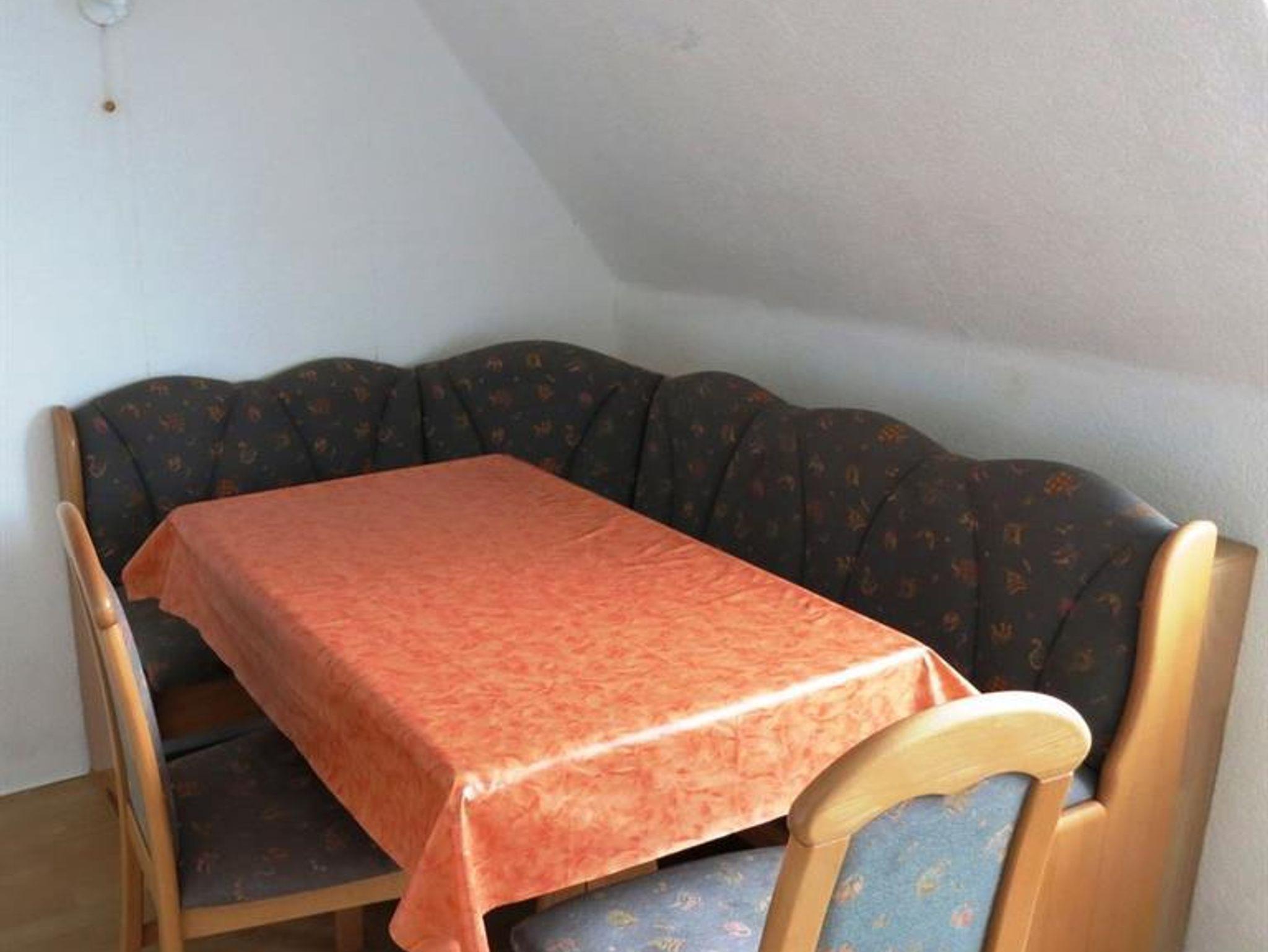 Ruhiges Wohnen im Obergeschoß auf 50qm, nahe des historischen Dorfkernes Diese Wohnung ist aufgeteilt in einen Wohnschlafraum mit Doppelbett und Couchgarnitur, sowie ein separater Schlafraum mit zwei Einzelbetten und ist insgesamt für bis zu 4 Personen geeignet. Dadurch, dass in einem Schlafzimmer, das Wohnzimmer integriert ist, kann man bei schlechtem Wetter ganz gemütlich vom Bett aus Fernsehn schaun. Die Küche ist vollausgestattet, mit Gasherd, Backofen, Geschirrspüler, sowie einem Kühlschrank mit integriertem Gefrierfach,... In der Küche befindet sich auch ein kostenloser Internetzugang und ein großer Esstisck mit Eckbank zum gemütlichen Beisammensein. Im Garten stehen Ihnen eine möbilierte Terrasse zur Verfügung.