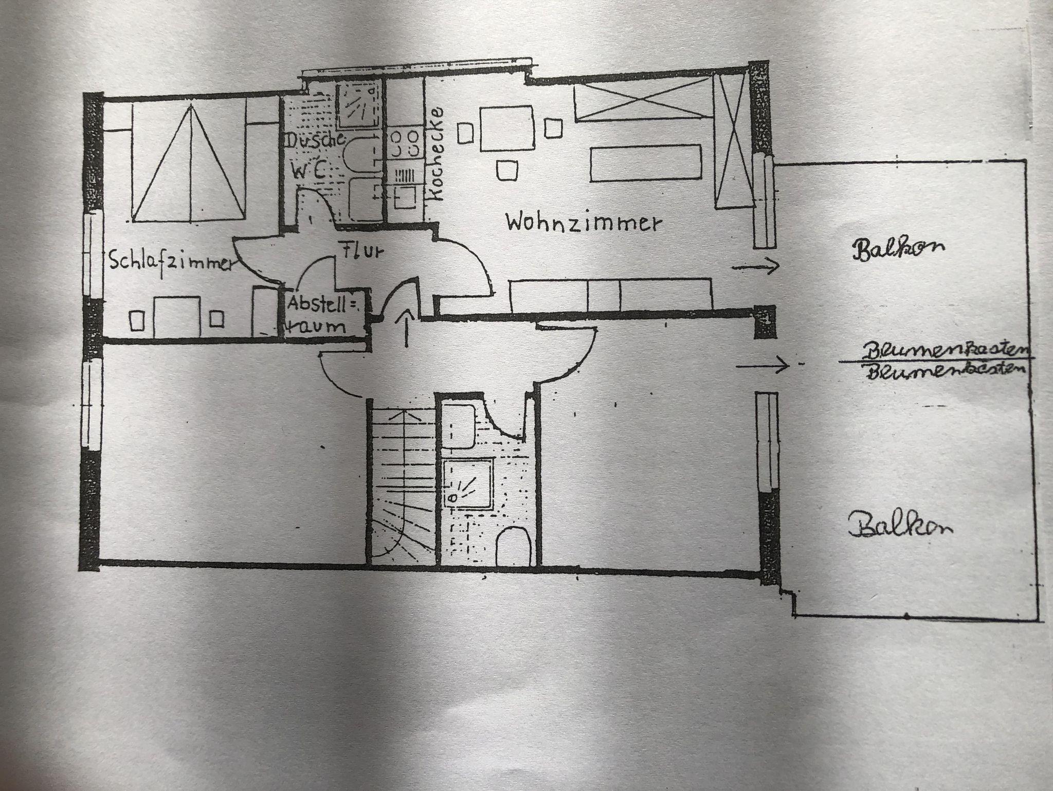 Diese 40 gm große Ferienwohnung 1 liegt ruhig gelegen im ersten Stock unseres Einfamilienhauses und verfügt neben Wohnraum mit Küchenzeile, Schlafzimmer und Dusche/WC auch über einen kleinen Abstellraum.