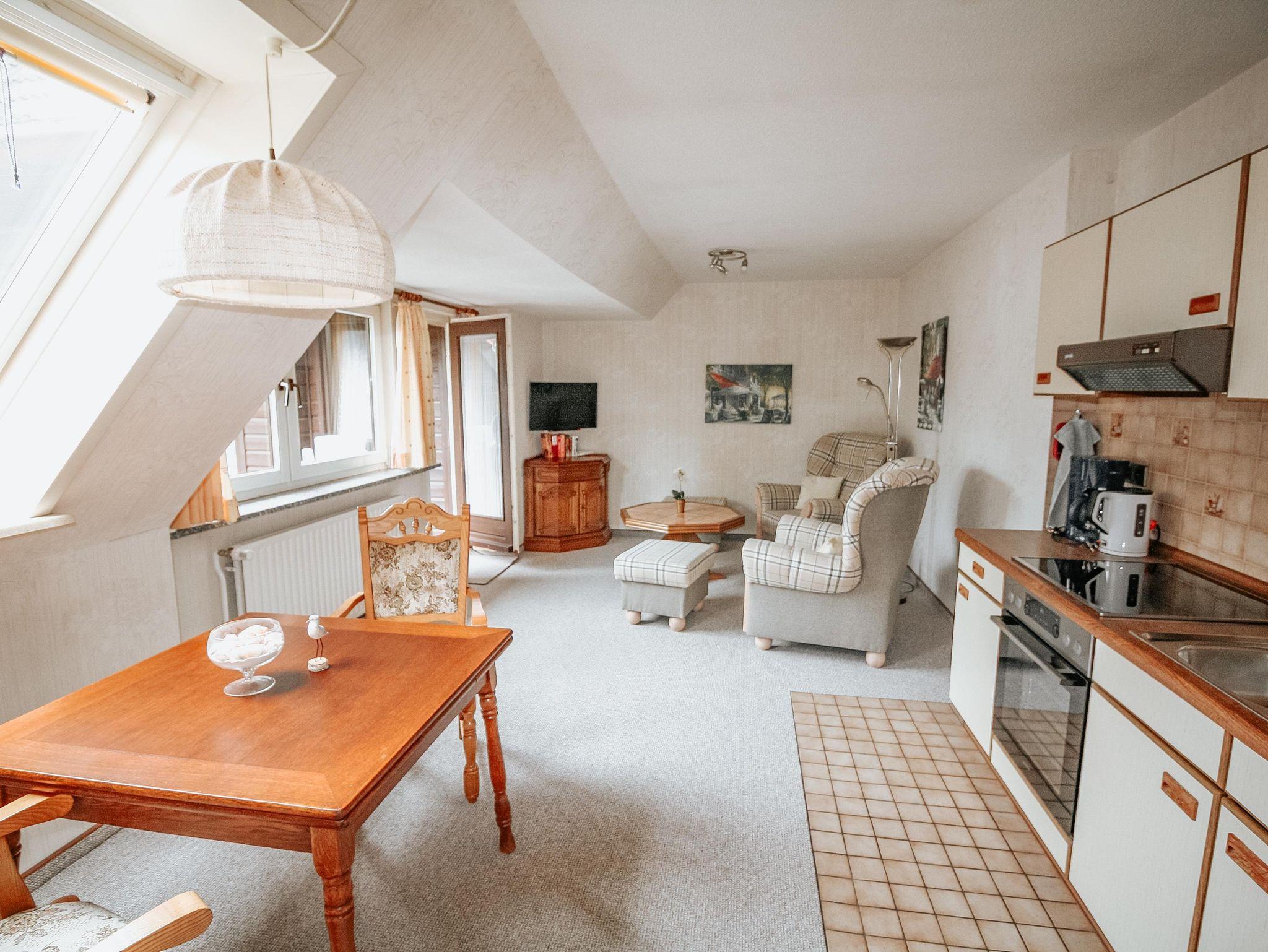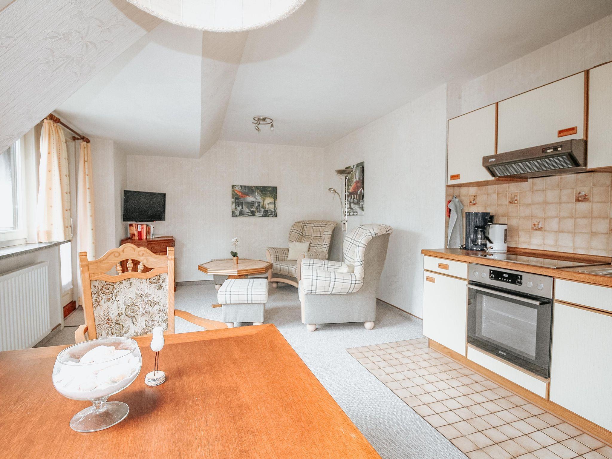 Die Ferienwohnung ist ausgestattet mit einem Wohnzimmer und Essecke und einer separaten Küchenzeile,