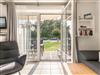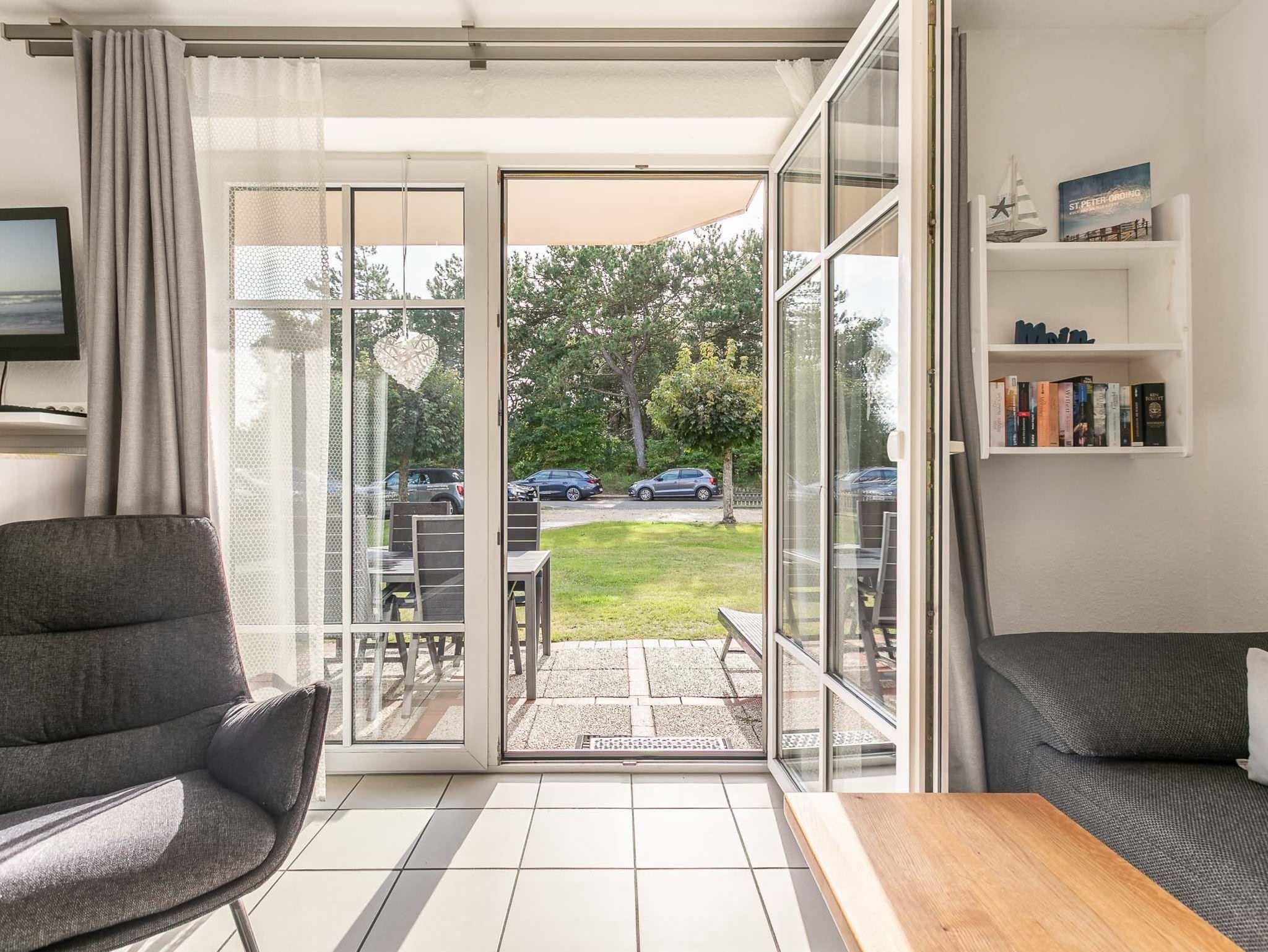 Wohnzimmer mit Doppelbett (2x 90x200cm), großem Sofa mit Ottomane, TV (Kabel) und Esstisch mit gepolsterter Sitzbank und 2 Stühlen. Direkter Zugang zur sonnigen Garten-Terrasse nach Südwesten mit Gartenmöbeln und Sonnenliege. Offene Küche mit Backofen, Geschirrspüler, Kühlschrank mit Gefrierfach und Tchibo Caffissimo Kapsel-Kaffeemaschine.