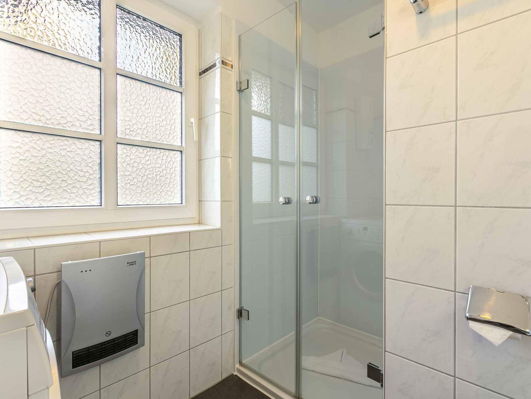 Badezimmer (Duschbad) mit Dusche, WC, Tageslicht, Föhn und Waschmaschine. Das Fenster hat Fliegengitter.