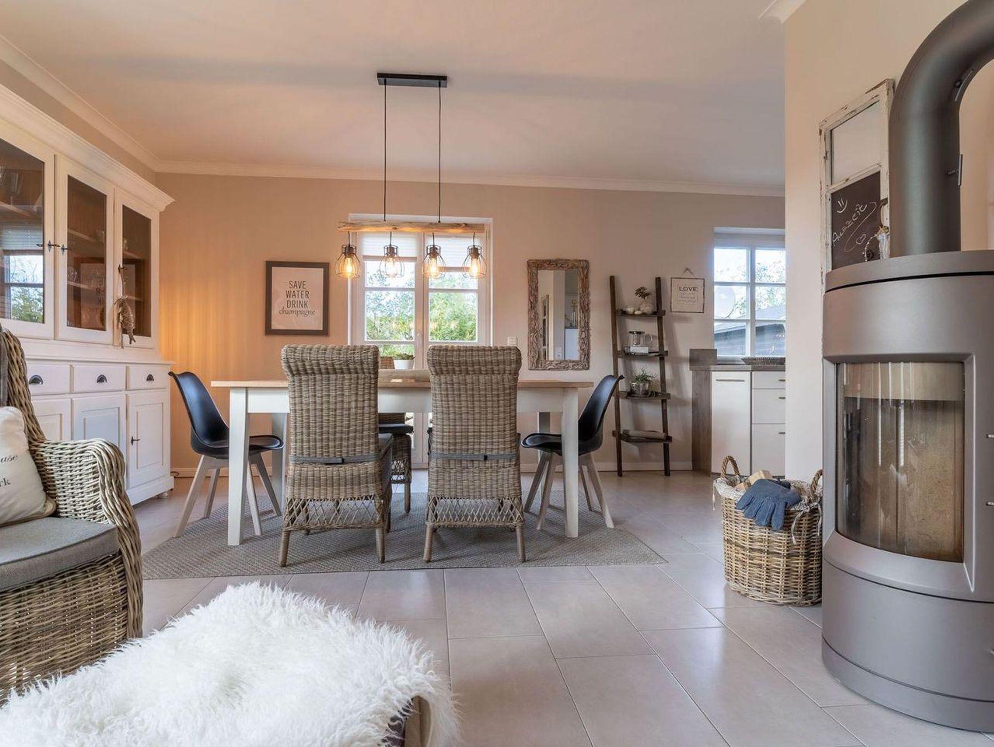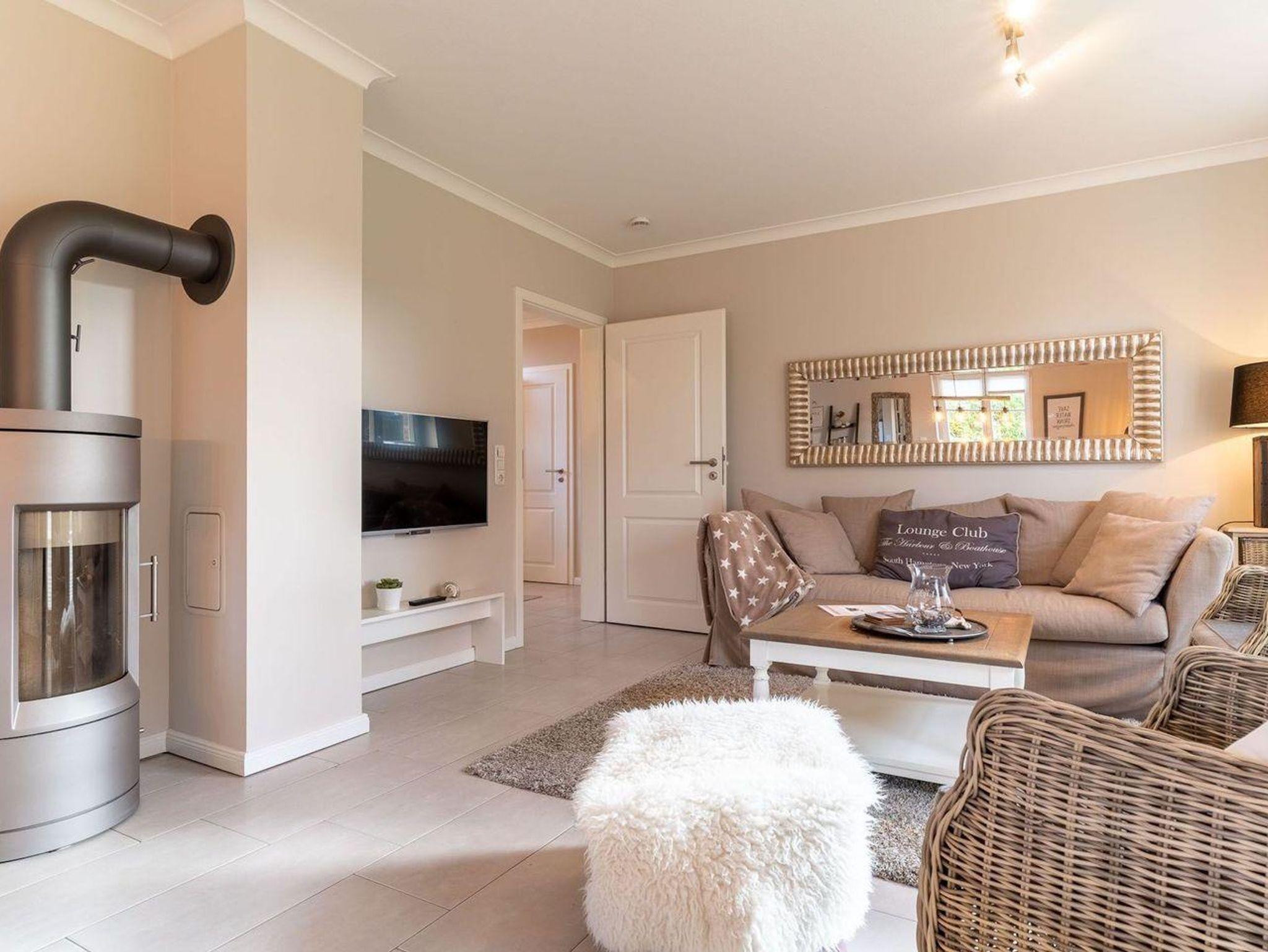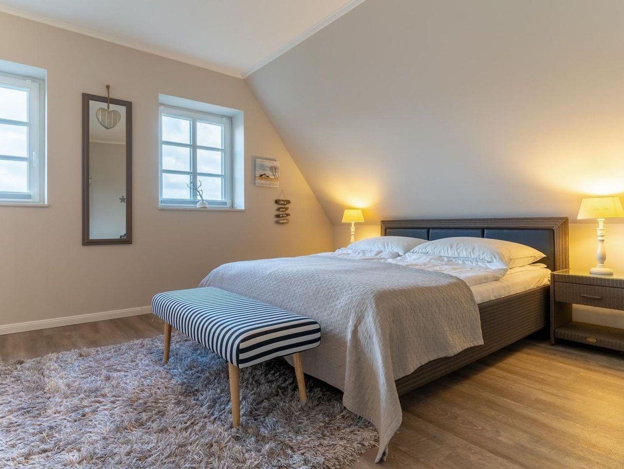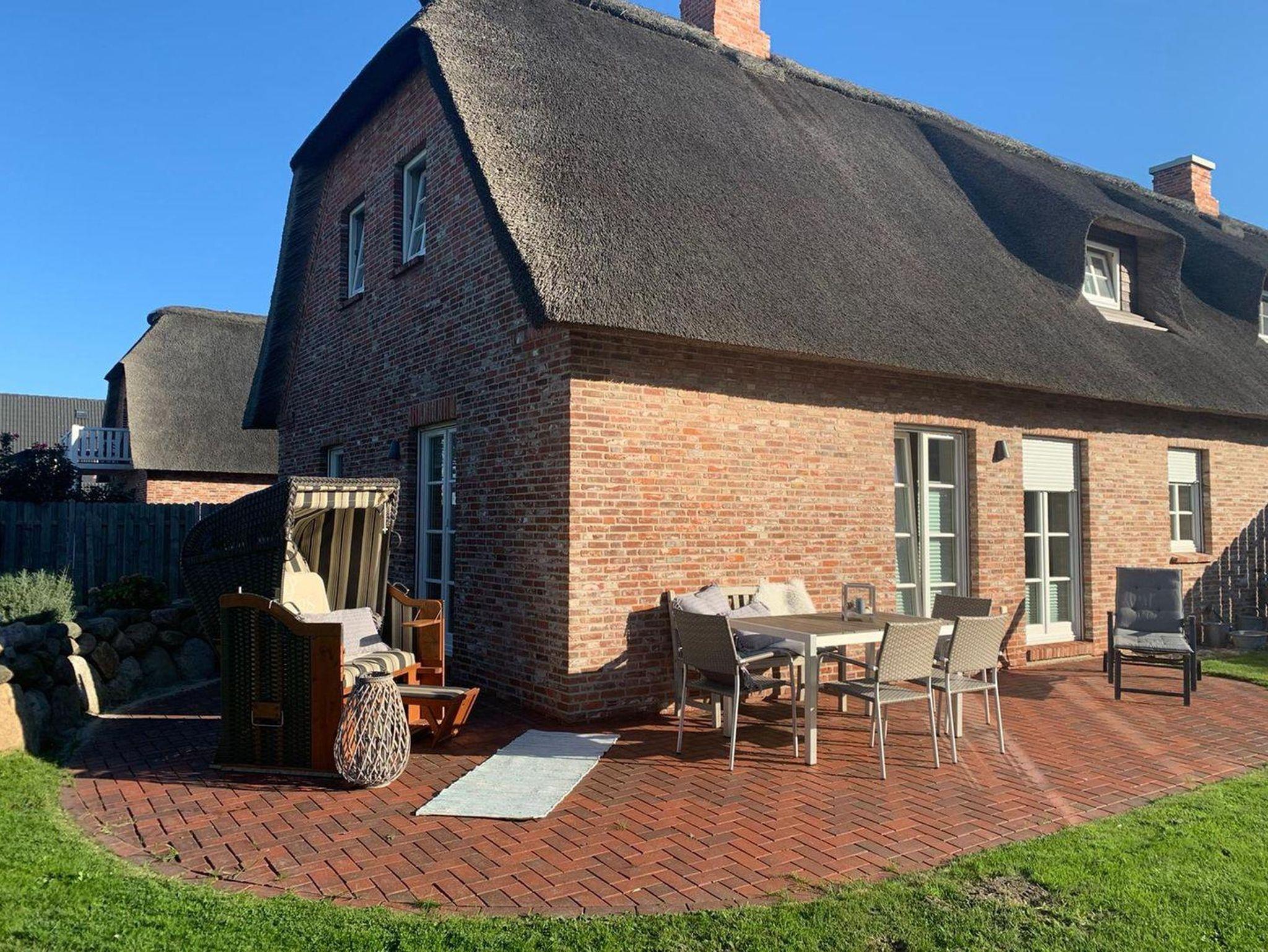 Dieses wunderschöne Doppelhaus unter Reet verfügt über ca. 113 m² Wohnfläche und bietet großzügigen Platz für 6 Personen. Im Erdgeschoss befindet sich der lichtdurchflutete Wohnraum mit TV, Kamin, einer großzügigen Sitzecke. Die offene Wohnküche verfügt über hochwertige Geräte und ist voll ausgestattet für gemeinsames Kochen. Die Wohnräume sind mit exklusiven Möbeln eingerichtet. An den Wohnbereich schließen sich ein Flur, sowie ein Hauswirtschaftsraum. Ebenso ist im Erdgeschoss ein Doppelschlafzimmer mit Gästebad und Dusche. Das gesamte Erdgeschoss verfügt über geschmackvolle Fußbodenfliesen.