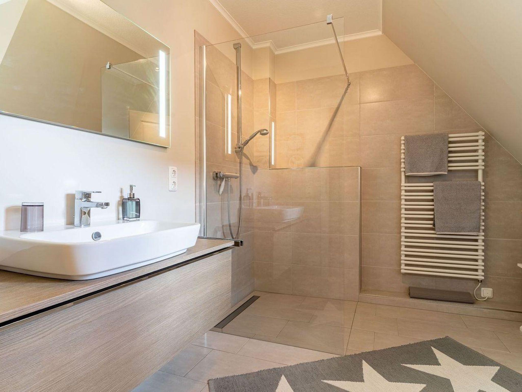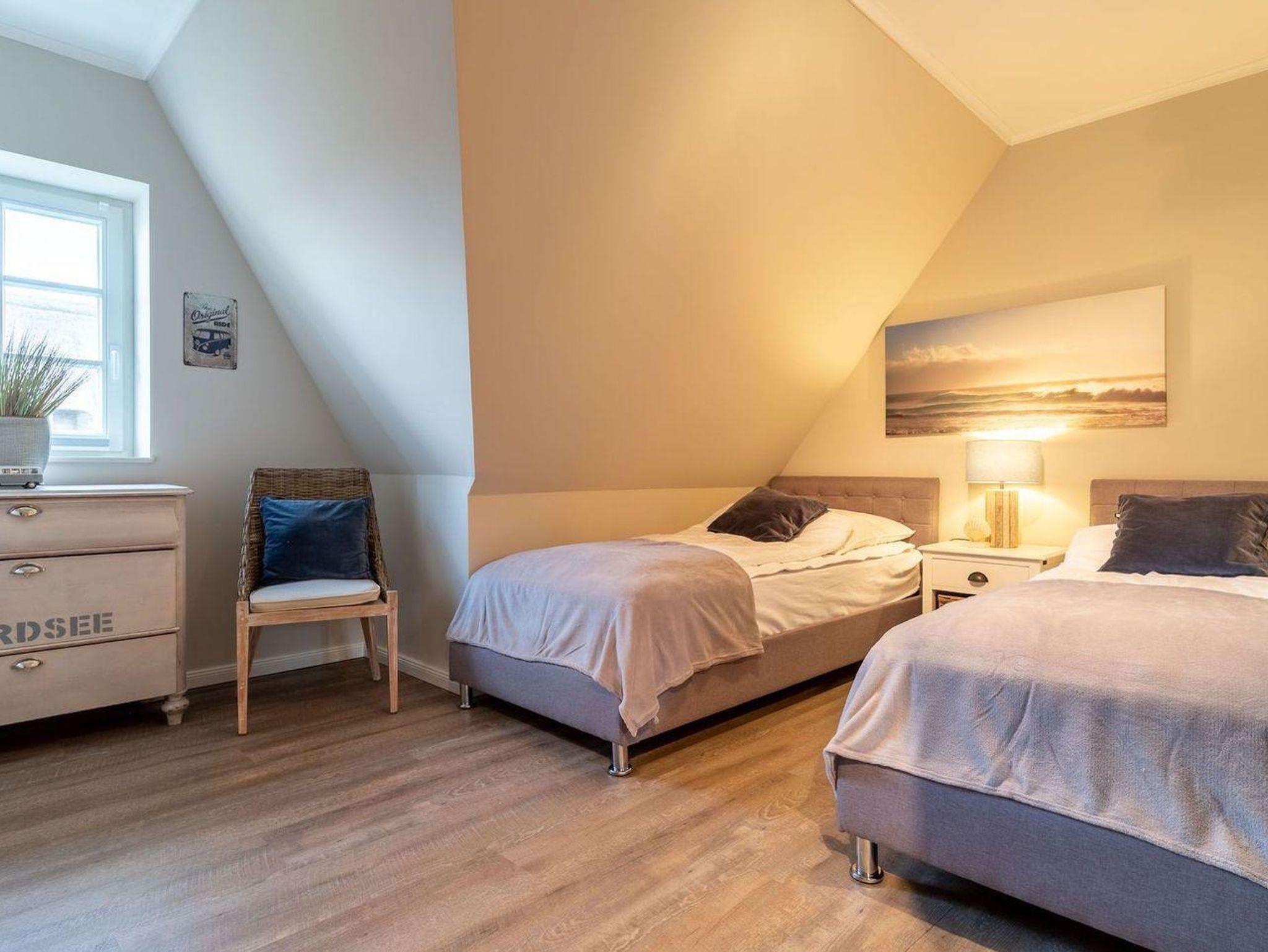 Über eine Holztreppe gelangt man in das Obergeschoss. Die zwei weiteren Schlafzimmern, eines mit einem Doppelbett und eines mit 2 Einzelbetten, sorgen für ruhevolle Erholung. Darüber hinaus befindet sich im Obergeschoss ein weiteres großzügiges Duschbad.