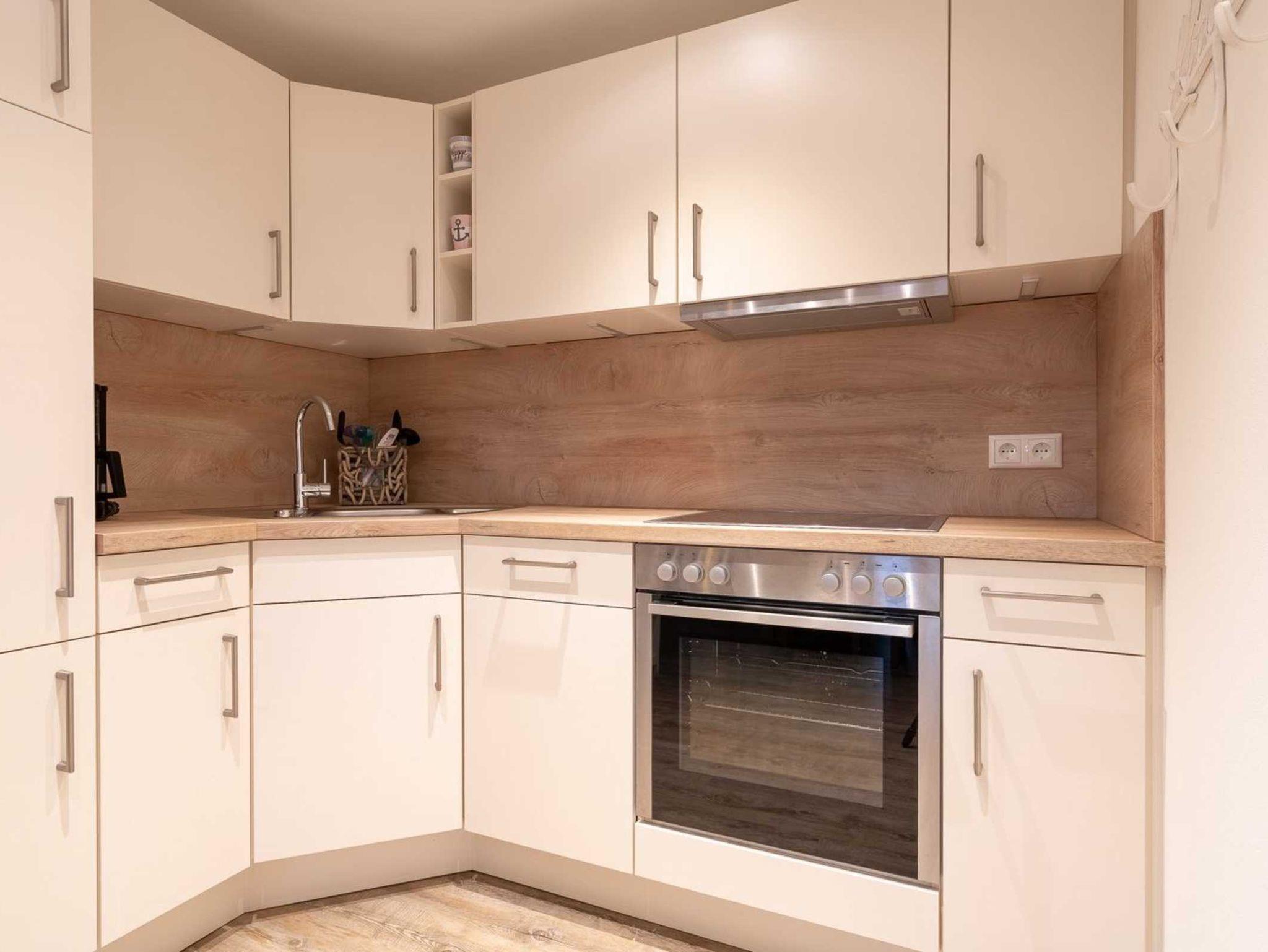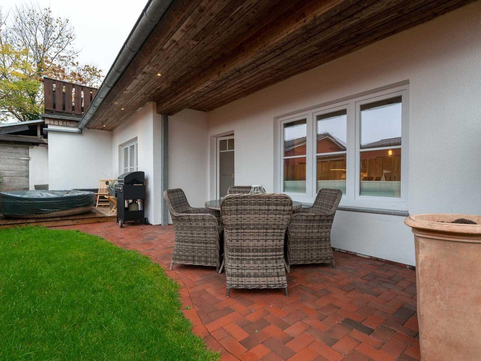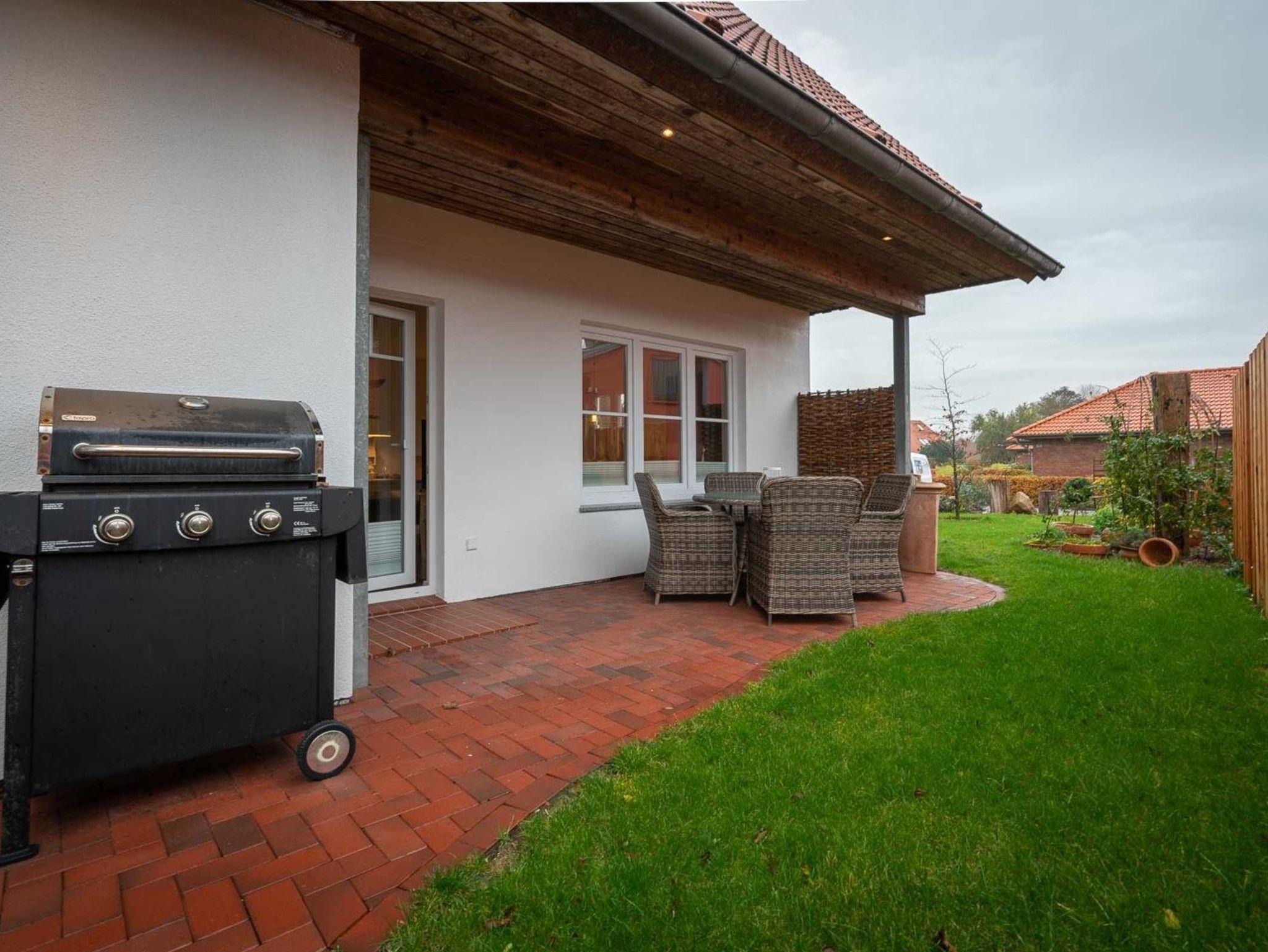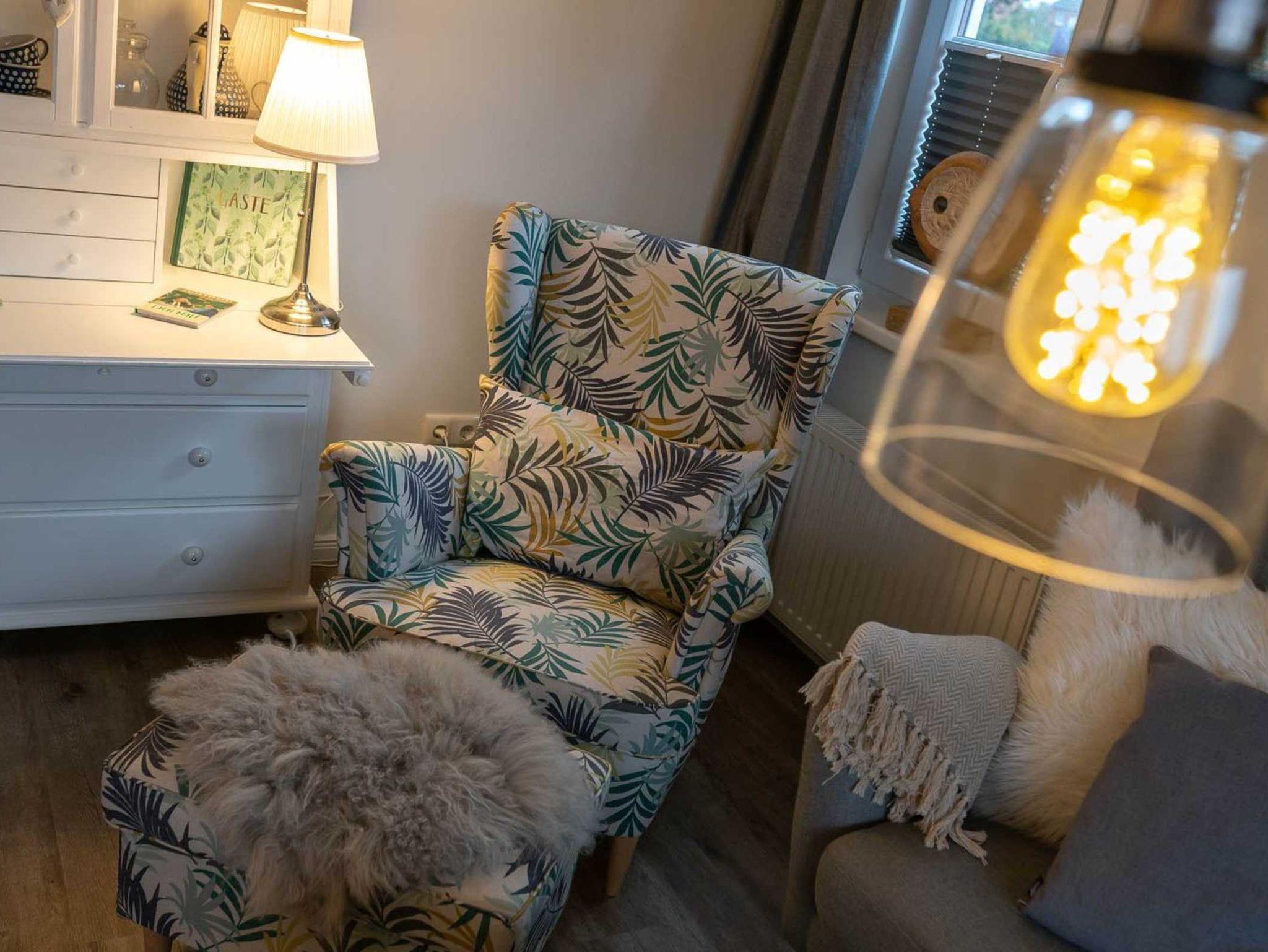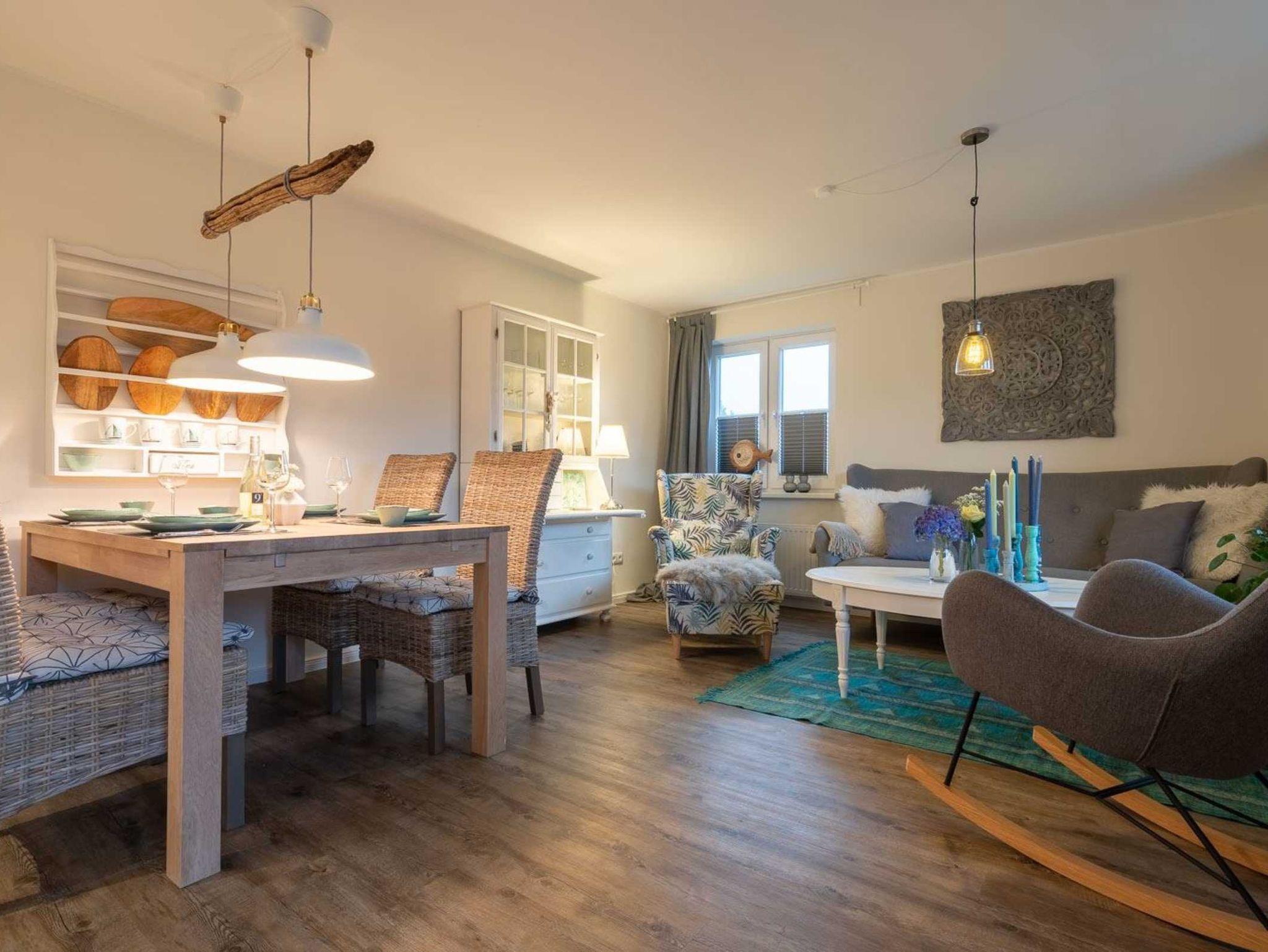 Wohnzimmer mit Sofa für 2-3 Personen, Ruhesessel mit Fußstück, Schaukelstuhl, großem TV (Kabel) und Esstisch mit 4 Stühlen. Direkter Zugang zur möblierten Gartenterrasse nach Süden - zum ganz privaten Entspannen und Erholen. Offene Küche mit Backofen, Geschirrspüler und Kühlschrank mit Gefrierfach.