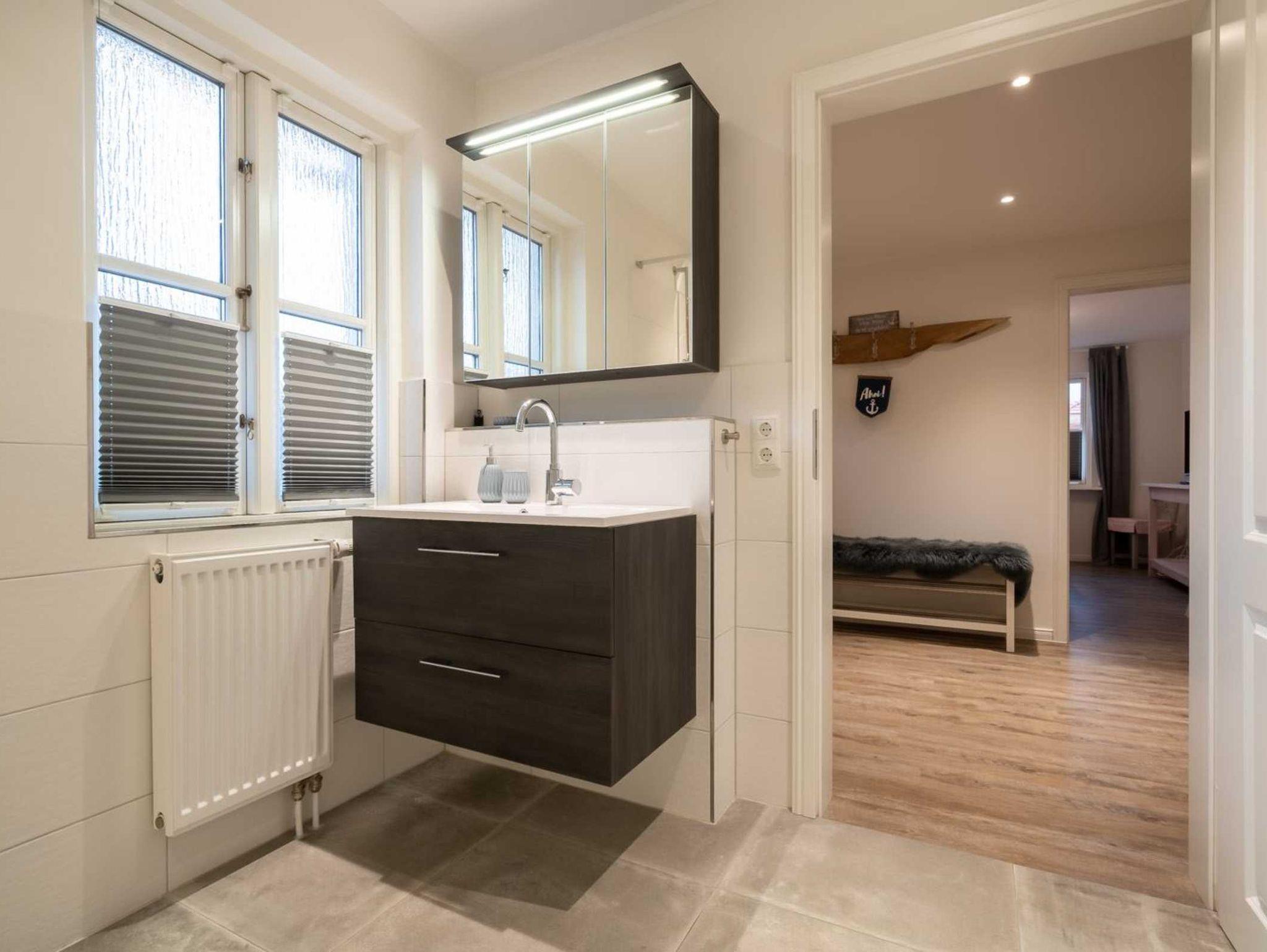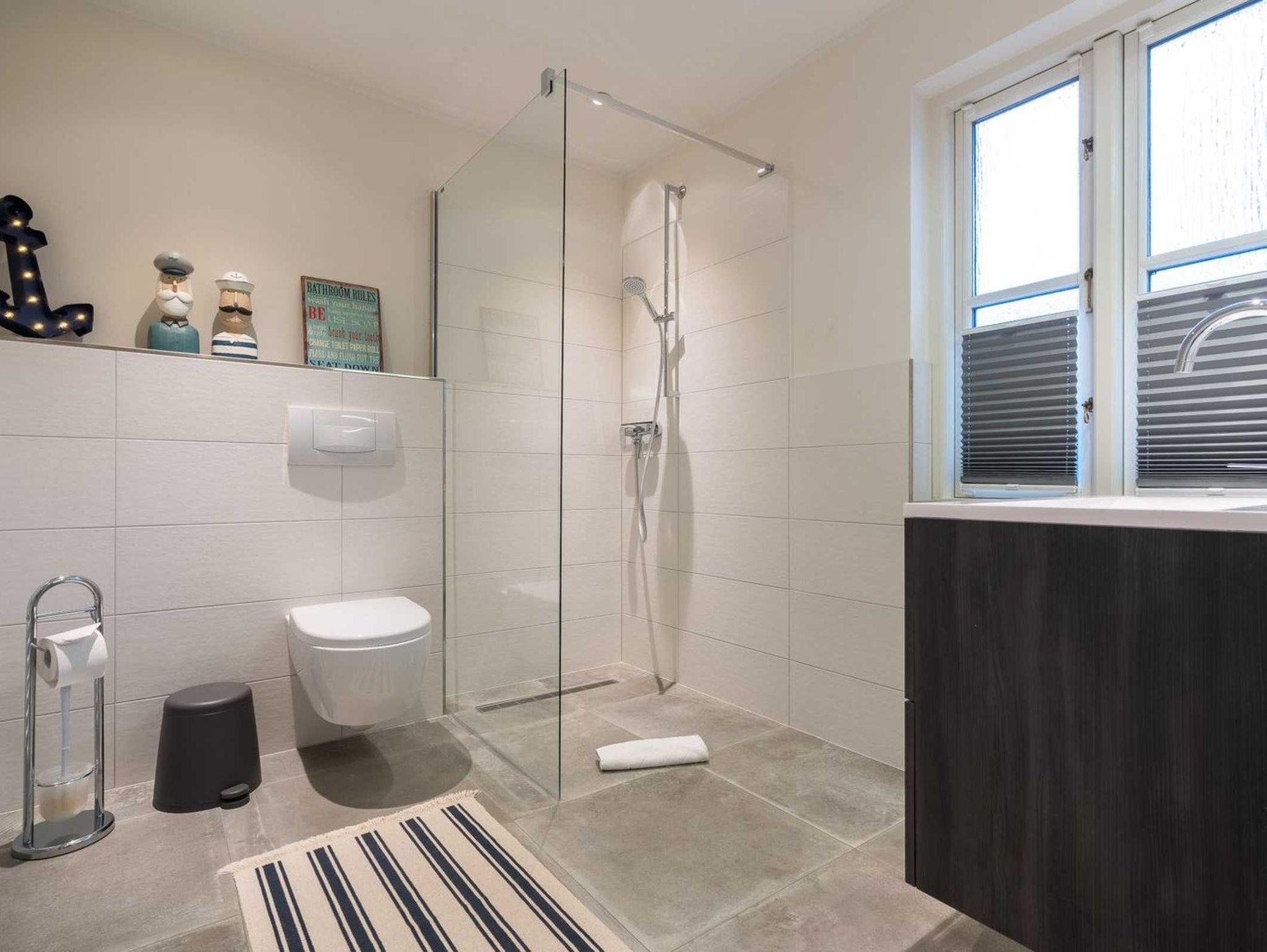 Modernes Badezimmer (Duschbad) mit bodengleicher Dusche, WC, Föhn und Tageslicht. Haushaltsraum mit Waschmaschine.