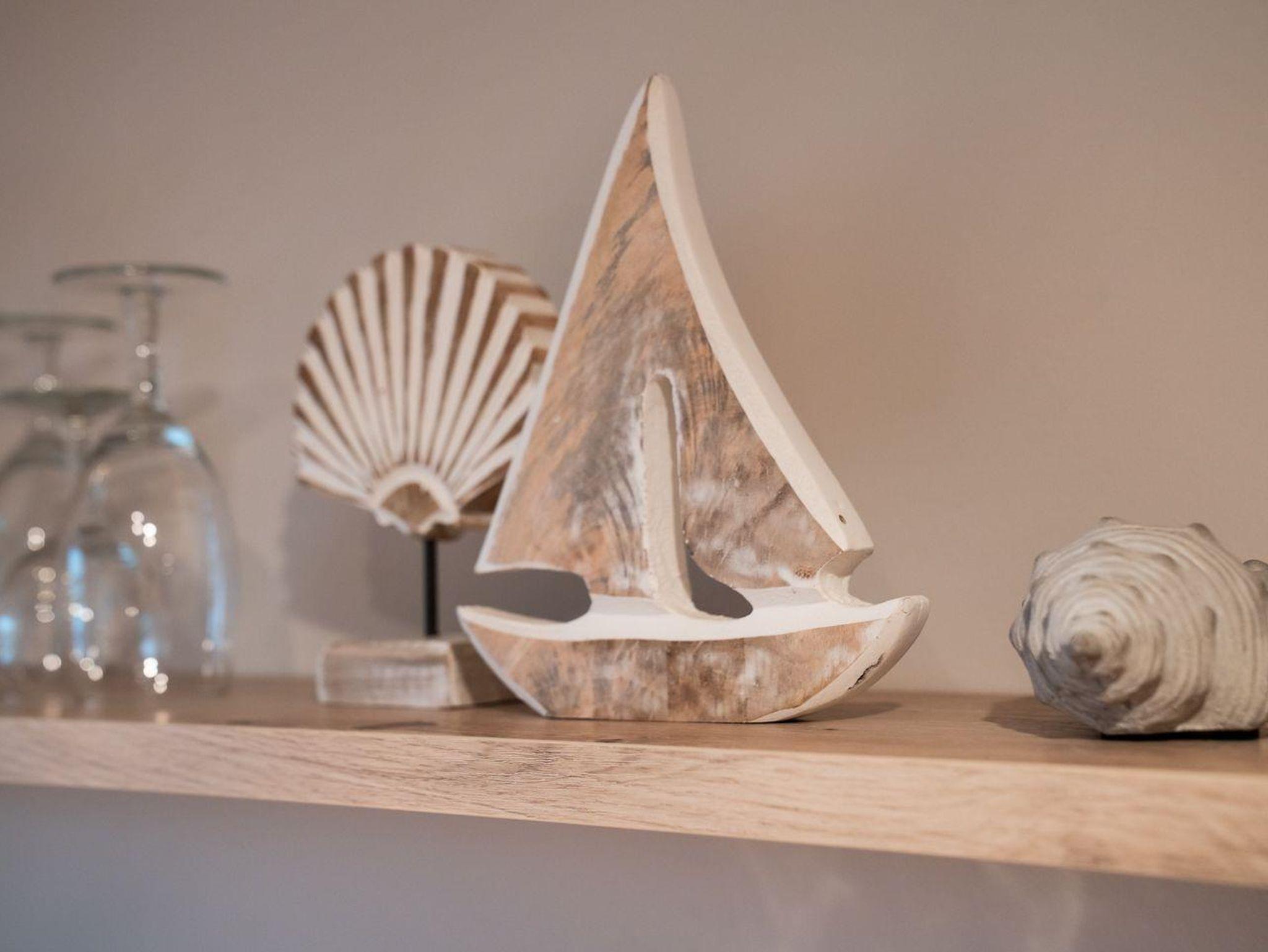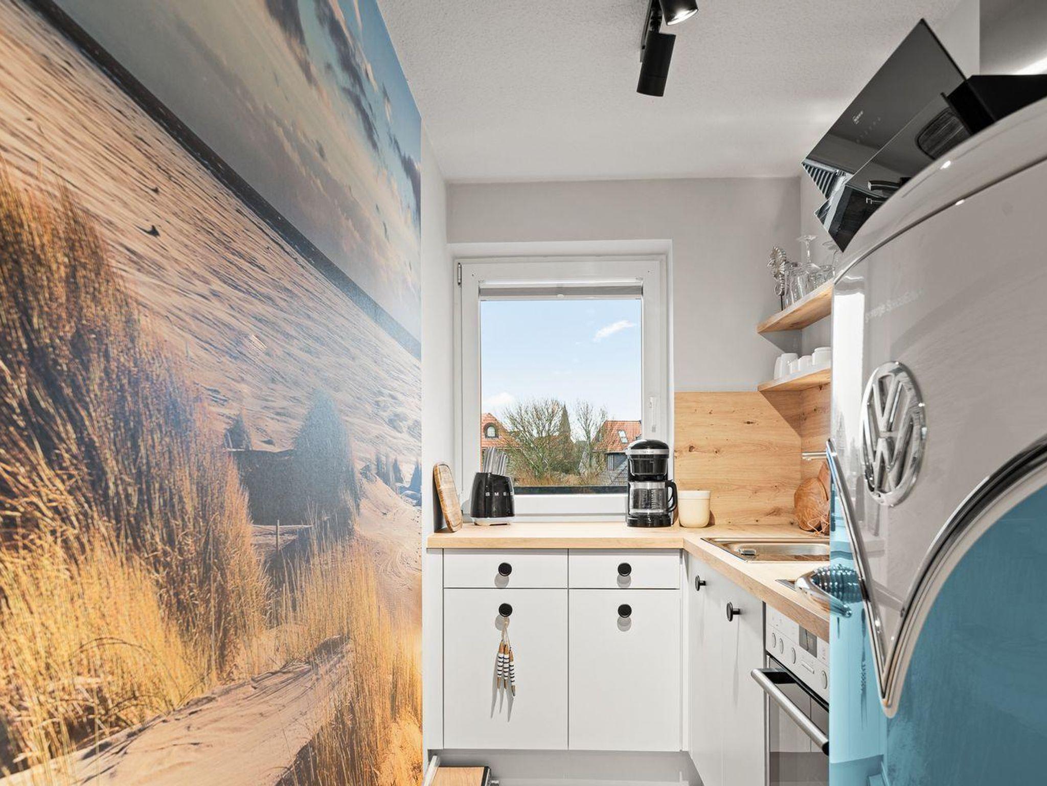 In dieser Wohnung können Sie sich zu Zweit wohlfühlen und am Abend bei einem Glas Wein die Sonne hinter dem Deich verschwinden sehen. Die 41 qm große Ferienwohnung bietet Ihnen einen schönen und hellen Wohnbereich mit einem Boxspringbett. Des weiteren ist ein Esstisch mit 2 Stühlen vorhanden. Die Küche der Wohnung ist ausgestattet mit einem 4 Plattenherd mit Backofen, Dunstabzugshaube, Geschirr, Kaffeemaschine, Kochtöpfe, Kühlschrank, Toaster und einem Wasserkocher.