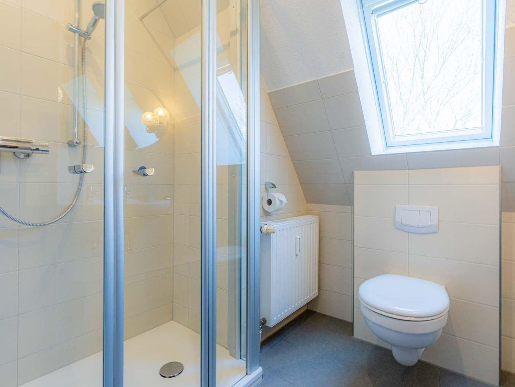 Modernisiertes Badezimmer (Duschbad) mit Dusche (Eintritt: ca. 5 cm), WC, Tageslicht und Föhn.