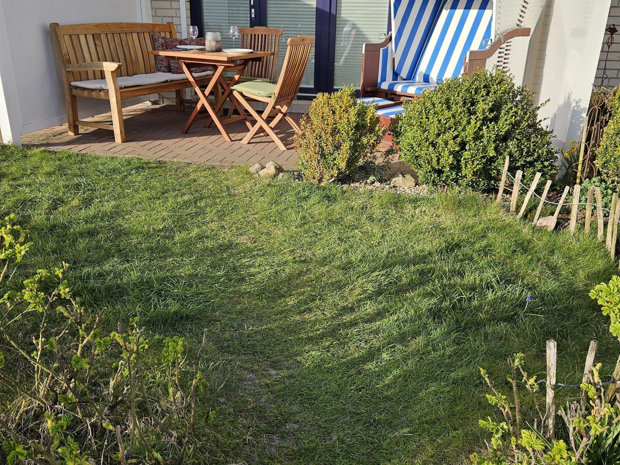 Die Ferienwohnung Bernsteinsucher liegt Parterre und hat eine Südterrasse mit Strandkorb, Gartenmöbel und angeschlossenem Garten zur privaten Nutzung.