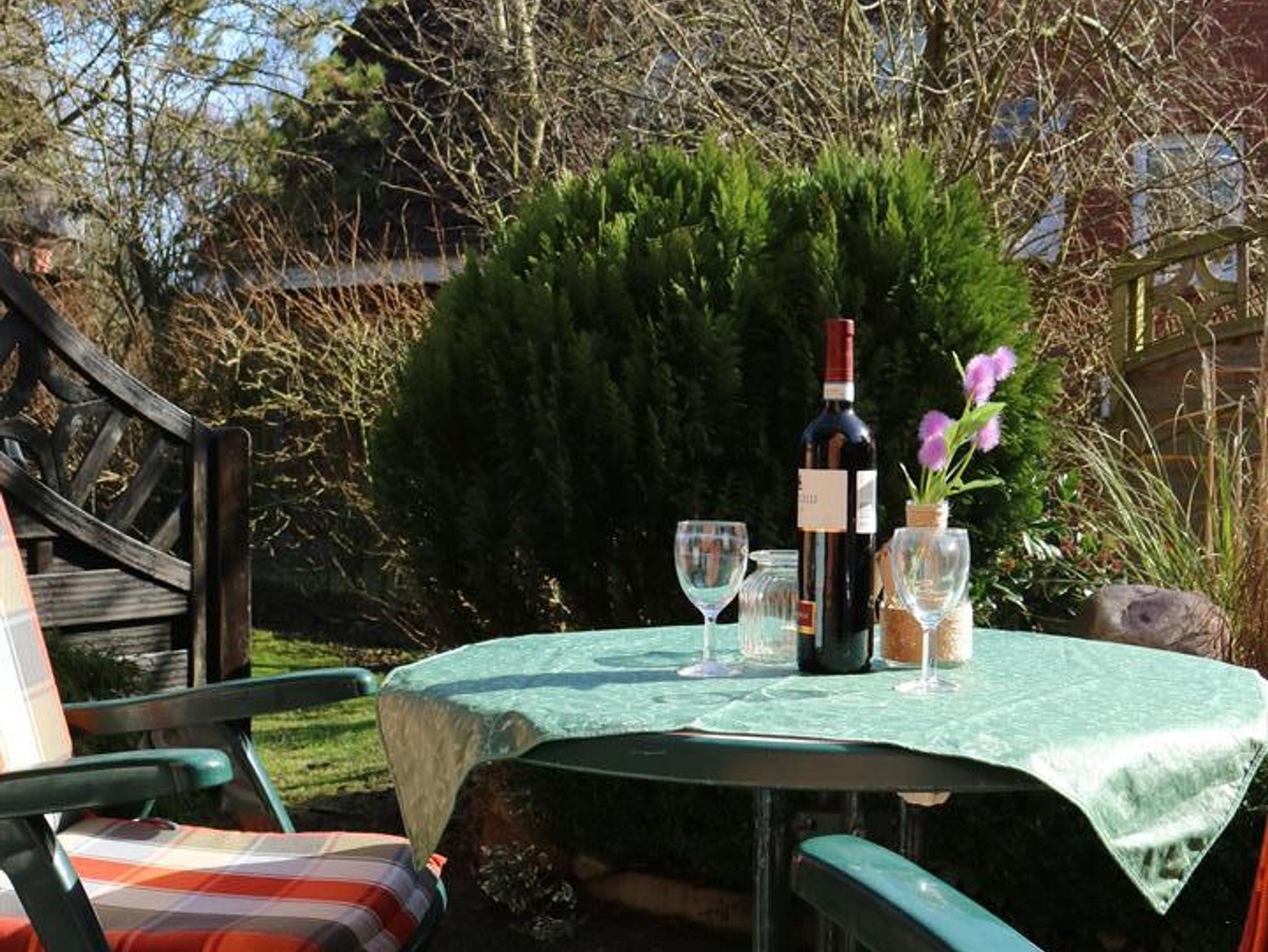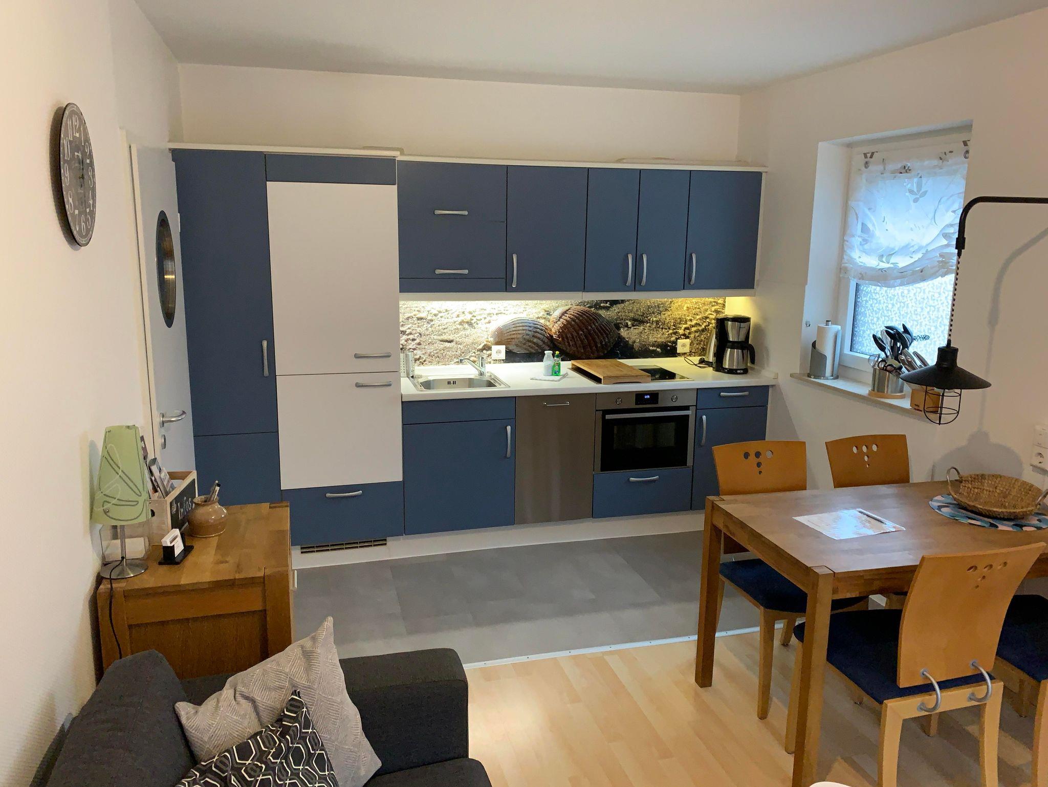 Wir bieten Ihnen eine sehr ansprechende, geschmackvoll eingerichtete Ferienwohnung im Erdgeschoss der kleinen Wohnanlage an. Die Wohnung hat ein Wohn-/Esszimmer mit einer Einbauküchenzeile (4-Platten-Herd, Geschirrspülmaschine und eine Mikrowelle / Backofenkombination (für die Sonntagsbrötchen)), ein Schlafzimmer mit zwei Einzelbetten (die problemlos zusammen geschoben werden können) und einem ebenerdigen Duschbad mit WC (März 2018 renoviert) und Fön. Vom Wohnzimmer gelangen Sie auf eine schöne, windgeschützte Terrasse. Zur Ausstattung gehören SAT-TV, Stereo Anlage und Gartenmöbel, außerdem können Sie gegen Gebühr die Gemeinschaftswaschmaschine und den Trockner nutzen. Abschliessbarer Fahrradabstellraum auf dem Grundstück, Pkw-Stellplatz direkt am Haus.