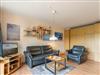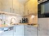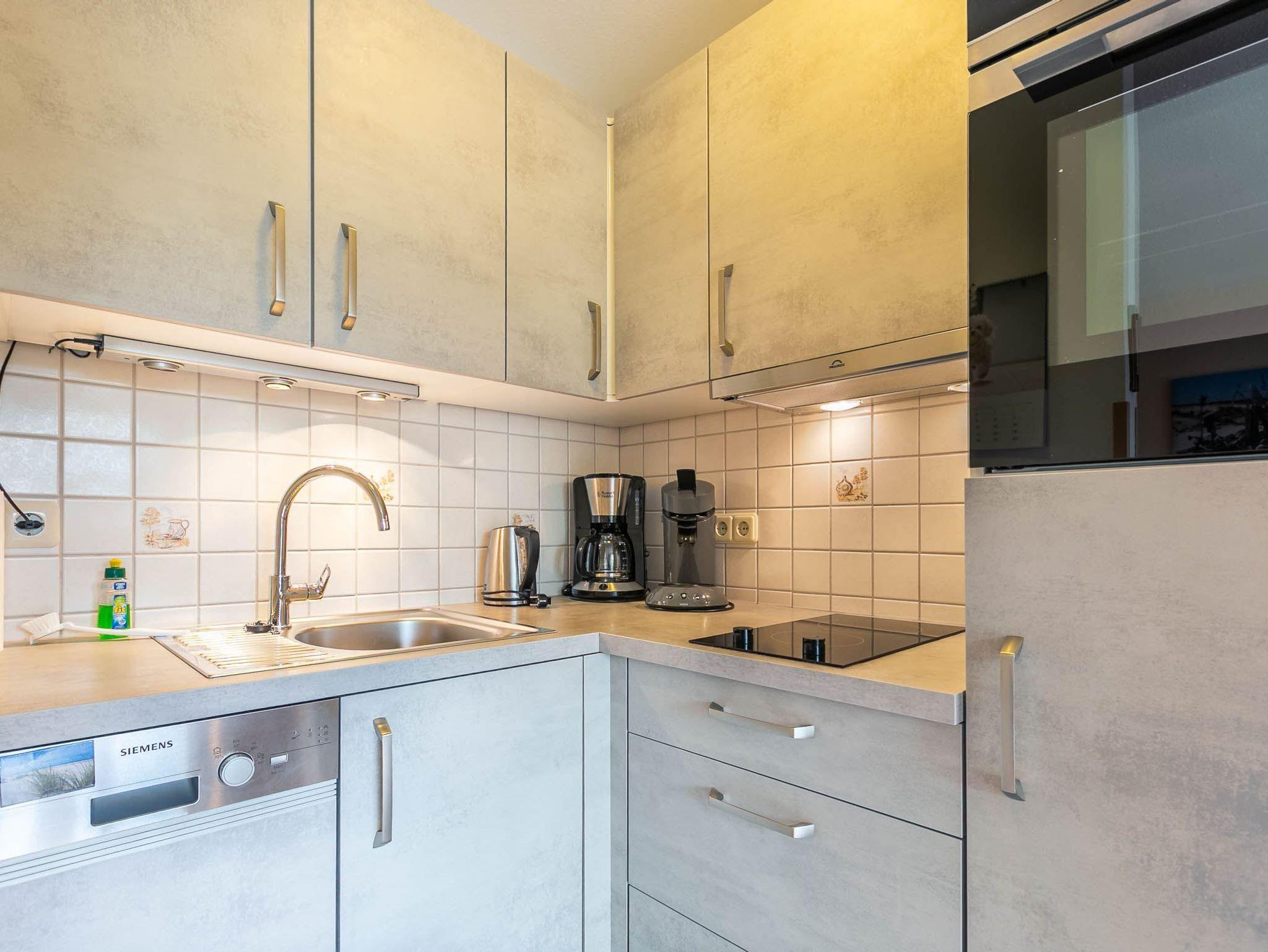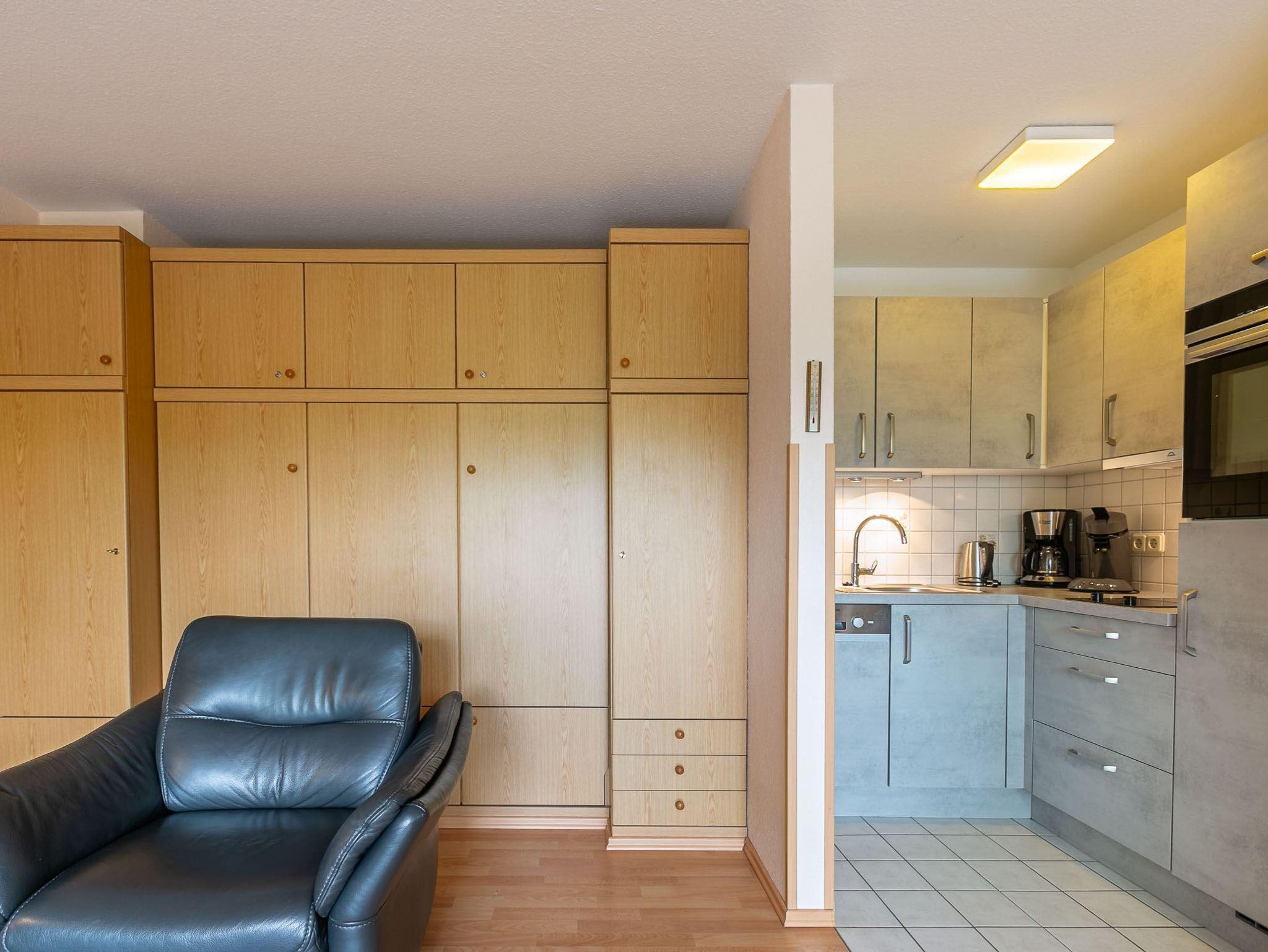Wohnzimmer mit Sofa für 2 bis 3 Personen, 2 Sesseln, TV (Kabel), Radio, Esstisch mit 4 Stühlen und Schrank-Doppelbett (2x 80x200cm). Direkter Zugang zum überdachten Balkon nach Süden mit kleinem Meerblick. Offene Küche mit Backofen, Mikrowelle, Herd mit 2 Ceran-Kochfeldern, Geschirrspüler, Kühlschrank mit Gefrierfach und Philips Senseo Kapsel-Kaffeemaschine.