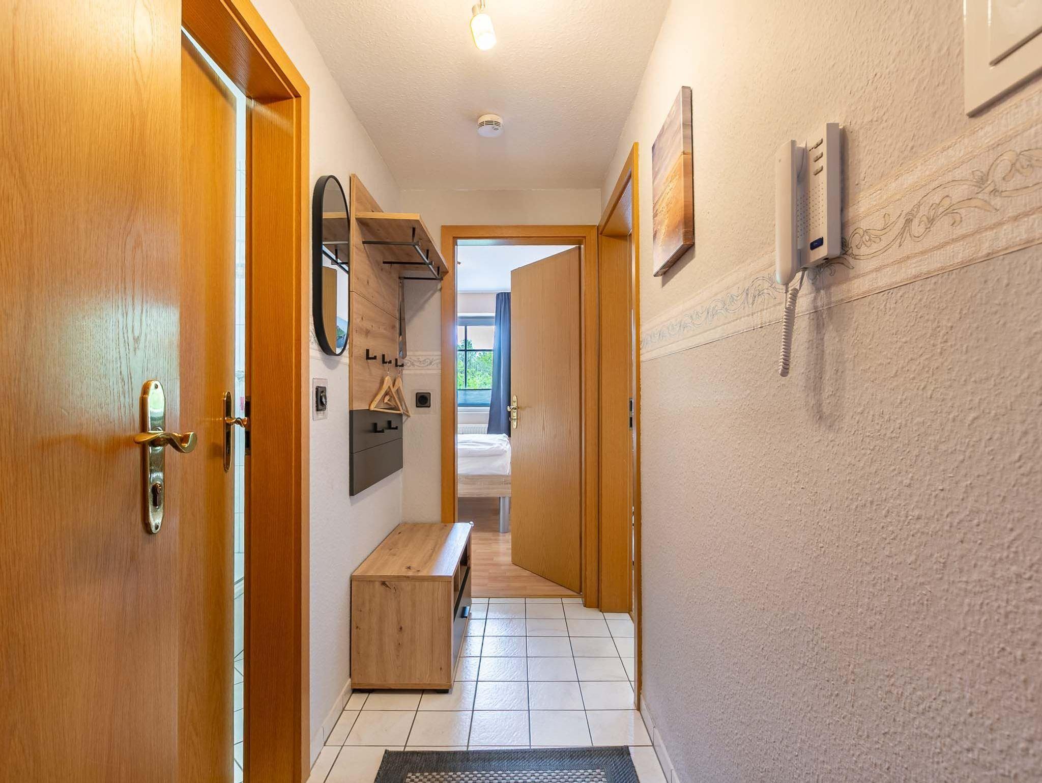 Flur mit Garderobe, Schuhbank und Spiegel im Eingangsbereich.