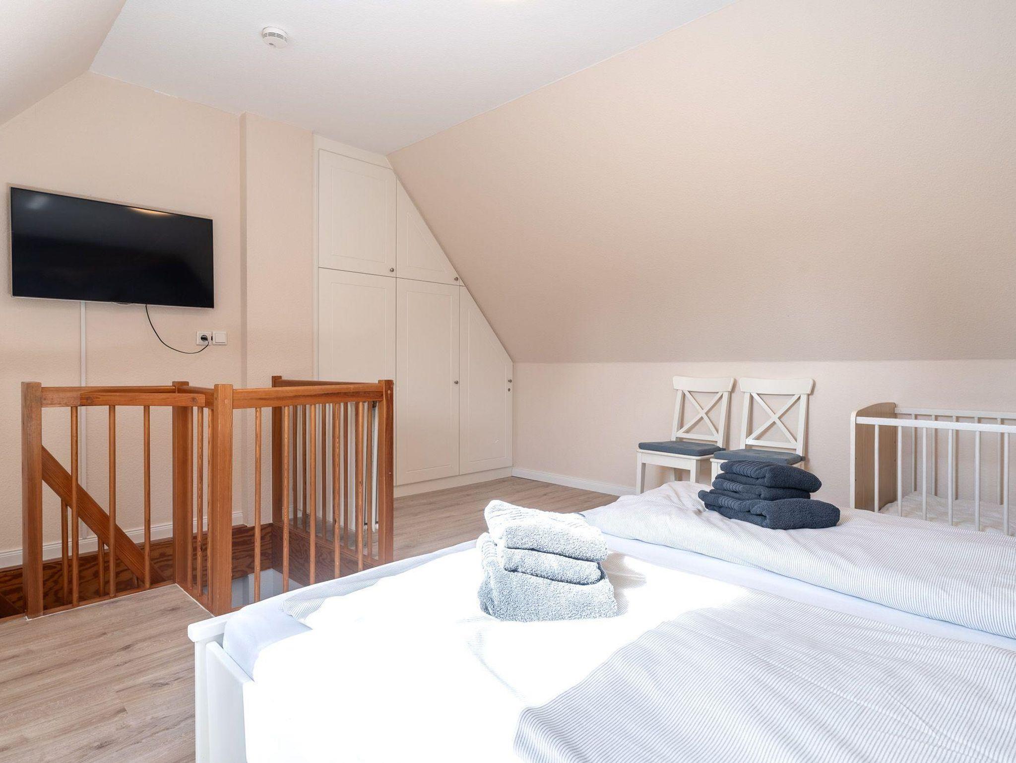 Mit einer Wohnfläche von 60 m², verteilt auf zwei Etagen, bietet die Ferienwohnung Platz für bis zu vier Personen in zwei separaten Schlafzimmern. Treppe in das Dachgeschoß ist relativ steil. Während des letzten Renovierungsjahres 2024 wurde besonderes Augenmerk auf Modernität und Komfort gelegt – angenehm helle Räume mit Design und Laminatfußböden im Wohnzimmer und Schlafzimmer schaffen eine einladende und gepflegte Atmosphäre. Die Ausstattung richtet sich an Familien, Paare und kleine Gruppen gleichermaßen: Kinder und Babys sind ausdrücklich willkommen – ein Babybett steht Ihnen zur Verfügung.