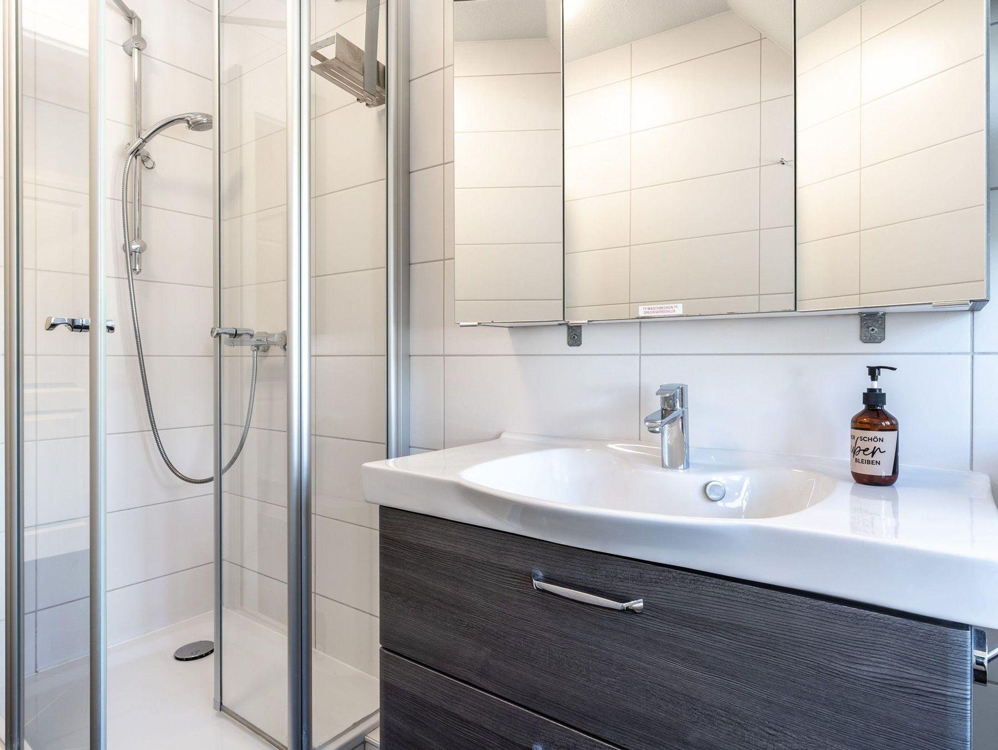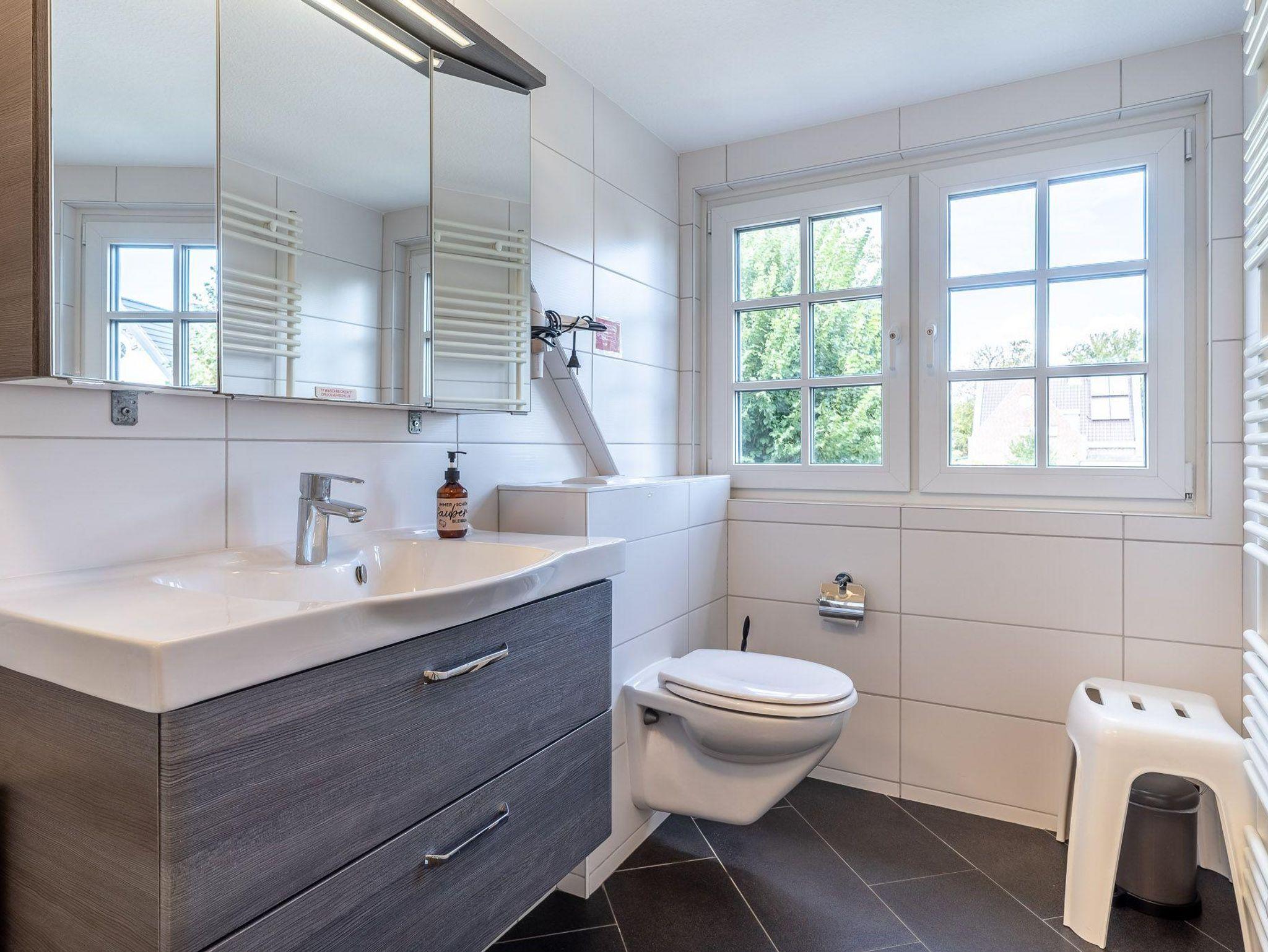 Das modern gestaltete Badezimmer ist mit einer Dusche mit tiefem Einstieg, WC, Waschbecken, Spiegel und Kosmetikspiegel ausgestattet. Ein Haartrockner steht bereit. Für zusätzlichen Komfort finden Sie Bügeleisen, Bügelbrett, Staubsauger und Wäscheständer in der Unterkunft. Sämtliche Fenster sind mit Sichtschutz versehen, zudem ist die Wohnung durch ein Böllerverbot besonders für Familien mit kleinen Kindern geeignet.