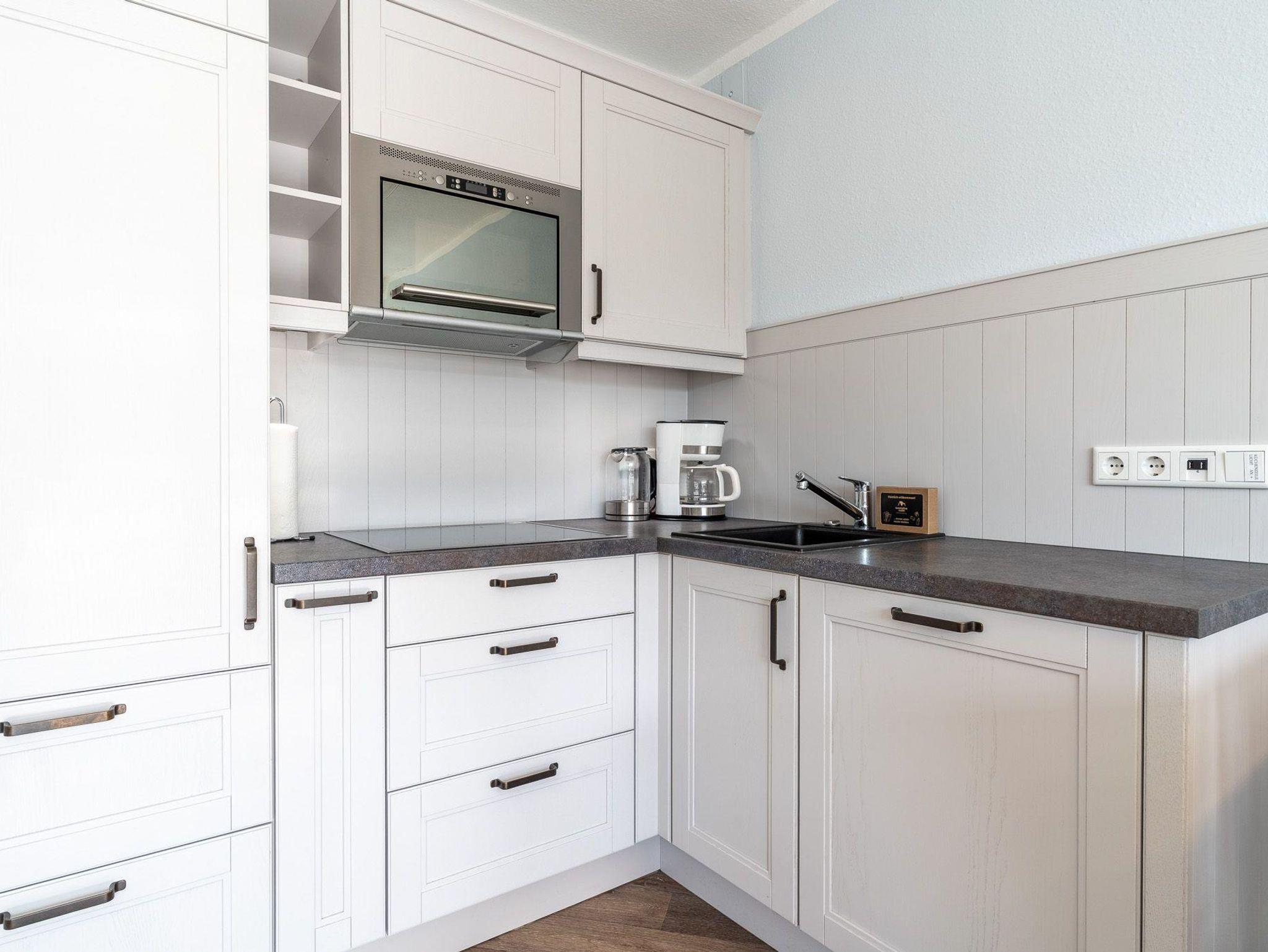 Die offene Küche ist funktional und hochwertig eingerichtet und verbindet sich nahtlos mit dem Wohnzimmer, sodass auch gemeinsames Kochen zu einem geselligen Erlebnis wird. Zur Ausstattung gehören ein Cerankochfeld, ein Backofen mit Elektroanschluss, Kühlschrank mit integriertem Gefrierfach, Spülmaschine, Mikrowelle, Wasserkocher, Toaster und Kaffeemaschine. Selbstverständlich sind Geschirr, Besteck, Küchenutensilien und Geschirrhandtücher vorhanden. Für gesellige Mahlzeiten steht Ihnen ein separater Essbereich mit Esstisch bereit.