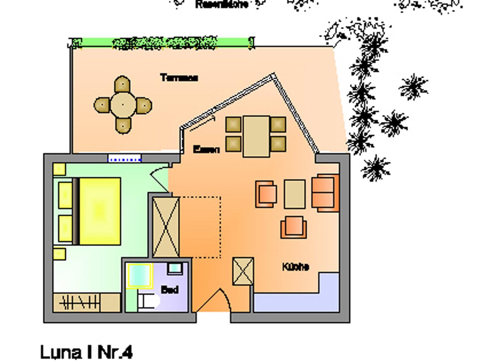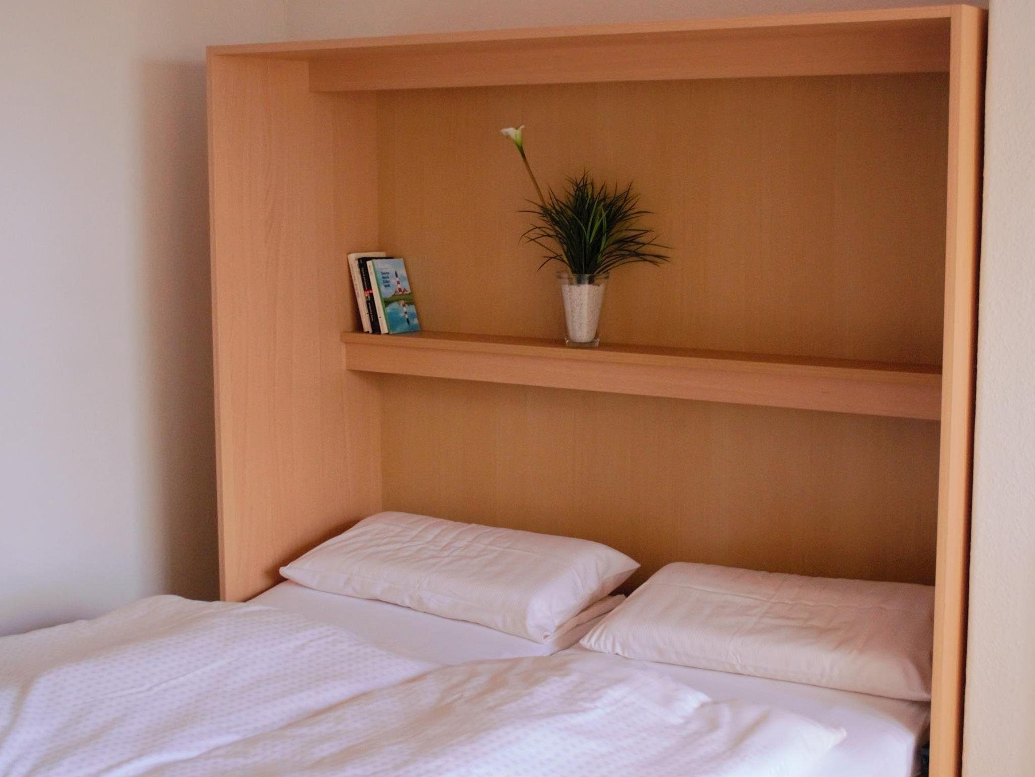 Eingangsbereich mit Garderobe, offener Wohn-und Essraum und integrierter Einbauküche, vorgelagerten Wintergarten mit direktem Zugang zur Terrasse und Garten. Schlafzimmer mit Doppelbett (180x200cm, getrennte Matratzen), zusätzlich ein Schrankbett im Wohnraum (180x200cm, Matratze nicht durchgehend), 1 Duschbad mit WC und Waschbecken. Parkplatz und Fahrradständer